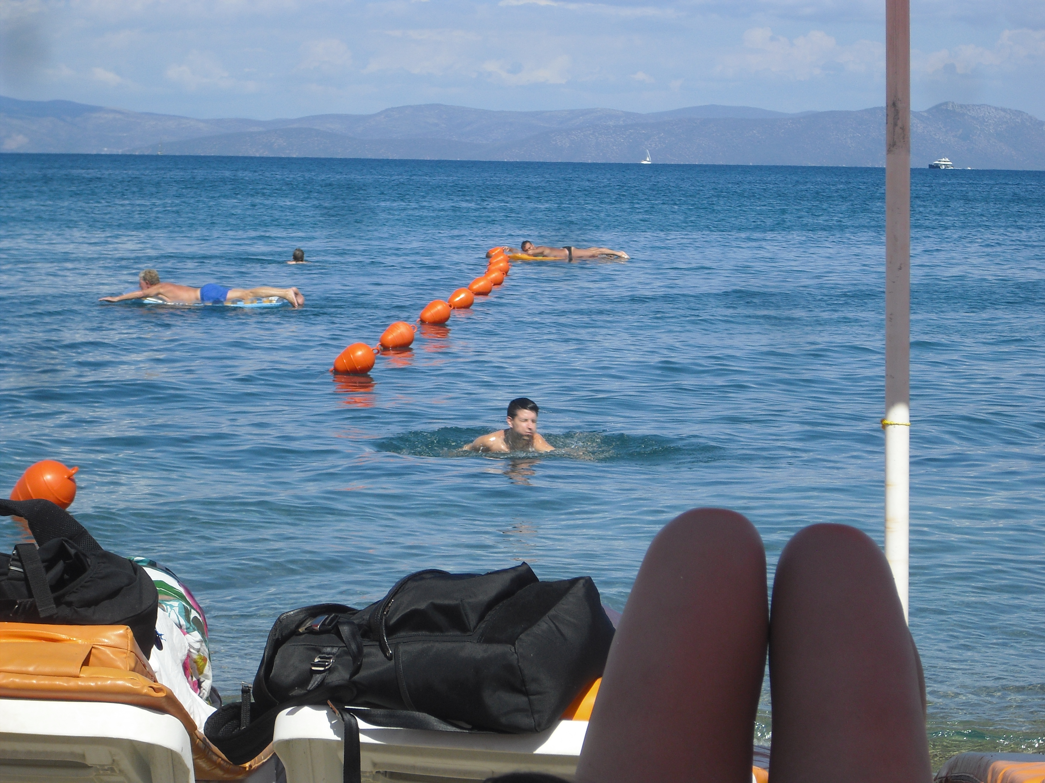 Vatsat täynnä ja kilometrejä käveltyämme shoppailessamme ja nähtävyyksiä katsellessamme seuraava etappi oli heti sataman vierestä alkava pitkä hiekkaranta. Meillä oli vielä pari tuntia aikaa ennen kuin lauttamme lähtisi takaisin Bodrumiin, joten menimme nauttimaan aurinkoisesta säästä ja sulattelemaan lounastamme merenrantaan. Ranta on täynnä eri ravintoloita, joissa voi myös ruokailla, ja ravintoloilla on omat pienet rantakaistaleensa. Ravintolan rantatuolista ei tarvitse maksaa, mutta hyviin tapoihin kuuluu tietysti tilata esimerkiksi juoma siltä ravintolalta kenen rantatuolissa päivää paistattelee. Me valitsimme Jacksons-ravintolan sen rennon huolettoman tunnelman vuoksi. Merta ihaillessa ja juomia siemaillessa pari tuntia kului erittäin rattoisasti ennen paluuta Turkin puolelle.