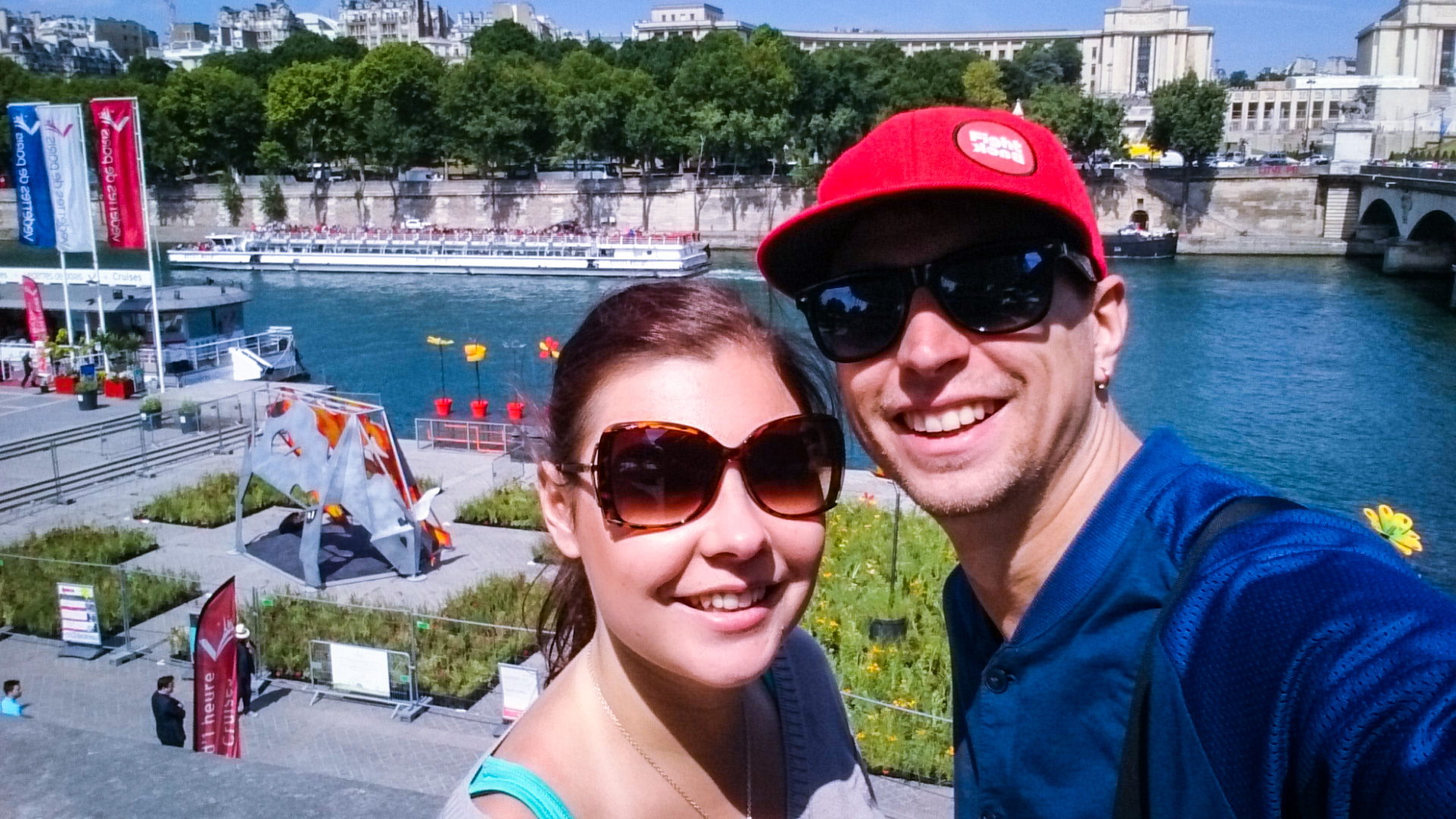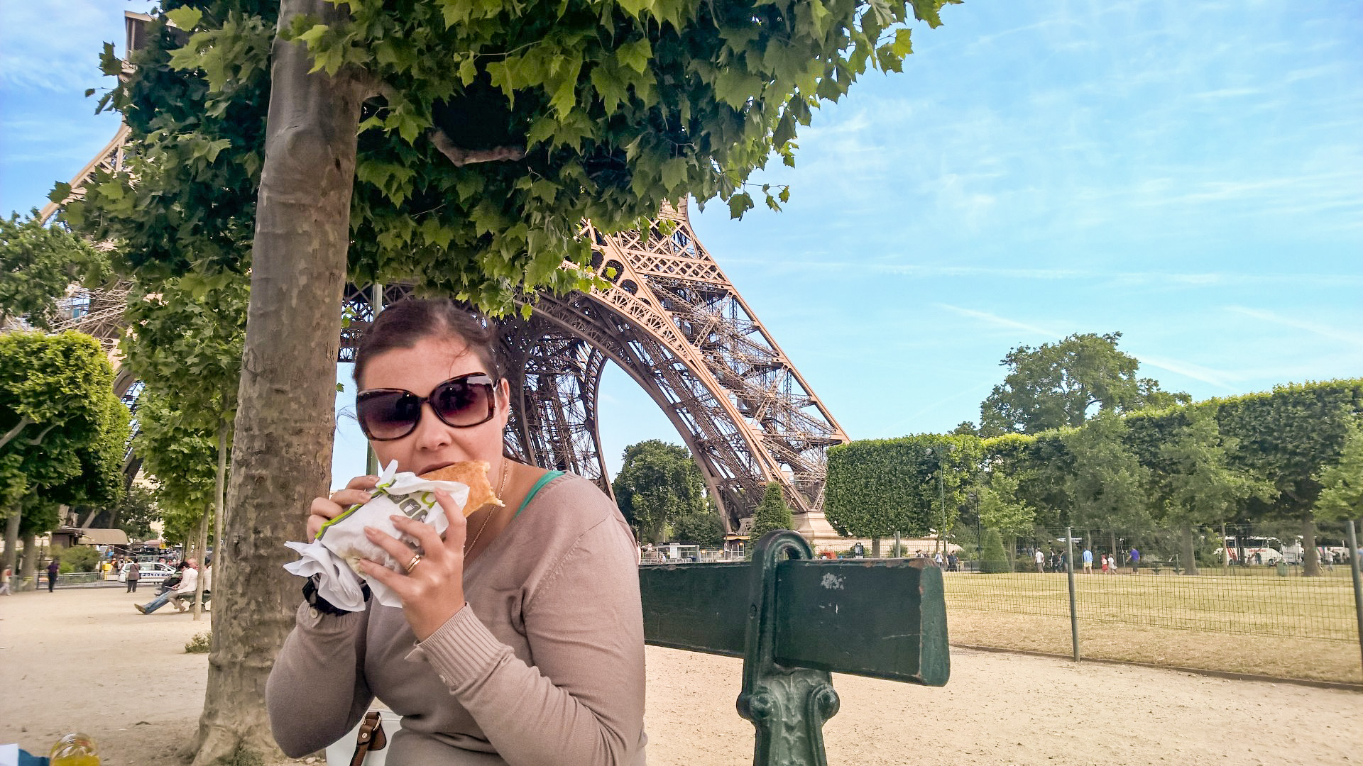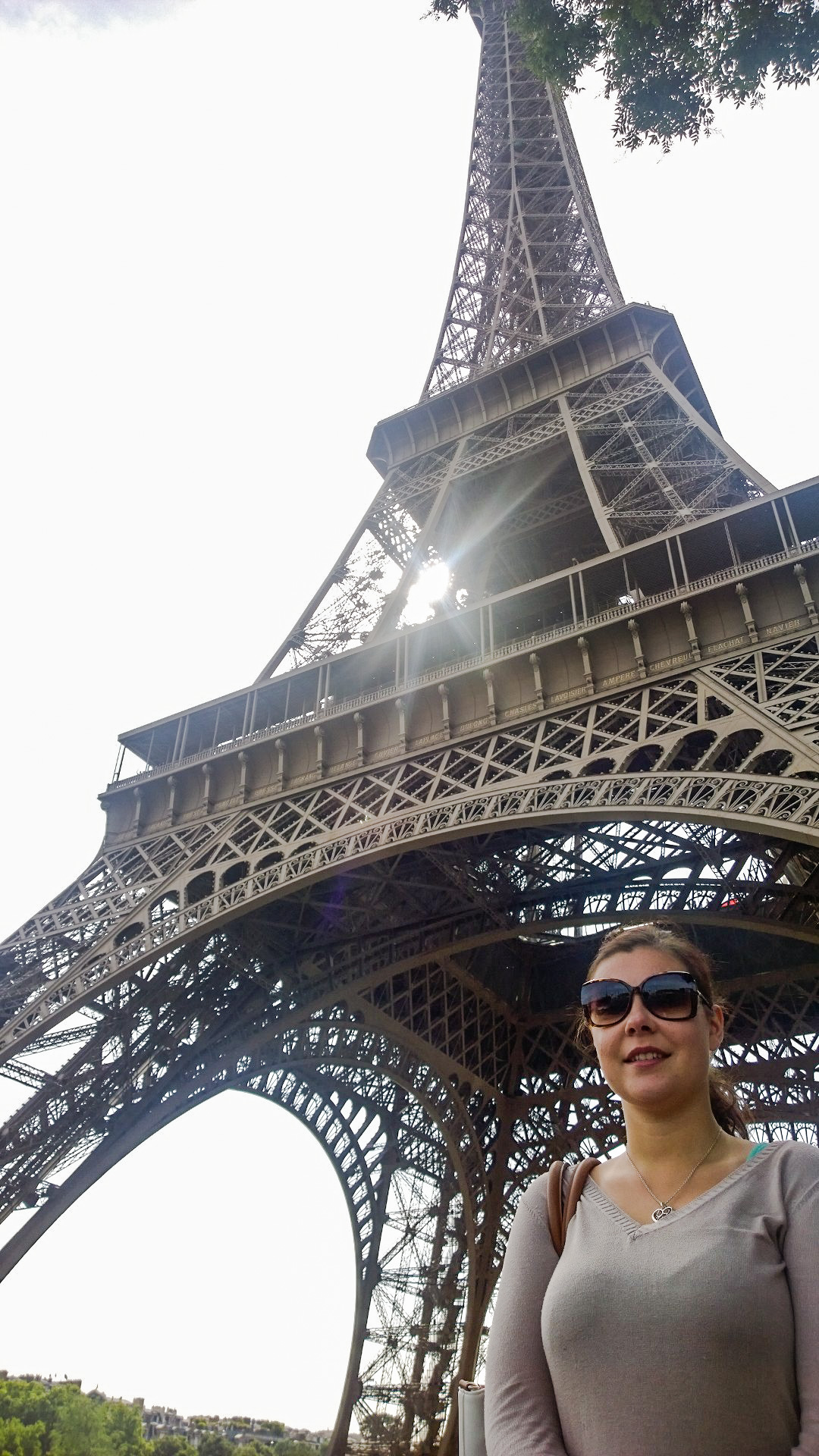 Alun perin ajattelimme, että etsisimme joltakin juna-asemalta säilytyslokeron matkatavaroillemme ja menisimme katsomaan Eiffel-tornia. Bercyn asemalla oli täysin kieliä osaamaton työntekijä infopisteellä, joka ei oikein edes ymmärtänyt mitä häneltä kysyimme, mutta hän sitten opasti meidät Lyonin asemalle, joka oli viiden minuutin metromatkan päässä. Menimme siis sinne seuraavaksi kyselemään säilytyslokeroa. Tältä asemalta löytyi sentään englantia puhuva työntekijä infopisteeltä, mutta hänen mukaansa koko Pariisista ei yhdeltäkään asemalta moisia lokeroita löytyisi. Se siitä unelmasta sitten päästä Eiffel-tornin huipulle tällä reissulla. Toisaalta… Alun perinhän meidän ei pitänyt keretä näkemään Pariisissa mitään, joten parempi olla tyytyväinen siihen, että meillä nyt sentään oli hieman aikaa nähdä edes pintaraapaisu upeasta Pariisista. Menimme siis matkatavaroinemme kuitenkin Eiffel-tornille ja nautimme aamupalaa Eiffel-tornin juurella. Olihan tuo nyt huikea kokemus nähdä torni maastakin käsin vaikka emme huipulle päässeetkään. Kerkesimme myös hetken ihastelemaan Seineä.