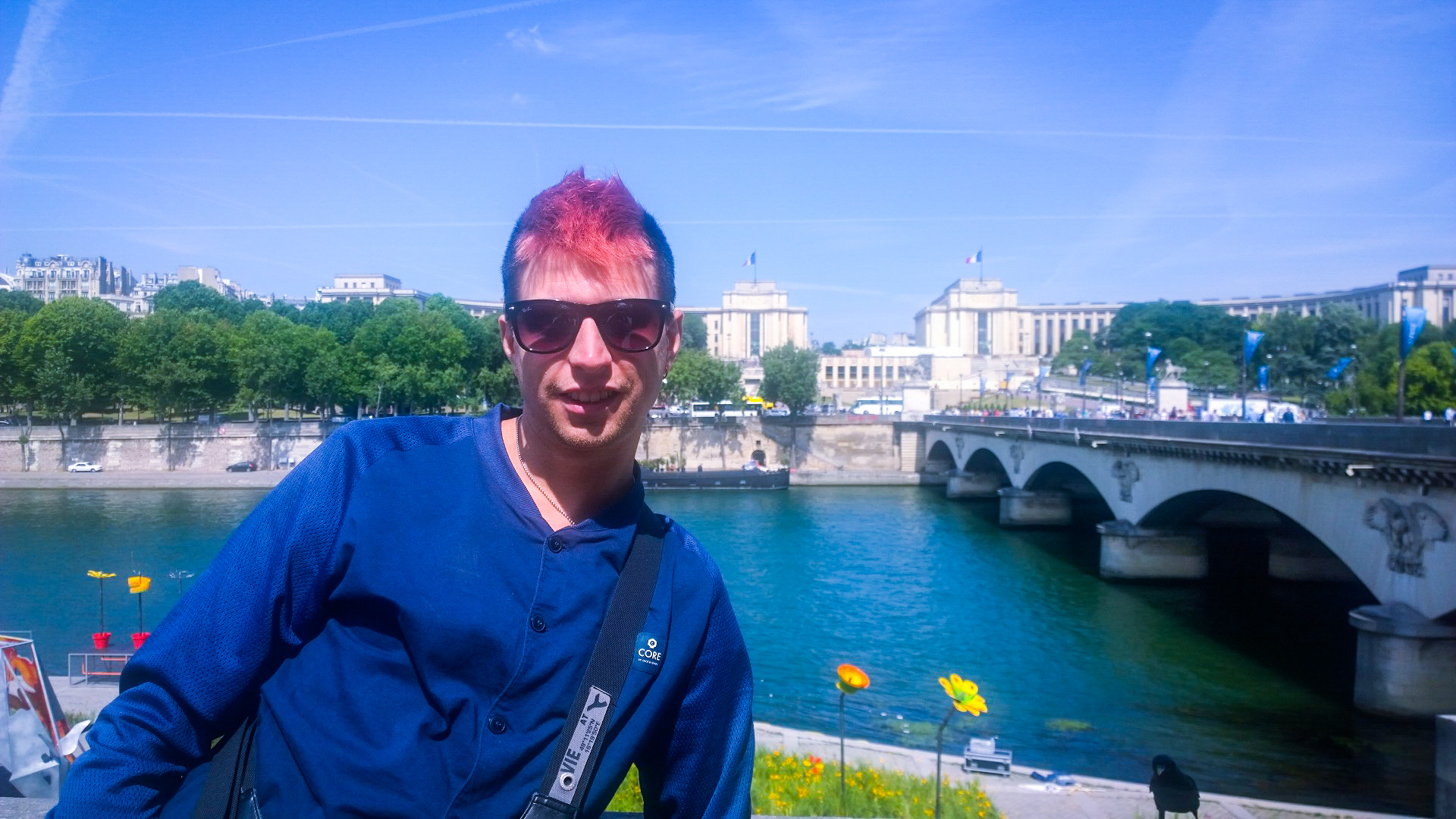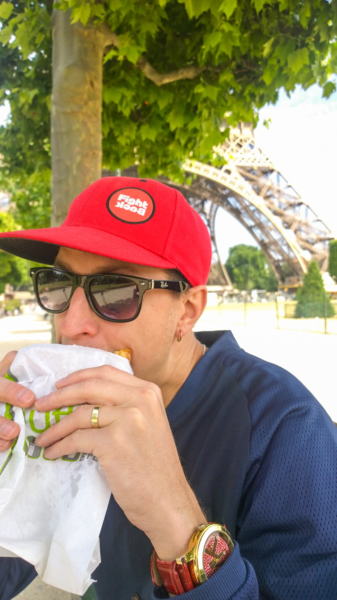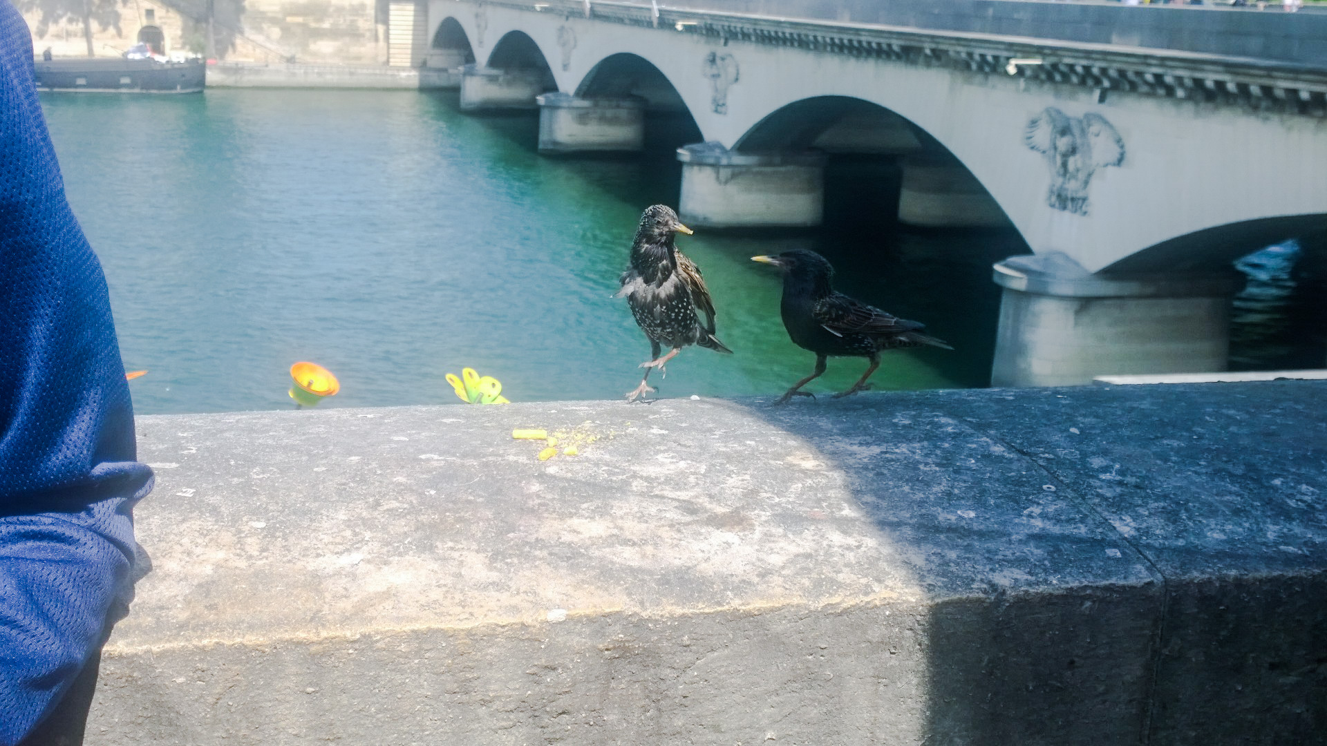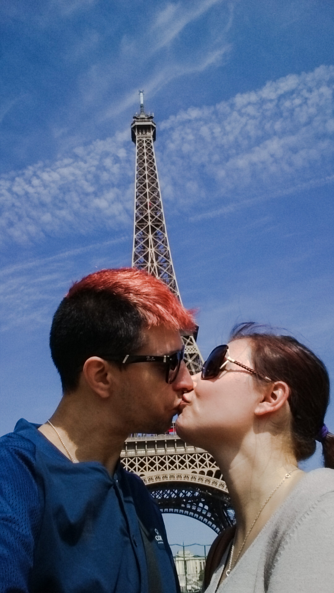 Alun perin ajattelimme, että etsisimme joltakin juna-asemalta säilytyslokeron matkatavaroillemme ja menisimme katsomaan Eiffel-tornia. Bercyn asemalla oli täysin kieliä osaamaton työntekijä infopisteellä, joka ei oikein edes ymmärtänyt mitä häneltä kysyimme, mutta hän sitten opasti meidät Lyonin asemalle, joka oli viiden minuutin metromatkan päässä. Menimme siis sinne seuraavaksi kyselemään säilytyslokeroa. Tältä asemalta löytyi sentään englantia puhuva työntekijä infopisteeltä, mutta hänen mukaansa koko Pariisista ei yhdeltäkään asemalta moisia lokeroita löytyisi. Se siitä unelmasta sitten päästä Eiffel-tornin huipulle tällä reissulla. Toisaalta… Alun perinhän meidän ei pitänyt keretä näkemään Pariisissa mitään, joten parempi olla tyytyväinen siihen, että meillä nyt sentään oli hieman aikaa nähdä edes pintaraapaisu upeasta Pariisista. Menimme siis matkatavaroinemme kuitenkin Eiffel-tornille ja nautimme aamupalaa Eiffel-tornin juurella. Olihan tuo nyt huikea kokemus nähdä torni maastakin käsin vaikka emme huipulle päässeetkään. Kerkesimme myös hetken ihastelemaan Seineä.