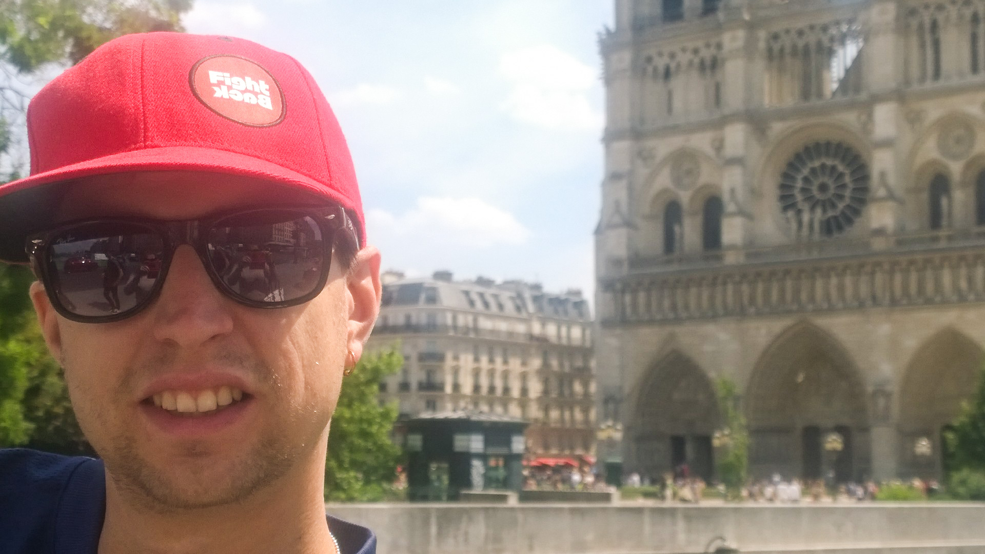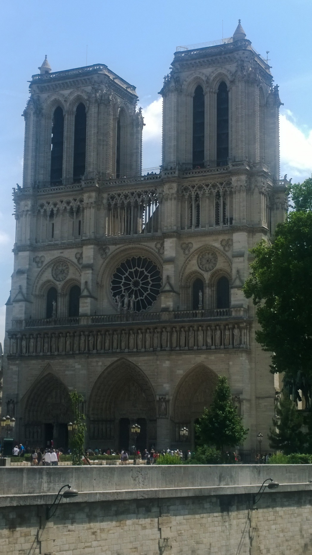 Eiffel-tornilta matkamme jatkui paikallisjunilla kohti lentokenttää. Meidän piti vaihtaa junaa St. Michel Notre Dame –nimisellä asemalla ja tuolla tulikin mieleeni, että noustaanpas vielä käymään maan pinnalla, jos vaikka vahingossa satuttaisiin olemaan Notre Damen katedraalin lähellä ja nähtäisiin siitä edes vilaus. No niinhän siinä kävi, että metrotunnelista nousimme suoraan katedraalin viereen, joten kerkesimme viitisen minuuttia ihastelemaan tuotakin komeaa nähtävyyttä ennen kuin matkamme jatkui lentokentälle.