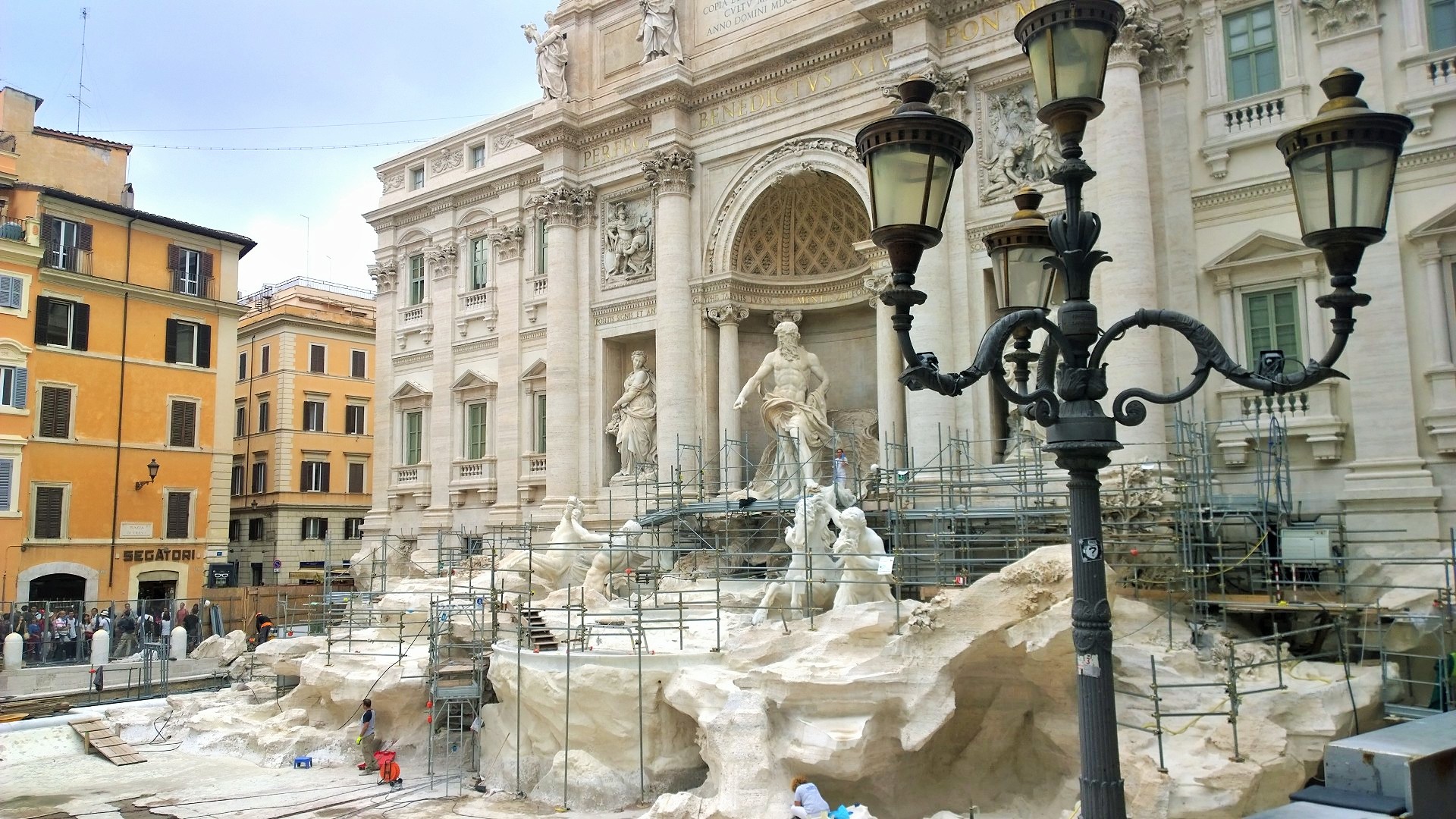 Fontana di Trevi on Rooman suurin ja kuuluisin suihkulähde, johon uskomusten mukaan matkailijan täytyy käydä heittämässä lantti, jotta pääsee Roomaan uudelleenkin. Suihkulähde on valmistunut vuonna 1726. Nyt suihkulähde on täysin remontissa ja alue oli aidattu korkein läpinäkyvin aidoin ja suihkulähde oli tyhjennetty vedestä. Suihkulähdettä peitti myös rakennustelineet ja työmiehet tekivät kunnostustöitä. Täytyy kyllä sanoa, että ihan en tähän suihkulähteestä kerrottuun uskomukseen usko, koska tämä oli toinen kertani Roomassa ja vieläkään en ole päässyt heittämään lanttia suihkulähteeseen. No josko kolmannella vierailulla sitten. Joka tapauksessa suihkulähde on kaunis näky rakennustelineistäkin huolimatta.