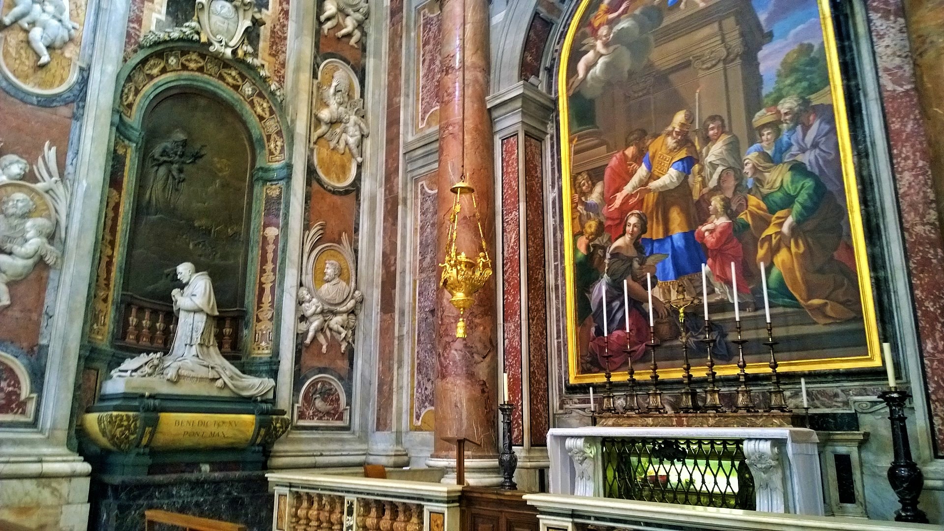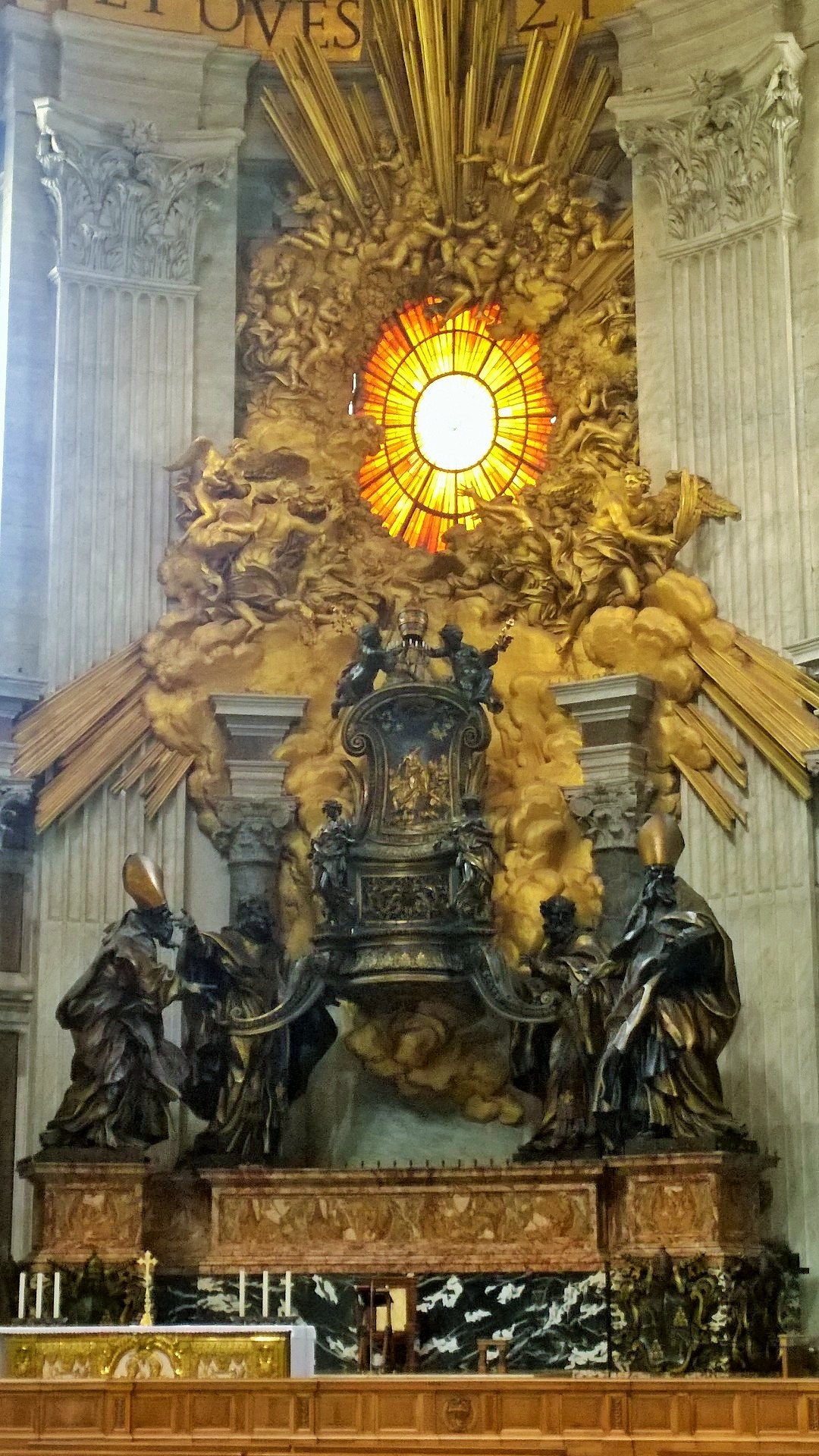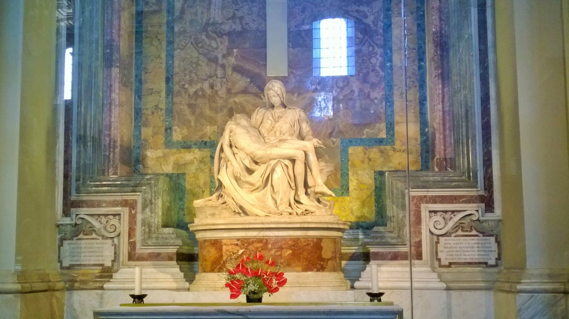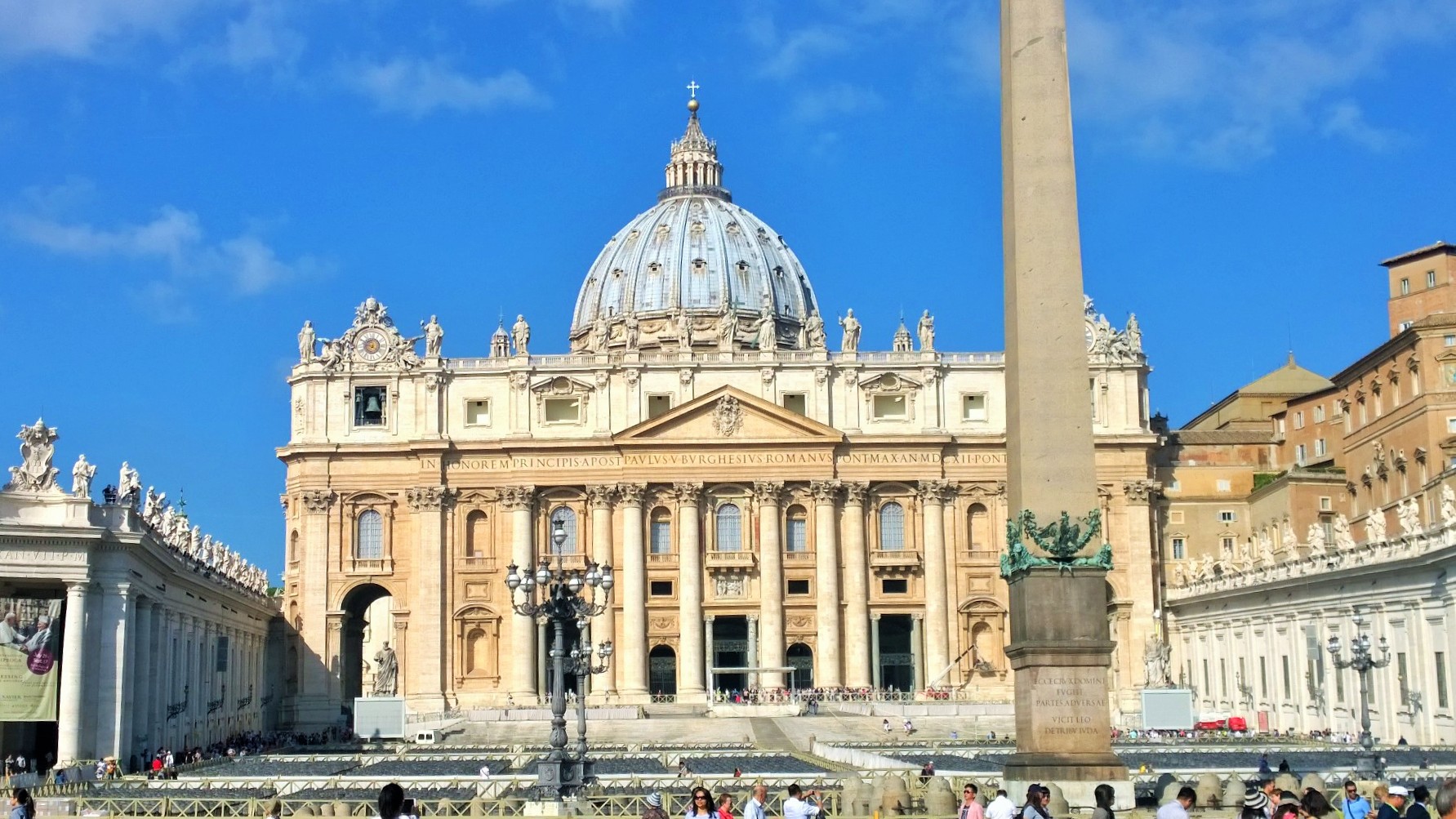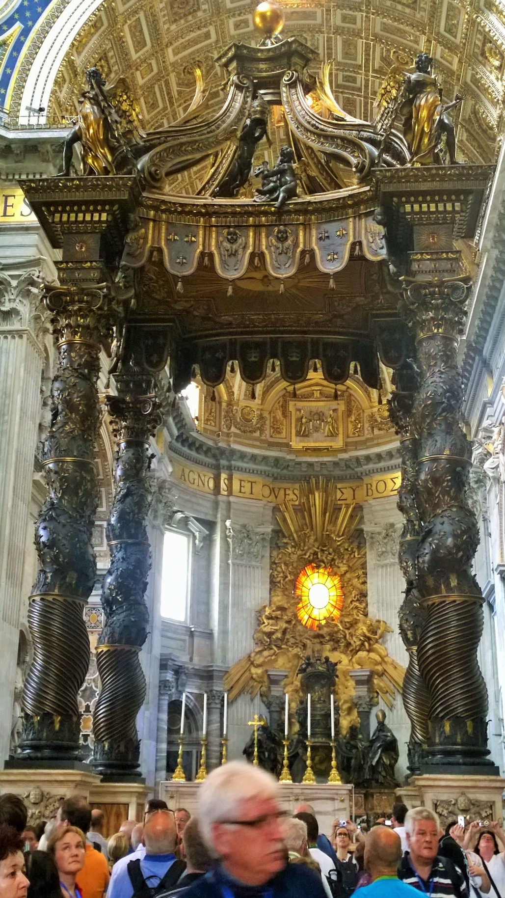 Vatikaaniin suuntasimme heti ensimmäisenä kokonaisena matkapäivänämme katselemaan Pietarinkirkkoa ja Vatikaanin museoita. Tiedossamme oli, että näille nähtävyyksille kannattaa suunnata suoraan aamupalalta mahdollisimman aikaisin, jotta välttäisi tuskaisen jonottamisen. Emme ennättäneet Vatikaaniin kuitenkaan aivan aamuvarhaisella, mutta hyvissä ajoin kuitenkin eli puoli kymmenen maissa aamulla saavuimme Pietarinkirkolle. Tuolloin aukiota kiersi jo aika pitkä jono, mutta ei mikään mahdoton kuitenkaan. Jono myös liikkuu aika vauhdikkaasti eteenpäin, vetäähän kirkko porukkaa sisäänsä sentään noin 60 000 henkilöä kerrallaan ja koska portilla on vain turvatarkastus eikä sisäänpääsymaksuja, niin ihmiset valuvat sisälle tasaiseen tahtiin. Sitä paitsi jonottaessahan on hyvää aikaa ihastella kirkkoa ja kirkon aukiota ulkoa päin. Pietarinkirkon rakennustyöt on aloitettu vuonna 1506 ja 120 vuoden rakentamisen jälkeen kirkko vihittiin käyttöön vuonna 1626. Jonottaessaan kirkkoon voi myös koittaa hahmottaa itselle tätä valtavaa kokonaisuutta, koska esimerkiksi aukiota kiertävän pylväikön päällä olevat 140 pyhimyspatsasta näyttävät silmään lähinnä puutarhatontuilta, vaikka ovat todellisuudessa jokainen noin 3 metriä korkeita. Kirkon julkisivun yläpuolella seisoo 13 patsasta, joista keskimmäinen on Jeesus ja hänen vierellään seisovat Johannes Kastaja ja 11 apostolia. Nämä patsaat ovat noin 6 metriä korkeita. Mittasuhteita auttaa hahmottamaan myös se, että kupolin kohdalla kirkon korkeus on suurin piirtein sama kuin Kheopsin pyramidin ja kirkon pääalttarilla sijaitsevan Pyhän Pietarin valtaistuimen yläpuolella pyhää henkeä symboloivan kyyhkysen siipiväli on 1,75 metriä vaikka se näyttää omaan silmään ruokalautasen kokoiselta. Kirkkoon mennessä kannattaa ottaa huomioon myös katolisen kirkon pukeutumissäännöt. Ovella turvamiehet käännyttävät sellaiset vierailijat pois, jotka eivät ole pukeutuneet uskontoa kunnioittavasti. Tämä tarkoittaa, että polvet ja olkapäät piiloon, niin silloin passaa mennä vierailulle kirkkoon.