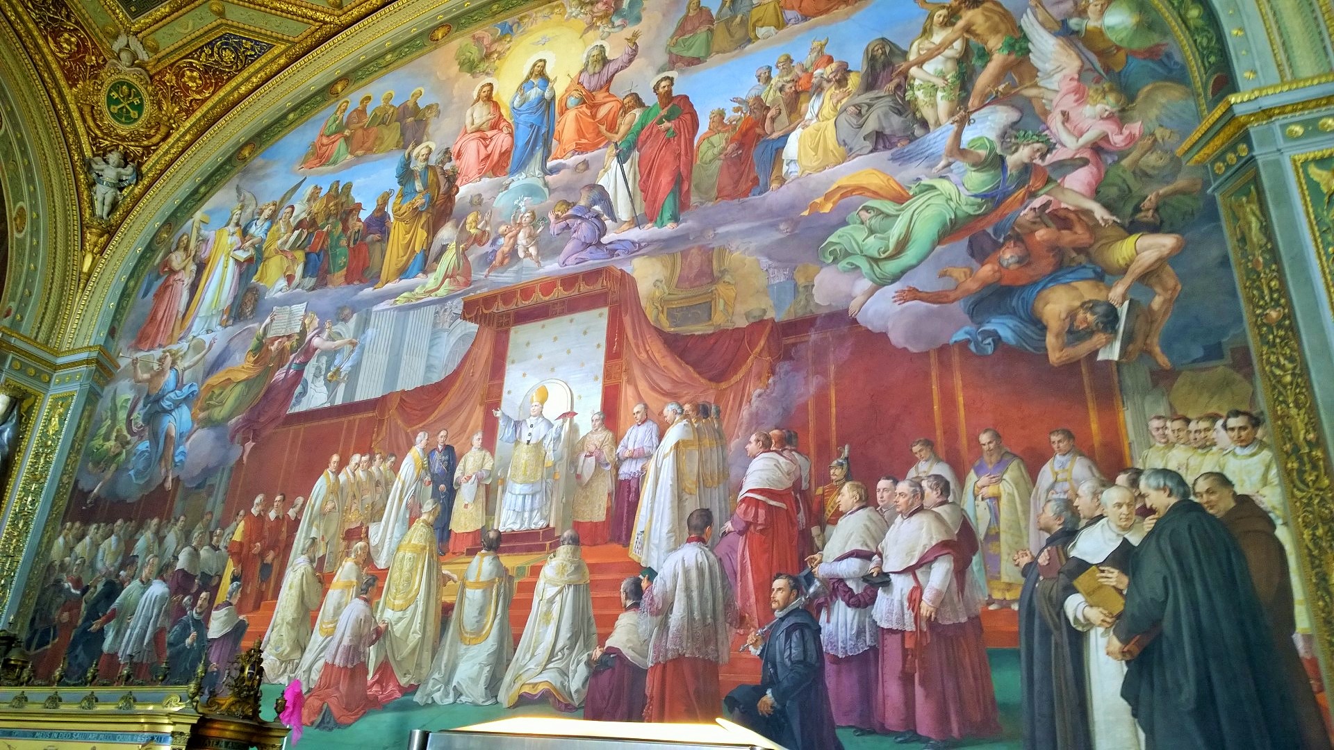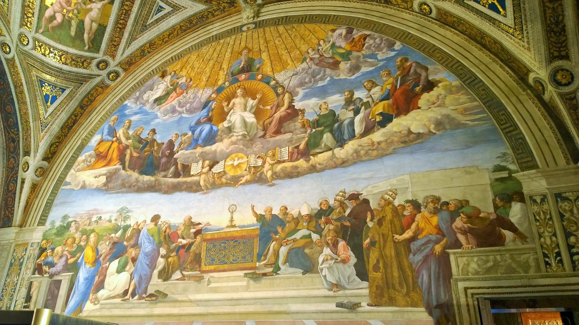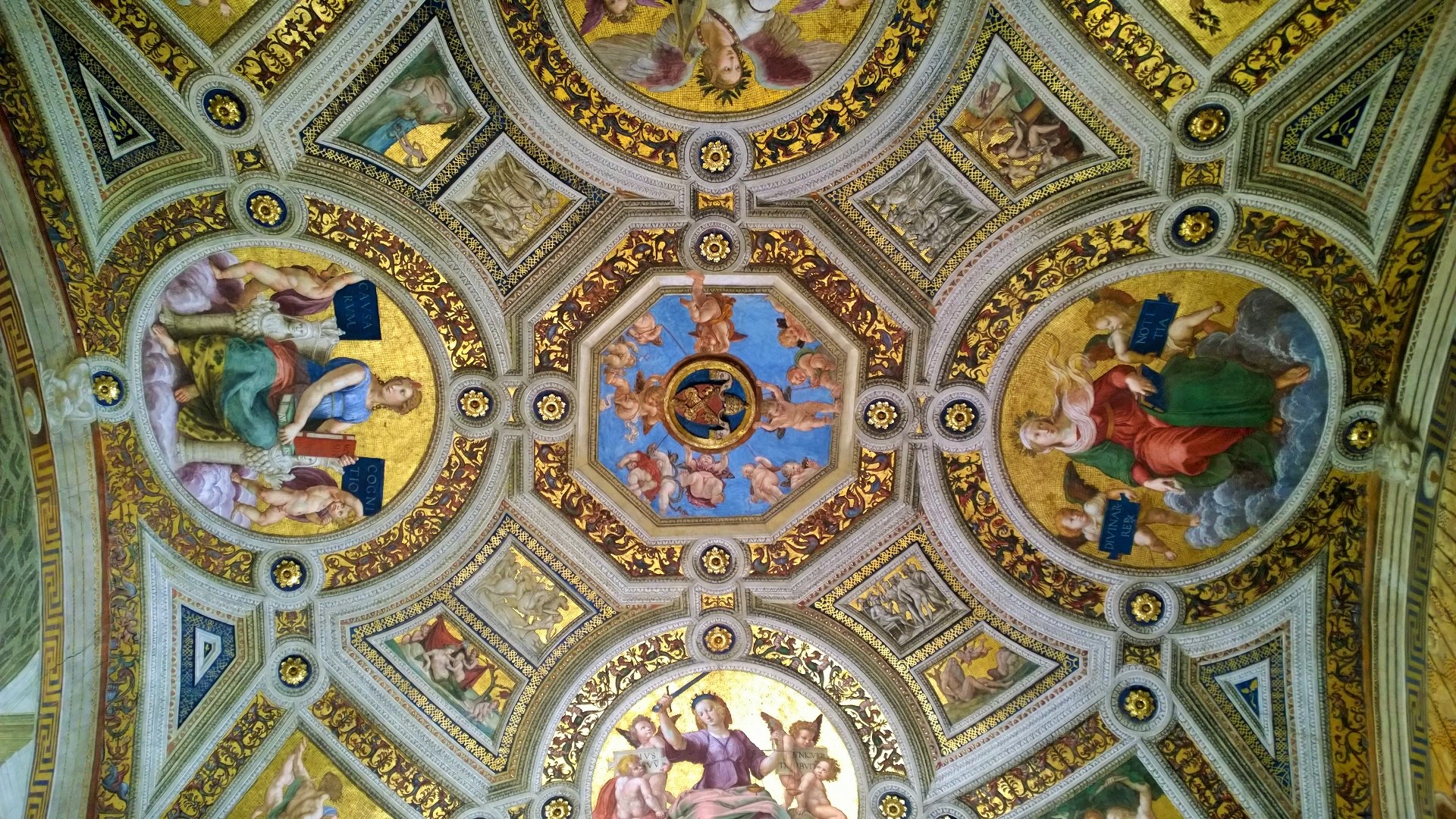 Kun olimme noin tunnin verran kiertäneet kirkossa ja nähneet tarpeeksi, niin poistuimme kirkosta ja siinä vaiheessa totesimme jonon kirkkoon olevan jo tuplaten pidempi kuin silloin, kun me saavuimme jonottamaan. Joten tulipahan todettua, että onneksi oltiin hyvissä ajoin liikkeellä. Pienen välipalan ja juomatauon jälkeen jatkoimmekin sitten matkaa kohti Vatikaanin museoita, joiden museonähtävyyksiä on koottu 1500-luvulta lähtien. Täällä jonottomuus todella yllätti meidät, koska edessämme lippuluukulle oli oikeasti ehkä 8 ihmistä ja pääsimme lähes tulkoon pysähtymättä suoraan kiertelemään museoihin. Vatikaanin museoihin lippu maksoi 16e/aikuinen. Museoissa kiertelimme pari tuntia ja silloinkin kävimme huoneita läpi aika vauhdikkaasti. En todella ihmettele, että jollain asiantuntijalla tai museoista syvemmin kiinnostuneella ei edes yksi päivä museoiden kiertelyyn riittäisi. Nähtävää on todella valtavasti! Meille kohokohta kuitenkin oli Sikstuksen kappeli ja Raffaellon huoneet, jotka olivatkin yhtä vaikuttavat kuin mitä olimme etukäteen kuvitelleet. Poistuessamme Vatikaanin museoista jono museoon olikin venähtänyt satojen metrien mittaiseksi. Taas tuli todettua, että onneksi olimme ajoissa!