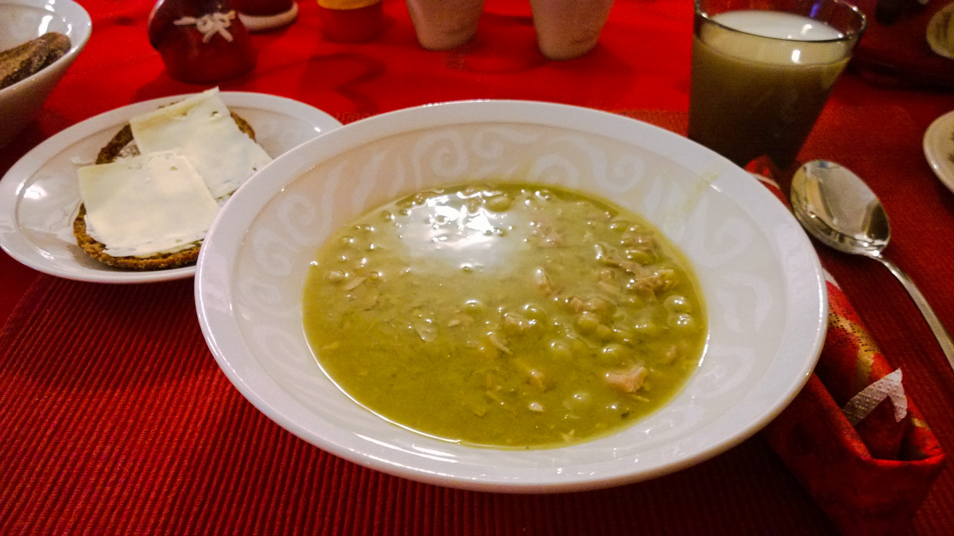 Hernekeiton valmistusta täytyy suunnitella etukäteen sen verran, että kuivatut herneet huuhdotaan ja laitetaan likoamaan runsaaseen veteen edellisenä iltana, jotta seuraavana päivänä pääsee sitten keittämään hernekeittoa liotetuista herneistä. Me käytimme soppaan kotimaisia luomuherneitä, jotka ovat kyllä todella hyvän makuisia. Kun sitten yön yli liottuaan pääsee hernekeiton valmistuksen pariin, niin ensimmäisenä kattilaan laitetaan siivilöidyt herneet, neste, 1,5 lihaliemikuutiota ja sipuli silputtuna. Hernekeittoon nesteeksi voi käyttää pelkästään vettä, mutta mikäli pakkasessa on tallessa lihalientä, niin se sopii käytettäväksi keittoon erinomaisesti ja tuo hyvää makua. Meillä esimerkiksi oli karjalanpaistista ylijäänyttä lientä pari desiä pakastettuna tallessa, joten heitimme sen myös keiton sekaan tuomaan makua. Keittoa keitetään ensin kolmisen tuntia, minkä jälkeen sinne lisätään pilkottua kinkkua, meiramia, mustapippuria, sinappia ja suolaa. Tarkista maku ja mausta tarvittaessa lisää omaan makuusi sopivaksi. Tämän jälkeen hernekeiton annetaan jatkaa muhimista levyllä vielä tunti ja sitten ei muuta kuin nauttimaan!