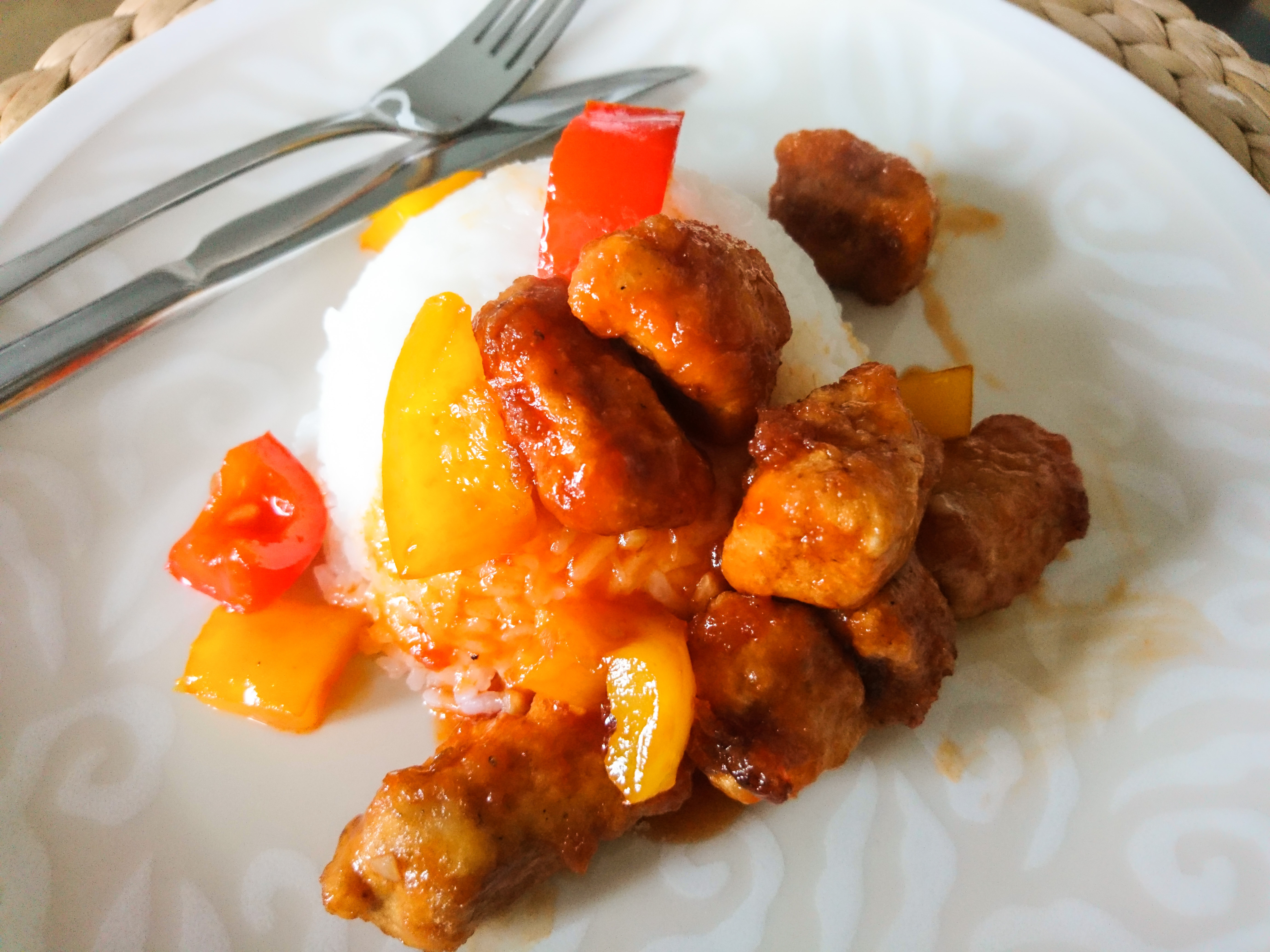 Kuutioi broilerit sopivan kokoisiksi suupaloiksi ja mausta ne suolalla ja pippurilla. Jauhota broileripalat ja pyöräytä lautasella kananmunassa. Paista runsaassa öljyssä kypsäksi. Laita puhtaalle pannulle hieman öljyä ja kuullota siinä silputtu valkosipuli ja kuutioitu paprika. Väriä annokseen tuo jos käyttää eri värisiä paprikoita. Meillä oli esimerkiksi puolikas keltainen ja puolikas punainen paprika. Lisää pannulle valkoviinietikkaa, sokeria, ketsuppia ja soijakastiketta. Sekoita ja kiehauta. Lisää paistetut kanapalat sekaan ja tarjoa lisäkeriisin kera.