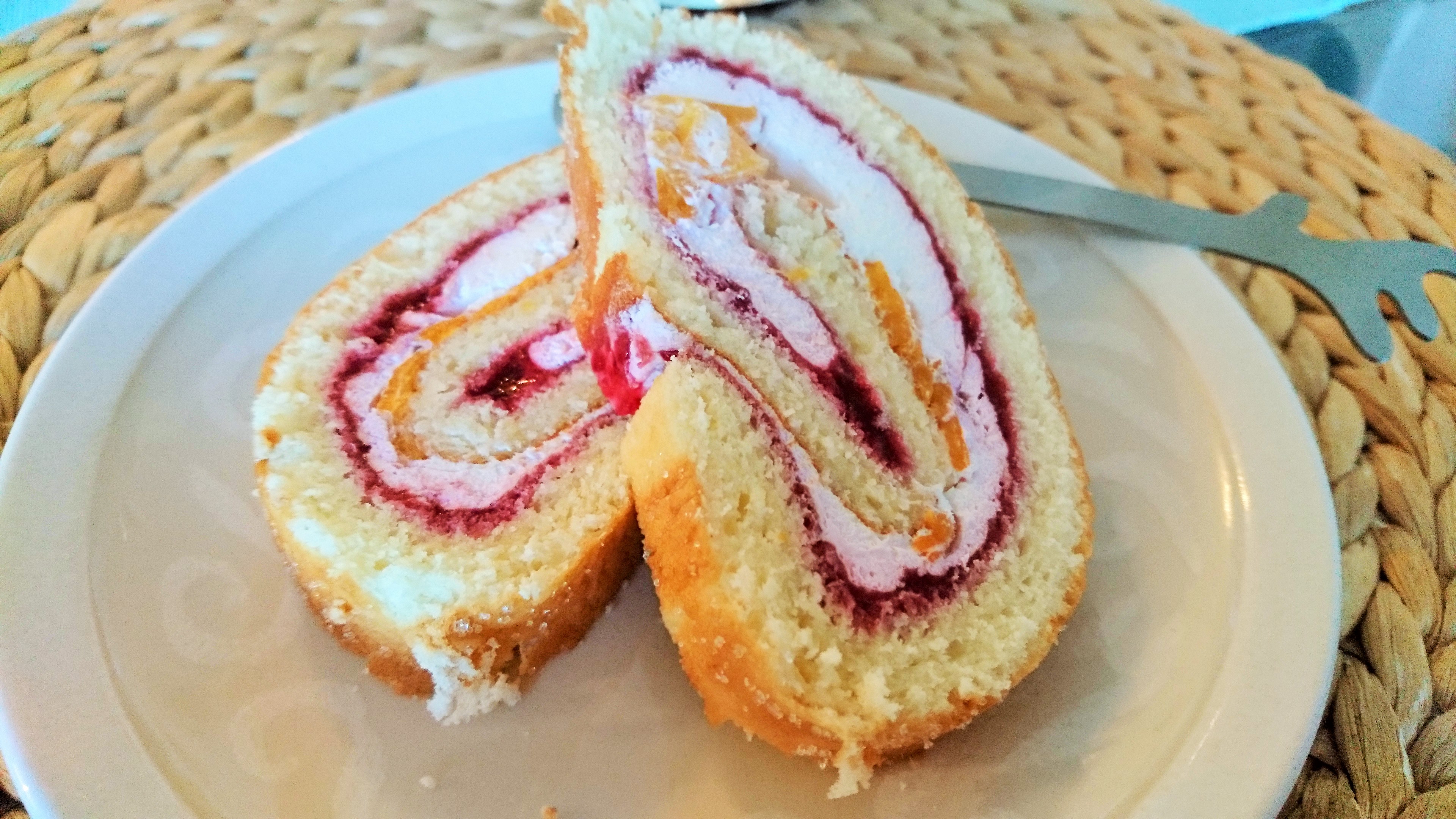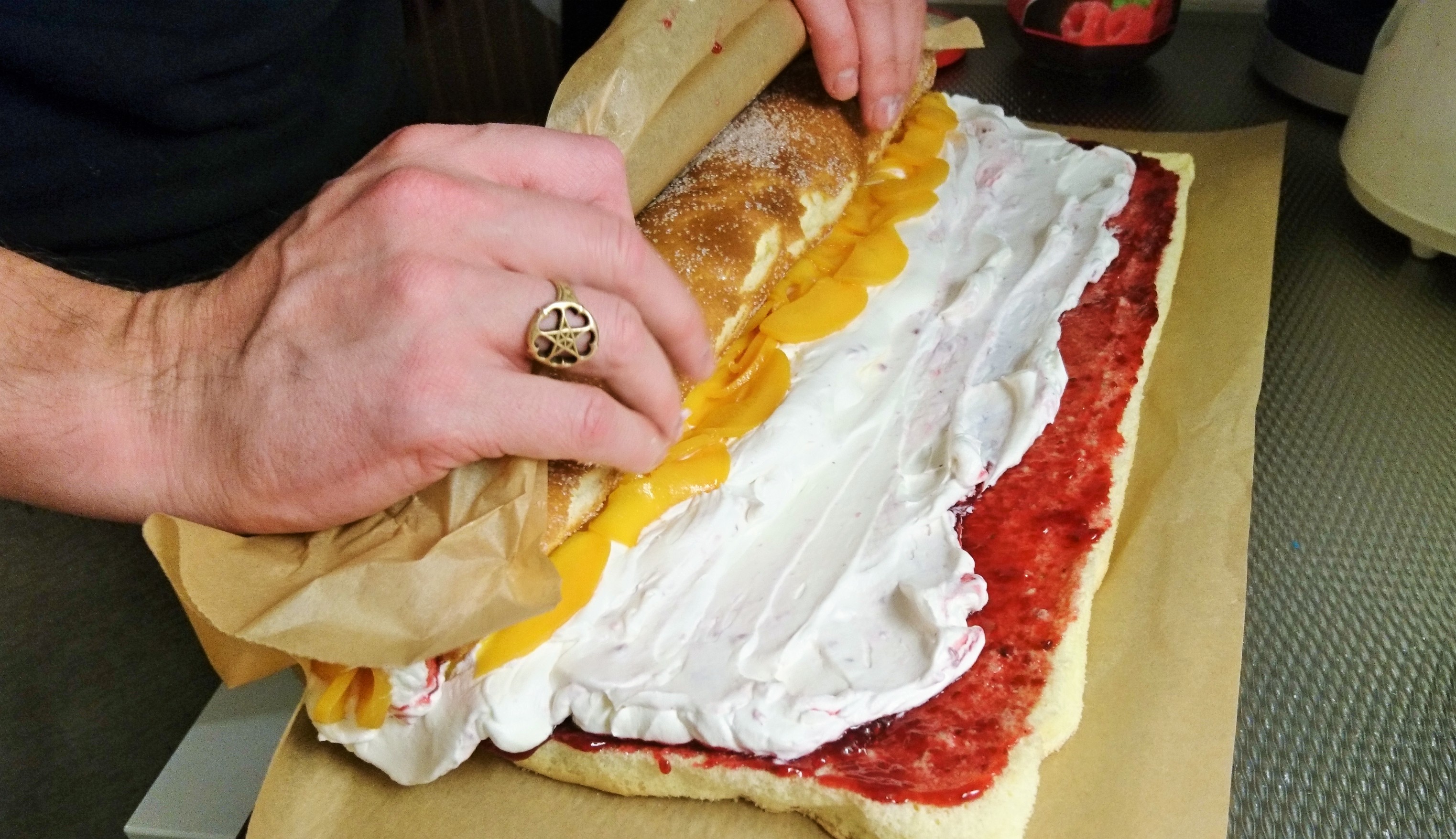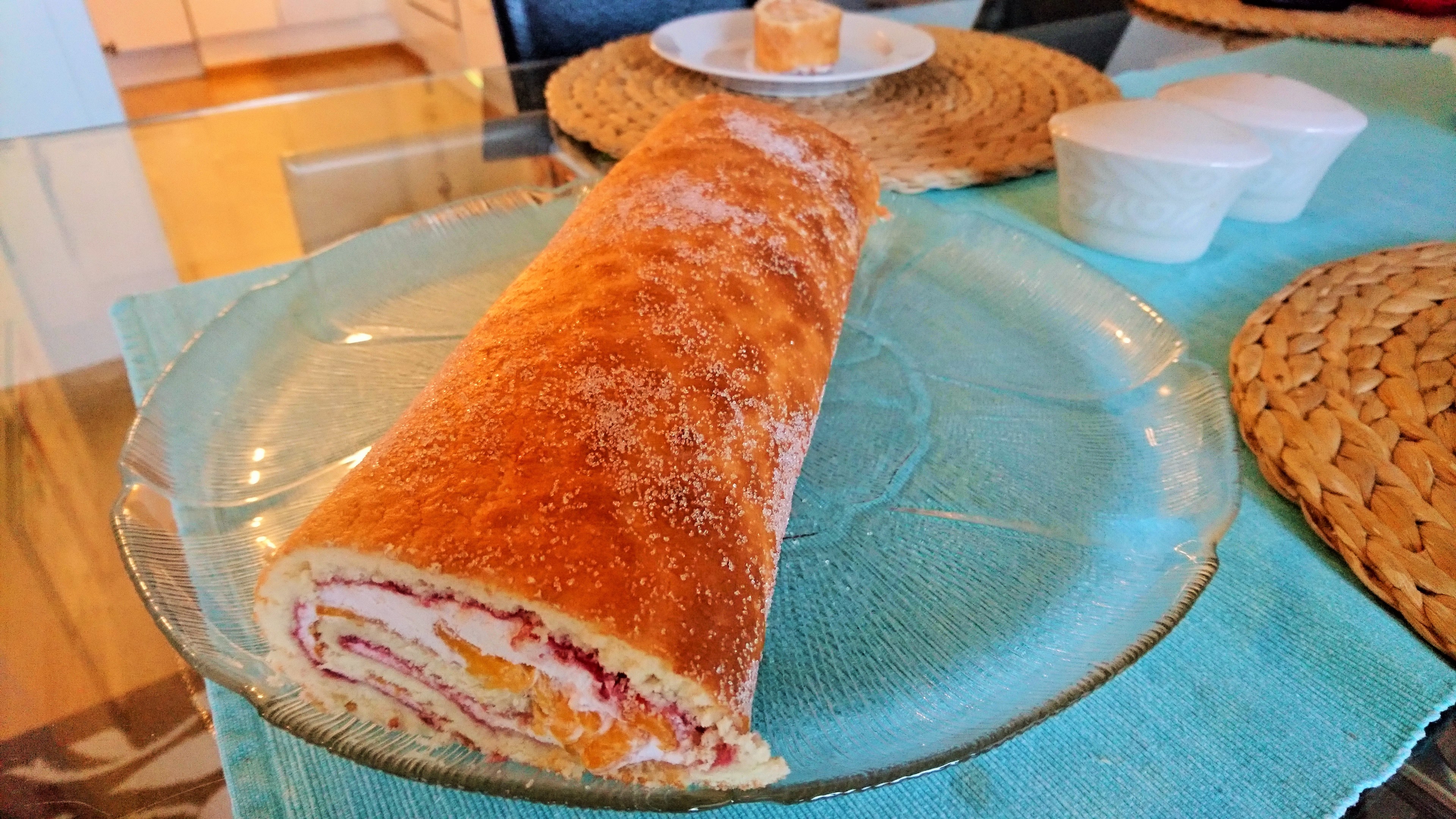 Vatkaa munat ja sokeri vaahdoksi. Sekoita vehnäjauhot, perunajauhot ja leivinjauhe keskenään ja lisää jauhoseos siivilän läpi muna-sokerivaahtoon varovasti kaapimella nostellen. Kumoa taikina leivinpaperilla vuoratulle uunipellille ja levitä tasaisesti. Paista uunin keskitasossa 225 asteessa 6-8 minuuttia. Anna jäähtyä pieni hetki (kymmenisen minuuttia) ja kumoa torttupohja leivinpaperille, johon on ripoteltu sokeria. Irrota torttupohjan pohjasta leivinpaperi ja anna torttupohjan jäähtyä kunnolla. Vatkaa kerma kovaksi vaahdoksi ja mausta mielesi mukaan esimerkiksi sokerilla ja vaniljasokerilla sopivan makeaksi. Siivuta persikan puolikkaat mahdollisimman ohuiksi siivuiksi. Levitä torttupohjalle vadelmahilloa, kermavaahtoa ja persikanpuolikkaat. Jätä hieman tyhjää siihen päähän mihin päin aiot rullata kääretortun, koska täyte työntyy eteenpäin rullauksen aikana, joten tällä vältät sen ettei täytteestä puolet ole pöydällä rullauksen jälkeen. Rullaa torttu kääretortuksi leivinpaperin avulla. Rullan tulee olla tiukka paketti. Rullaa siten, että saumakohta jää tortun alle pöytää vasten. Kääri torttu leivinpaperiin ja laita jääkaappiin vetäytymään ja viilenemään ennen tarjoilua. Kääretortun voi hyvin tehdä jääkaappiin tekeytymään päivää tai paria ennen tarjoilua.