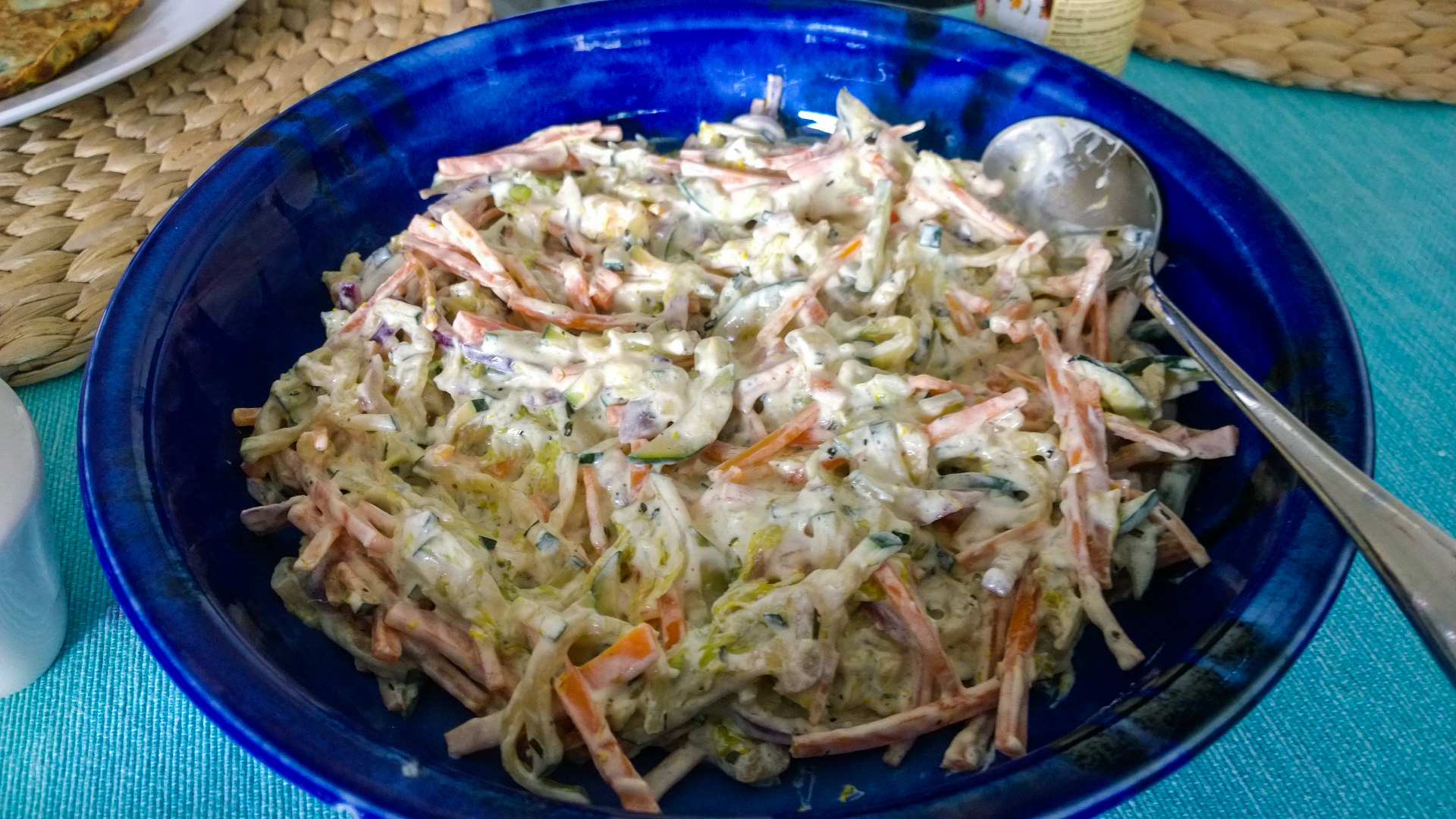 Sekoita kylmäkastikkeen ainekset yhteen ja sekoita kastike sen jälkeen wokattujen kasvisten kanssa yhteen tarjoilukulhossa.