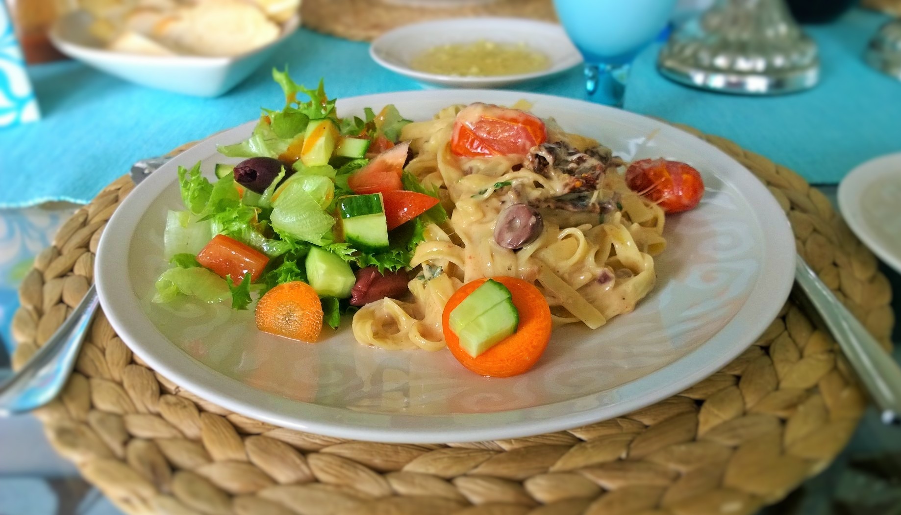 Keitä pasta al denteksi suolalla maustetussa vedessä. Muista keittää tagliatelle väljässä vedessä ja sekoita välillä, jotta pasta on irtonaista. Kuullota isossa pannussa (esim. wok-pannu) margariini-ölyseoksessa silputtu sipuli ja lisää sekaan kirsikkatomaatit. Anna paistua pannulla niin, että tomaatitkin ovat aivan pehmeitä. Lisää sekaan valkosipulisilppu, puolitetut oliivit ja sopivan kokoisiksi paloiksi pilkotut aurinkotomaatit. Anna paistua pieni hetki. Mausta suolalla, mustapippurilla ja Provencen yrttiseoksella. Valmista kulhoon kerma-juustoseos. Sekoita kerma ja keltuainen ja mausta suolalla, mustapippurilla, paprikajauheella ja ripauksella cayennea. Lisää sekaan raastettu juusto. Kun pasta on al dente, ota desi keitinvettä ja lisää se wok-pannuun sipuli-tomaattiseoksen sekaan. Valuta pasta ja lisää se myös wok-pannuun. Lisää wok-pannuun vielä kerma-juustoseos ja tuoretta silputtua timjamia. Sekoita sekaisin juuston sulaessa. Kun juusto on täysin sulanut, on pasta valmis. Tarjoa heti. Raskaan pasta-annoksen seuraksi sopii hyvin raikas salaatti.