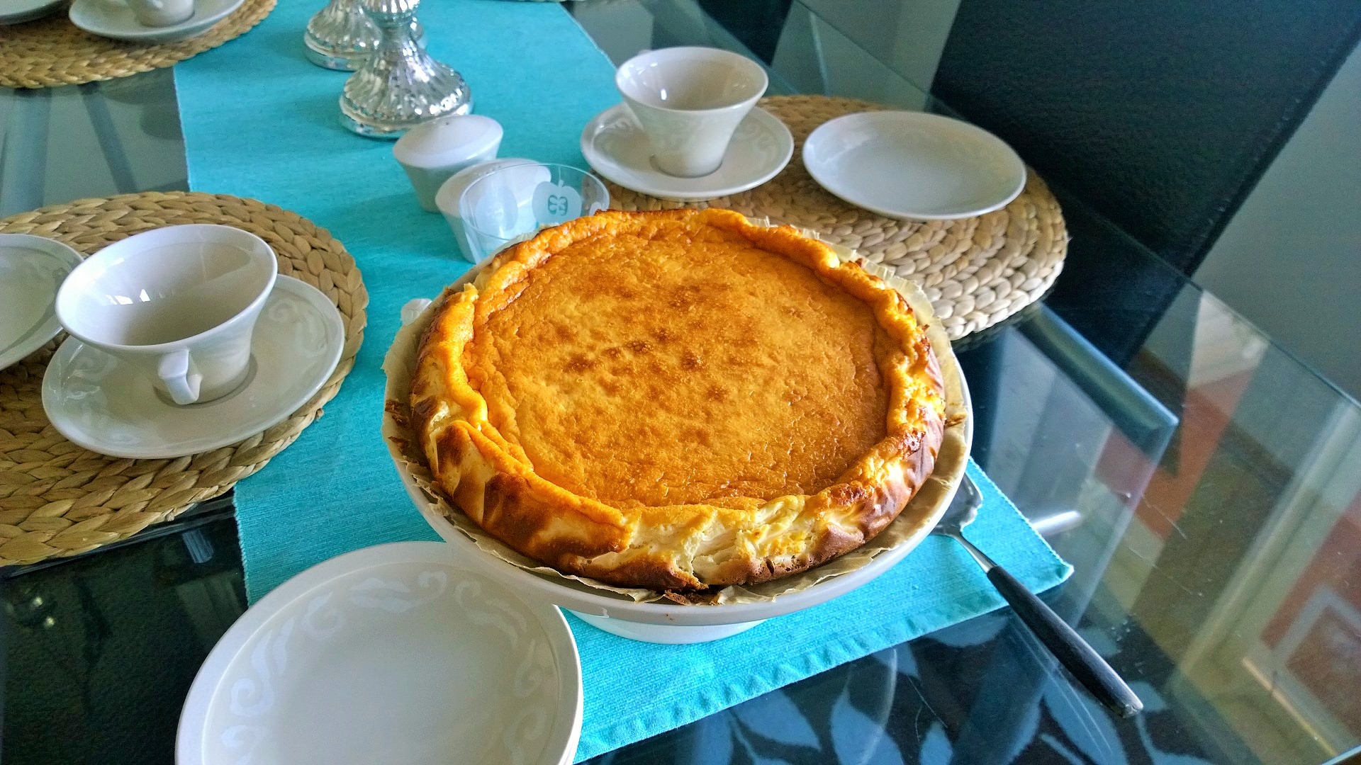 Murskaa keksit esimerkiksi kaulimella pakastepussissa. Lisää joukkoon sulatettu voi. Painele seos leivinpaperilla vuorattuun irtopohjavuokaan, jonka halkaisija on noin 24 cm. Sekoita täytteen ainekset sähkövatkaimella tasaiseksi ja kaada keksipohjan päälle. Paista 175 asteessa uunin alimmalla ritilätasolla noin tunti. Anna jäähtyä. Kakun seuraksi valmistin mustikoista kastikkeen maustamalla mustikoista puristettua ja siivilöityä mehua tomusokerilla ja sitruunan mehulla.