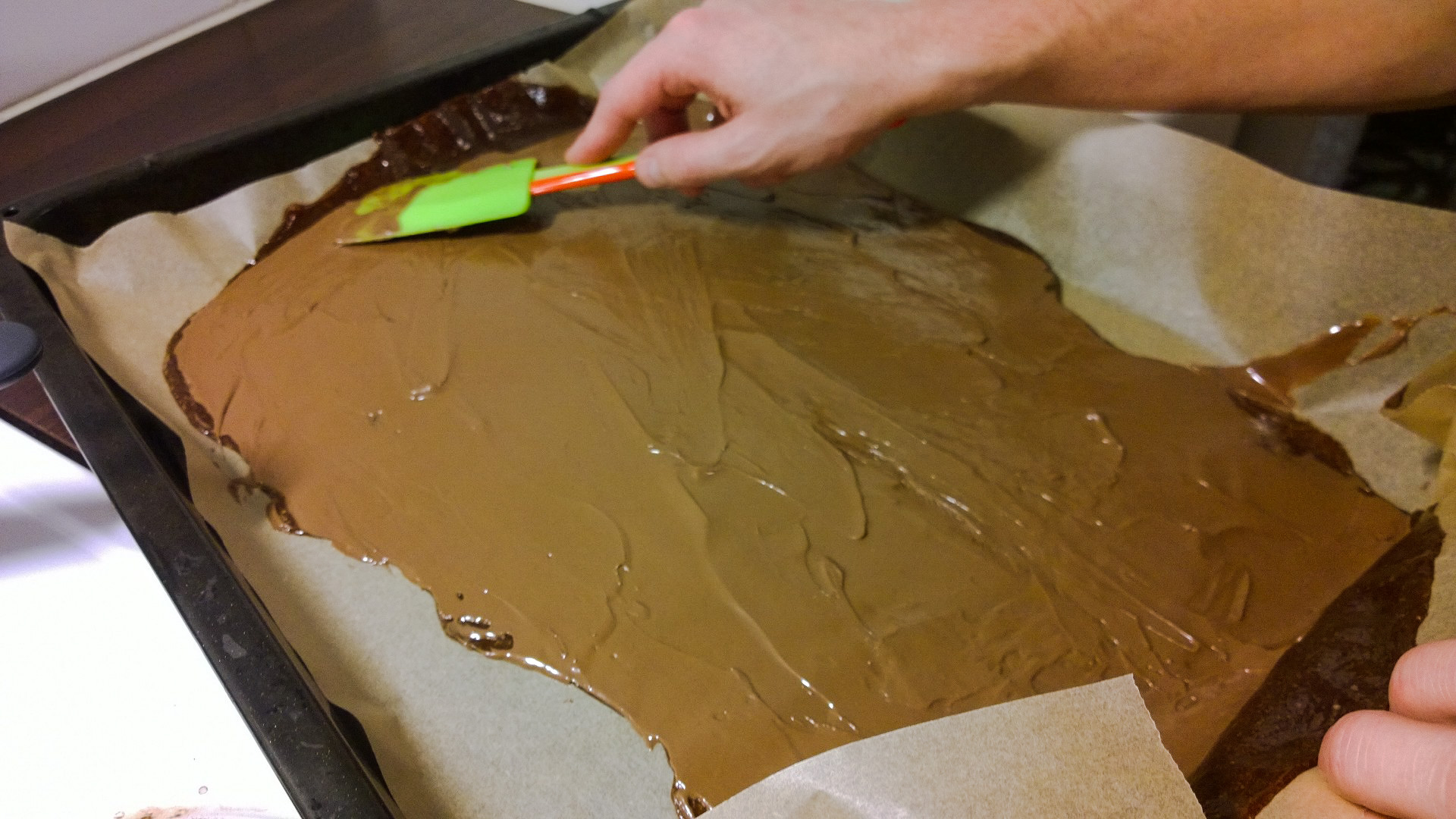 Sulata voi kattilassa. Lisää muut aineet paitsi suklaa. Sekoita seosta koko ajan miedolla lämmöllä 15-20 minuuttia kunnes se irtoaa reunoilta ja on muuttunut yhtenäiseksi massaksi. Kaada massa leivinpaperille ja laita päälle toinen leivinpaperi. Kaulitse ohueksi levyksi. Ole nopea sillä seos jähmettyy nopeasti. Levyn kovetuttua sulata suklaa ja levitä levyn päälle. Anna levyn kovettua jääkaapissa ja taittele paloiksi.