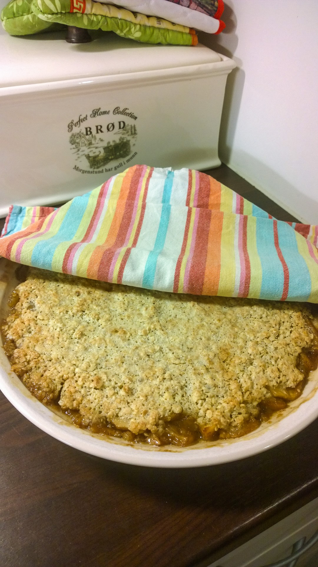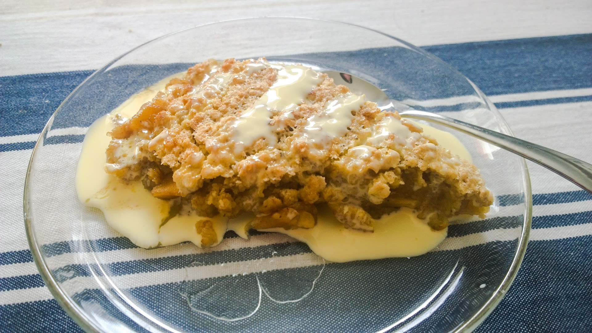 Kuori hedelmät, poista niistä siemenkodat ja lohko paloiksi. Mausta hedelmät kulhossa valkoisella sokerilla (pari ruokalusikallista) ja kanelilla (reilu hyppysellinen) ja sekoita. Sulata paistinpannulla reilu nokare rasvaa sekä fariinisokeria noin desin verran. Heitä sekaan hedelmät ja anna niiden porista rasva-sokeriliemessä miedolla lämmöllä kymmenisen minuuttia niin, että hedelmät saavat hiukan karamellisoitua. Sillä välin ota valmiiksi esille piirakkavuoka ja valmista kaurahiutaleista taikina. Sulata kattilassa 100g margariinia ja 2dl sokeria. Lisää nopeasti sekoittamalla sekaan loput aineet eli kaurahiutaleet, vehnäjauhot ja kananmunat. Levitä karamellisoidut hedelmät piirakkavuokaan ja levitä päälle tasaisesti kaurahiutaleista valmistamasi taikina. Paista uunissa 200 asteessa uunin keskitasossa 15-20 minuuttia. Anna vetäytyä rauhassa ja tarjoile vaniljakastikkeen kera.