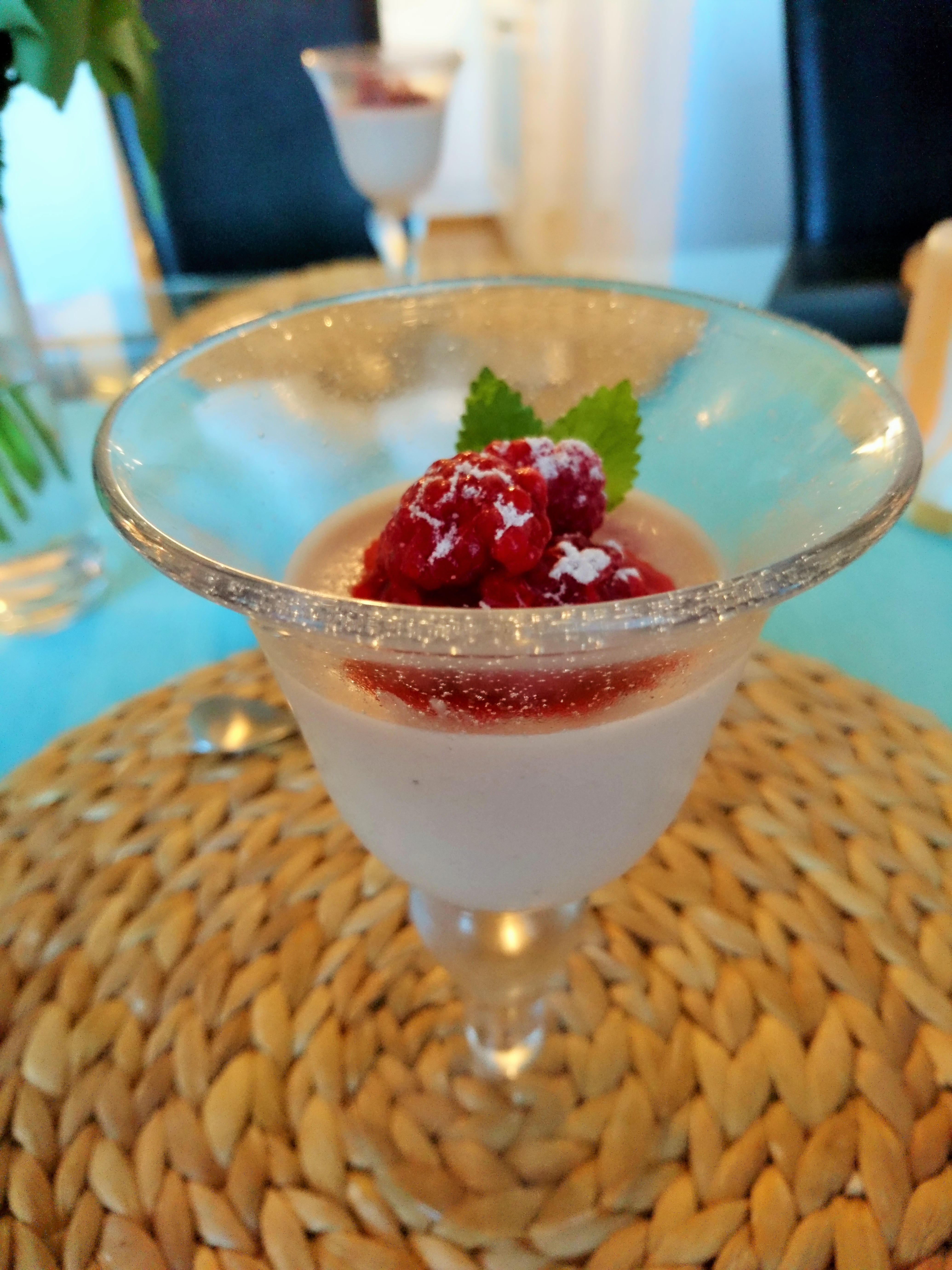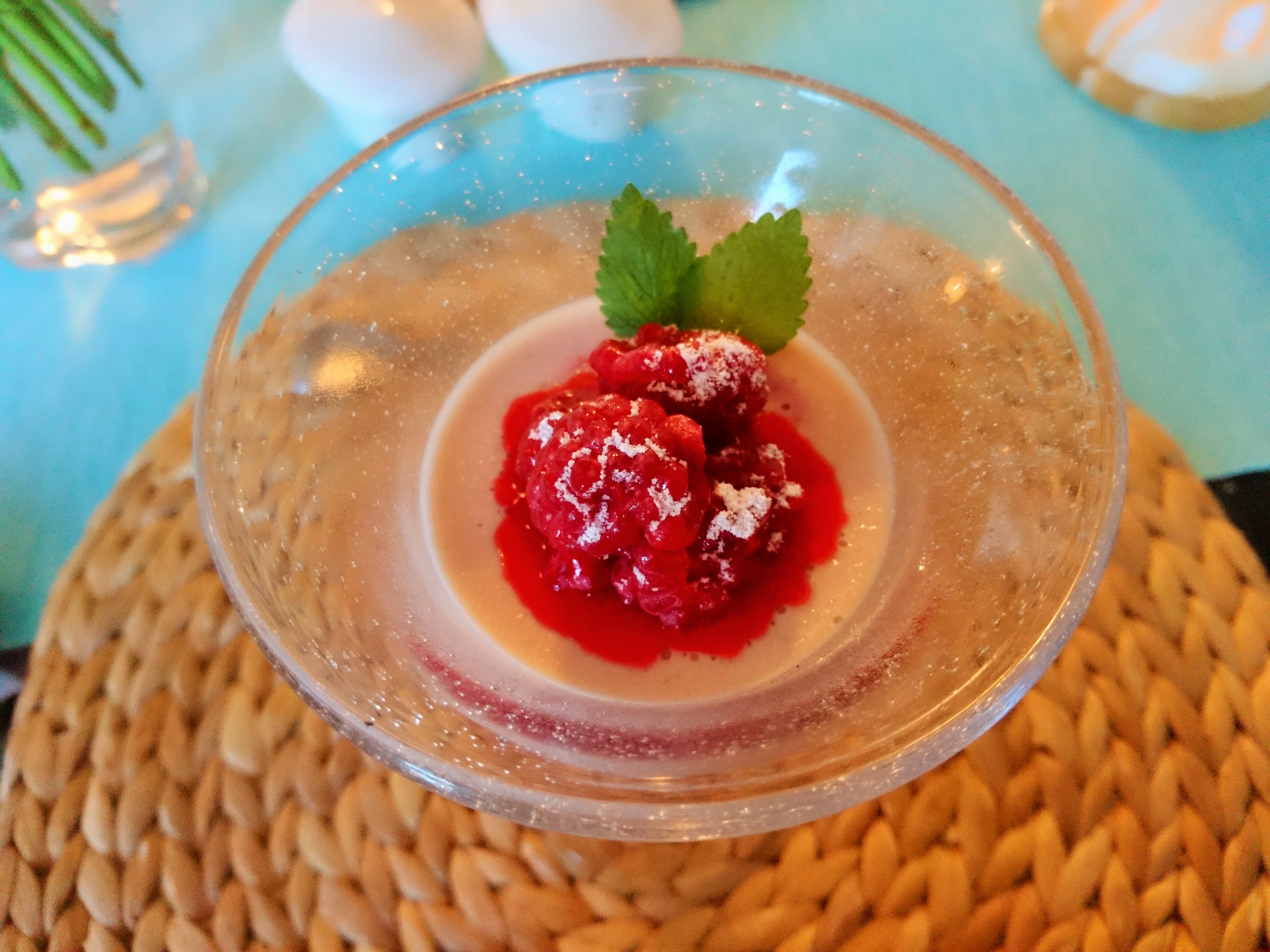 Laita liivatteet likomaan kylmään veteen. Kiehauta kerma ja sokerit kattilassa ja nosta liedeltä. Sekoita sekaan vadelmamehu ja puristetut liivatelehdet. Kaada seos tarjoilulaseihin tai –kulhoihin. Anna jähmettyä rauhassa jääkaapissa seuraavaan päivään. Koristele annos vadelmilla ennen tarjoilua.