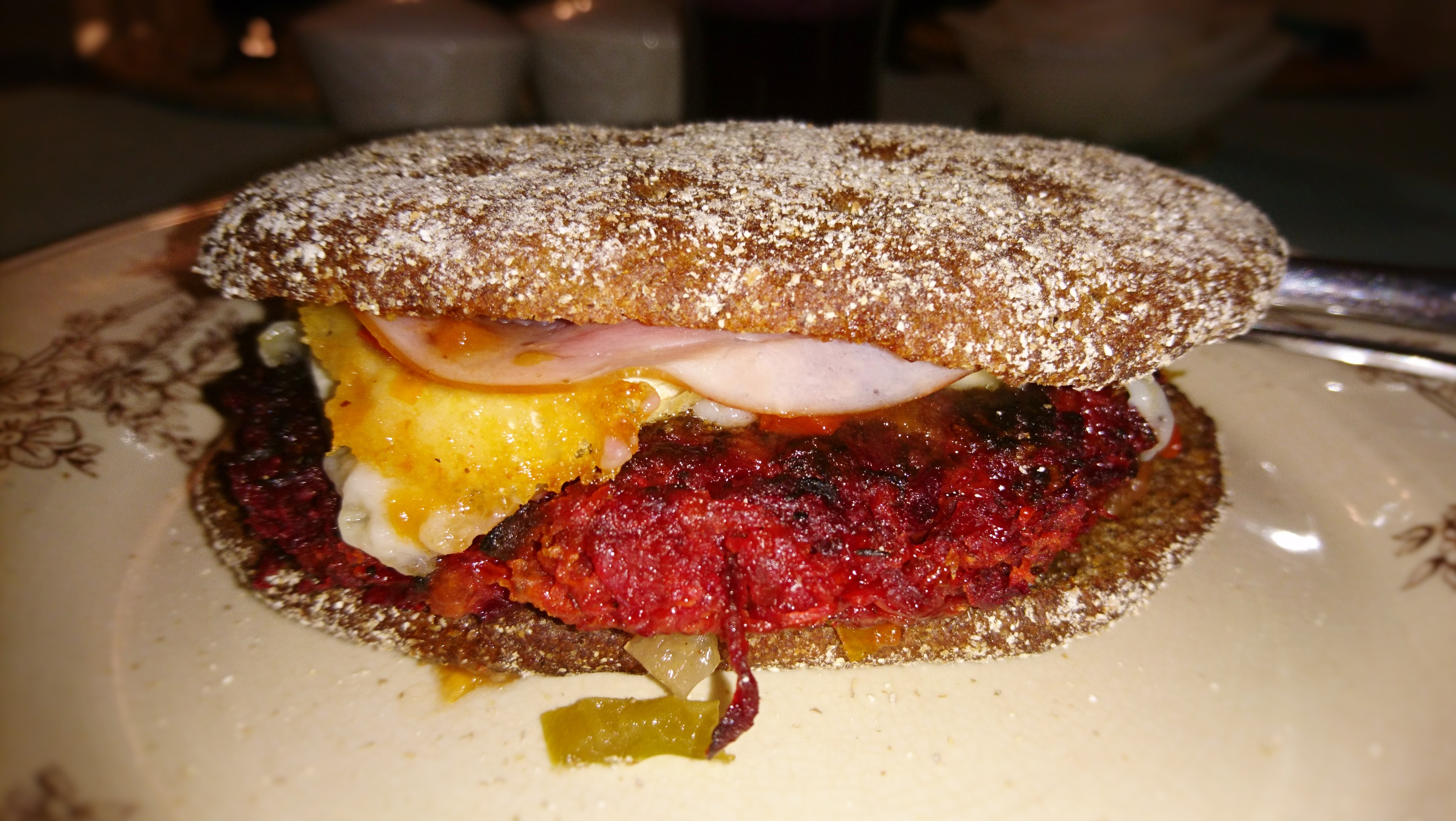 Punajuuripihvejä tuli meidän kahden tarpeisiin niin reipas annos, että kerkesimme kehittelemään pihveistä vielä tässä viikonlopun aikana toisenlaisenkin herkkuruuan, nimittäin punajuurihampurilaiset. Tästä hampurilaisesta on helppo tehdä joko kasvis- tai lihaversio ihan omien mieltymysten mukaan. Meillä tällä kertaa välissä oli myös kinkkusiivut. Hampurilaissämpylöiden virkaa toimittivat leivänpaahtimessa kevyesti paahdetut ruisleipäpalat. Leipien väliin laitoimme punajuuripihvit, pannulla voinokareessa paistettua vuohenjuustoa pari siivua, Larin omatekoista bbq-kastiketta, paholaisen hilloa, omatekoista paprikasalsaa sekä kinkkusiivut. Aivan älyttömän maukas ja tavallisesta poikkeava hampurilainen, joita olisin voinut syödä kyllä parikin kappaletta.