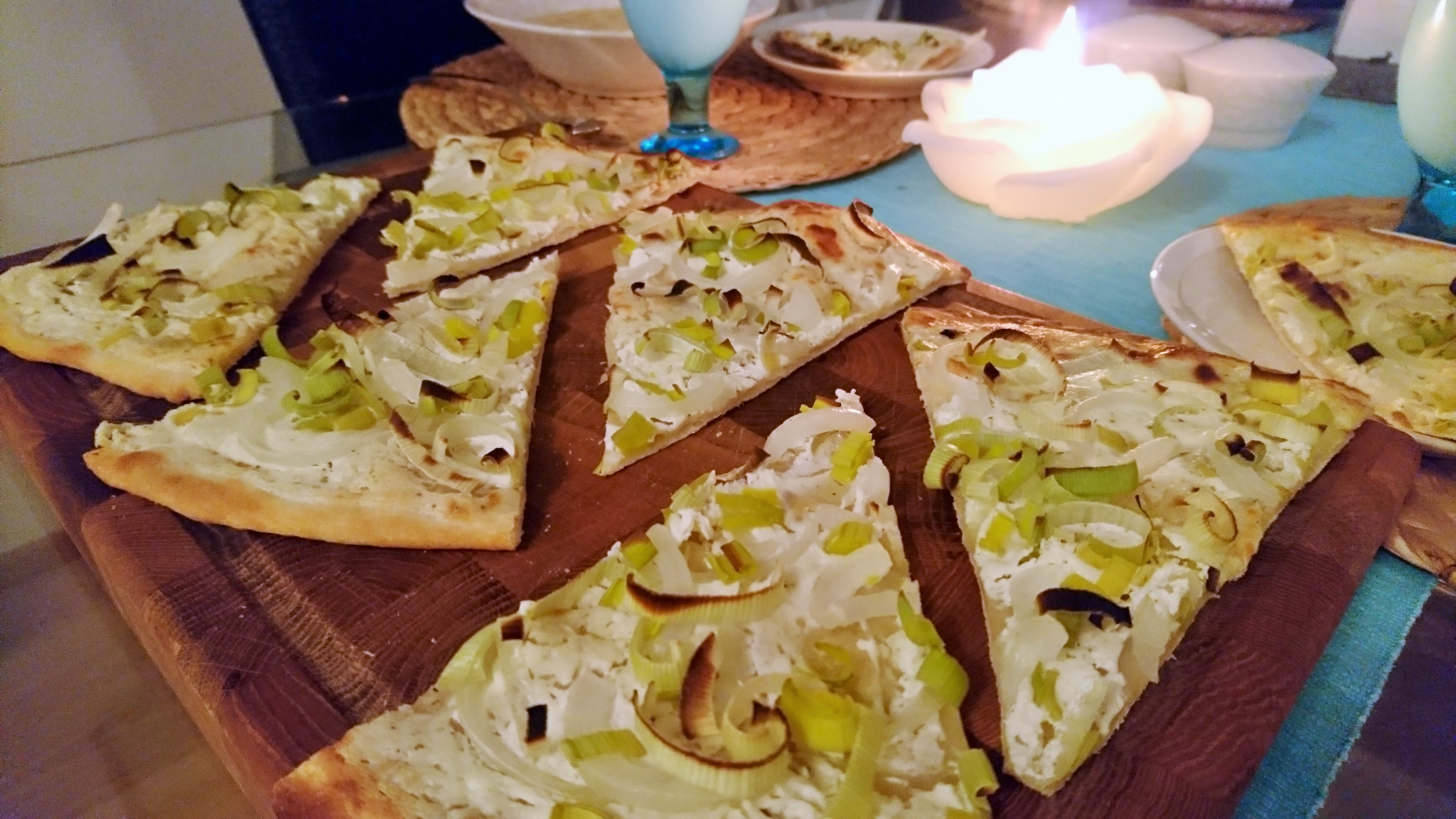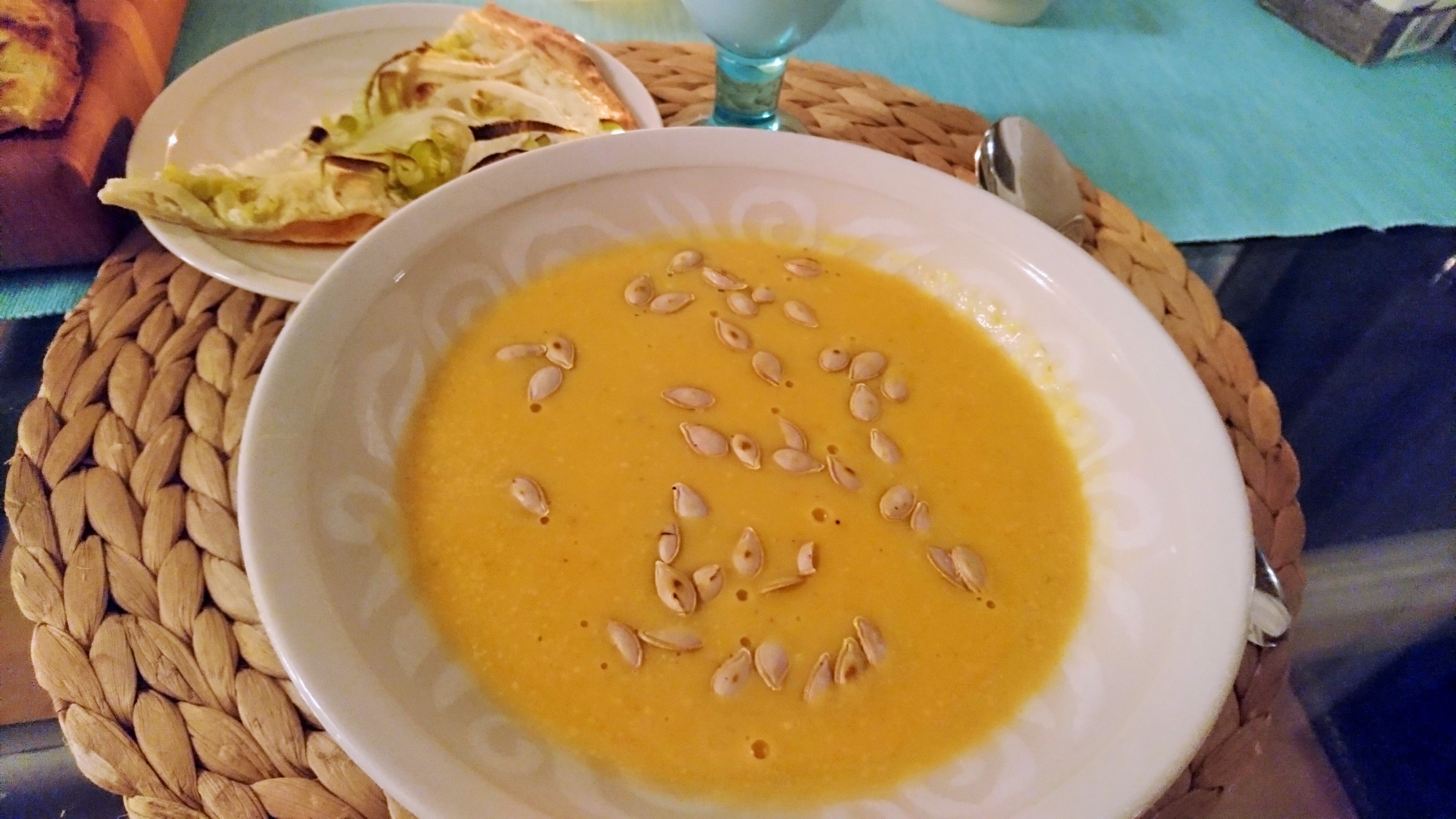 Puolita kurpitsa ja poista siemenet sekä rihmastot. Jätä siemenet talteen kuitenkin. Kuori kurpitsa ja paloittele. Laita leivinpaperin päällä uunipellille ja paahda kurpitsat kypsäksi 225 asteessa noin 40 minuuttia. Huuhdo kurpitsan siemenet puhtaaksi ja kuivaa huolellisesti. Paahda kuivalla pannulla hetki, mutta varo pitämästä liian kauan, koska muuten siemenet alkavat poksumaan kuumalla pannulla ja sinkoilevat sinne tänne. Tuli siis tämäkin kokeiltua. Siirrä paahdetut siemenet lautaselle ja mausta ripauksella suolaa ja mustapippuria. Käytä siemeniä annoksen koristeluun ja tuomaan kivaa pähkinäistä lisämakua keittoon. Kurpitsanpalojen paahtuessa uunissa kuori sipuli, valkosipuli ja inkivääri ja pilko silpuksi. Silppua myös pieni pätkä chiliä makusi mukaan. Kuullota sipuli, valkosipuli, inkivääri ja chili rasvassa paistinpannulla. Laita kattilaan paahtuneet kurpitsanpalat, kuullotetut kasvikset, vesi sekä kasvis- tai kanaliemikuutiot. Kuumenna kiehuvaksi ja soseuta sauvasekoittimella samettisen sileäksi. Valmista valkokastike sulattamalla pannulla kaksi ruokalusikallista rasvaa ja sekoita siihen vehnäjauhot. Lisää maito pienissä erissä ja vispaa vispilällä koko ajan seos tasaiseksi, jotta kastikkeeseen ei jää paakkuja. Kun koko maito on lisätty rasva-jauhoseokseen, jatka hämmentämistä odotellessasi, että kastike kuumenee kiehuvaksi. Kun kastike pulpahtaa, käännä levy pienelle lämmölle ja jatka hämmentämistä vielä muutaman minuutin ajan. Kaada kastike keiton joukkoon ja sekoita keitto tasaiseksi. Mausta mieleiseksesi suolalla ja mustapippurilla ja viimeistele keitto vielä smetanalla. Tarjoa keitto saksalaisen perinneherkun eli Flammkuchenin kanssa. Me valmistimme liekkipiirakasta perinteisen lauch-version eli kasvisversio, jossa täytteenä lihan sijaan on purjosipuli sekä tavallista keltaista sipulia. Flammkuchenin resepti löytyy blogistani täältä.