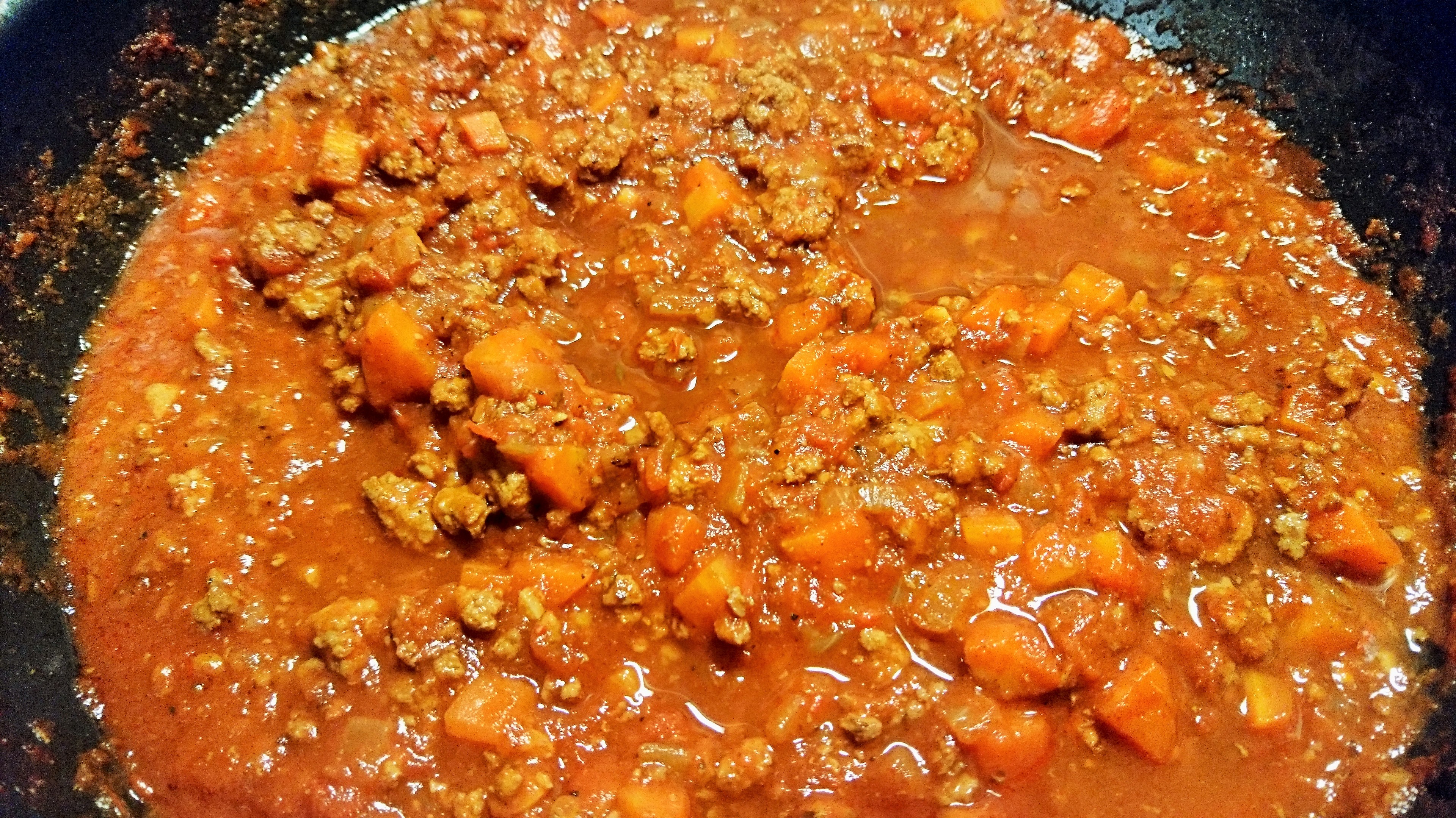 Kuori ja silppua sipuli ja valkosipulin kynnet. Kuori ja pilko porkkanat miellyttävän kokoisiksi pieniksi suupaloiksi. Kuullota vihanneksia ja yrttejä oliiviöljyssä noin 10 minuuttia. Nosta lieden lämpöä ja lisää jauheliha. Ruskista liha ja kaada pannusta pois ylimääräinen rasva. Lisää tomaattimurska, tomaattipyree, Worcester-kastike, vahva lihaliemi, punaviini sekä oman makusi mukaan suolaa ja mustapippuria. Anna kiehua hiljalleen kannen alla vähintään 40min. Meillä muhi pari kolme tuntia ja maku vain paranee, kun antaa kastikkeen tekeytyä miedossa lämmössä rauhassa.