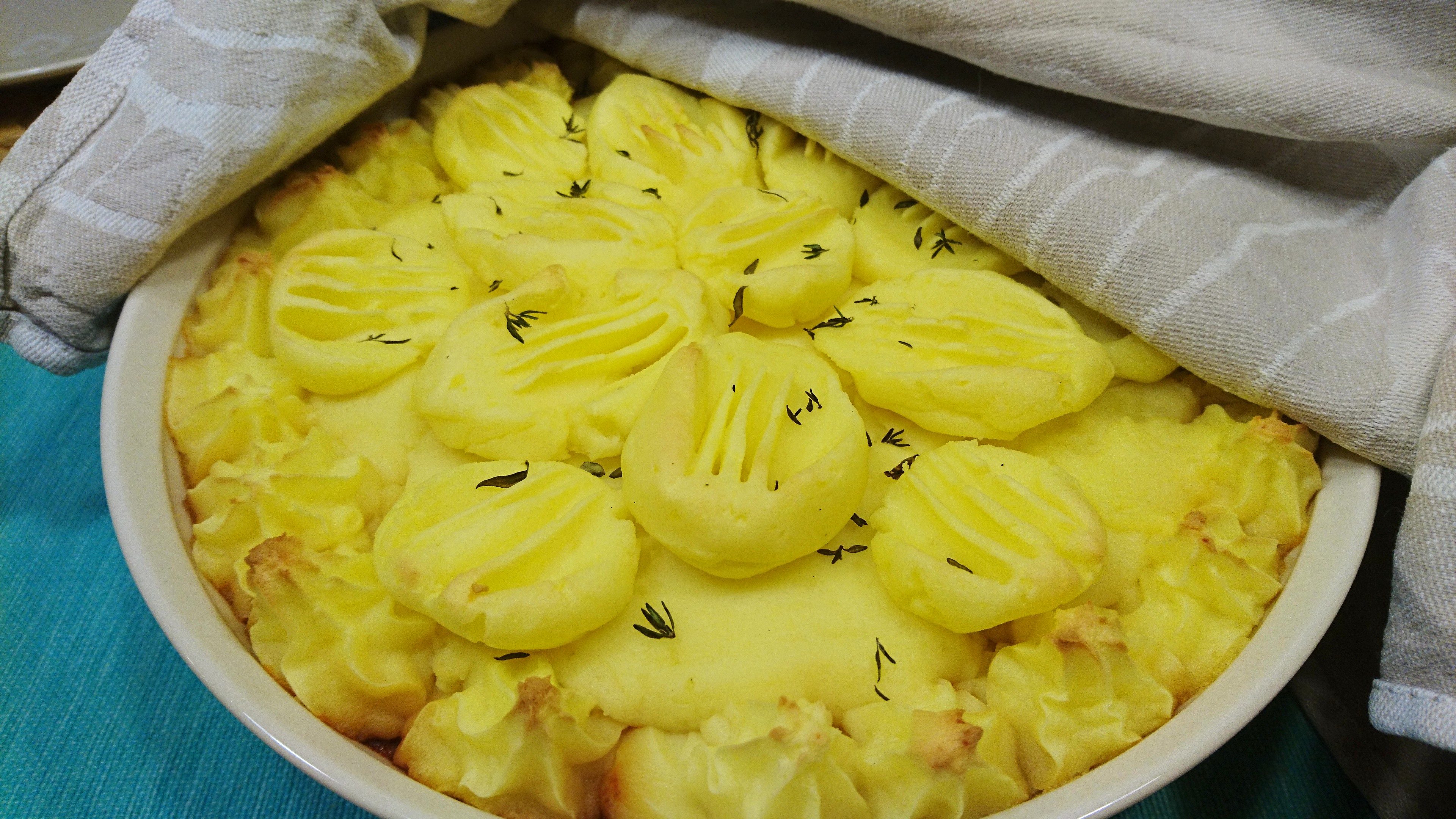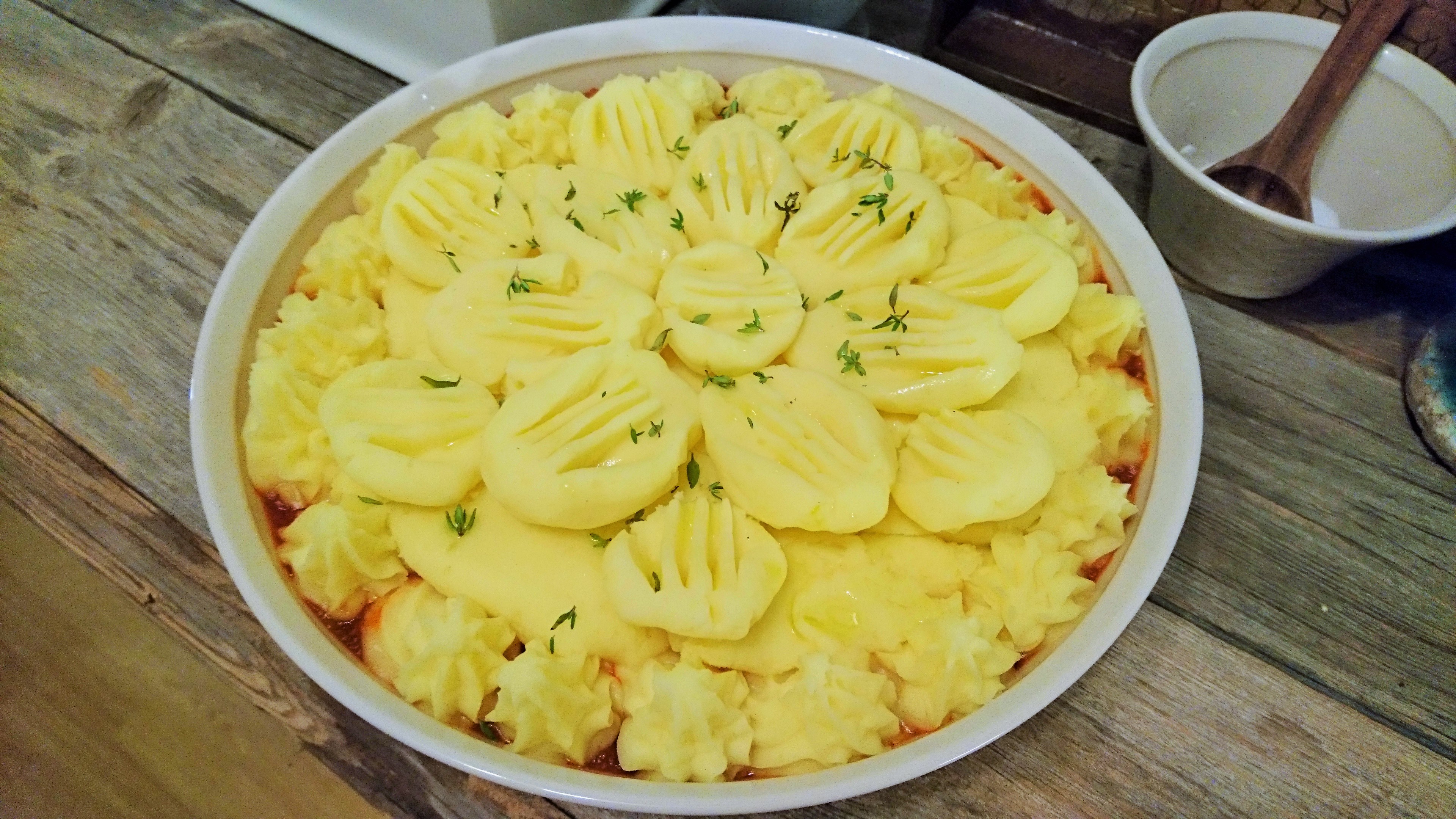 Kuori ja keitä perunat suolalla maustetussa vedessä. Kaada keitinvesi kypsistä perunoista pois ja survi survimella. Lisää sekaan maito, voi ja juustoraaste ja vatkaa muusiksi sähkövatkaimella. Levitä jauhelihakastike laakean uunivuoan pohjalle ja levitä päälle perunamuusi. Voit koristella ruuan pursottamalla pinnalle lopuksi vaikka muutamia ruusukkeita muusista tai haarukalla tehdä koristeellisia kuvioita pintaan haluamallasi tavalla. Ripottele pinnalle muutamia timjamin lehtiä ja oliiviöljyä tilkka.