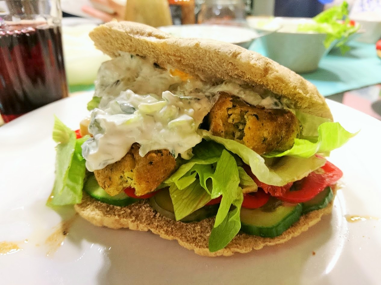 Kreikkalaiset käyttävät tsatsikiinsa varmasti kreikkalaista jogurttia, mutta meillä oli käytössä turkkilainen jogurtti, joka toimii aivan yhtä hyvin. Tsatsikiin ei kannata valita mitään vähärasvaista kevytversiota jogurtista, koska ne vain valitettavasti ovat liian vetisiä tsatsikiin ja maku jää vaisuksi ja valjuksi ja koostumus löysäksi. Aloita raastamalla kurkku raastimella. Purista käsissäsi kurkusta kaikki neste pois, minkä vain saat irtoamaan raasteesta. Jätä kurkkuraaste siivilään vielä hetkeksi valumaan ja nesteen irtoamista voit tehostaa ripauttamalla kurkkuraasteen päälle hieman suolaa nestettä irrottamaan. Pilko valkosipuli aivan hienoksi tai käytä puserrinta. Riippuen valkosipulin kynsien koosta laita joko kolme isoa kynttä tai jos kynnet ovat hyvin pieniä niin jopa kuusi kynttä tsatsikiin. Sekoita kulhossa jogurtti, kurkkuraaste, silputtu valkosipuli, oliiviöljy, pienen pieni loraus (ehkä ½ tl) valkoviinietikkaa, hyppysellinen suolaa, ripaus rouhittua mustapippuria, sekä tukko silputtua tilliä huolellisesti sekaisin. Meillä ei ollut tuoretta tilliä tällä kertaa, mutta kuivattukin tilli ajaa asiansa oikein hyvin. Tarkista maku ja anna tekeytyä hetki jääkaapissa ennen tarjoilua. Tsatsikin voi halutessaan koristella muutamalla oliivilla. Nauti tsatsiki esimerkiksi falafel-pitojen välissä, kuten kuvassa.