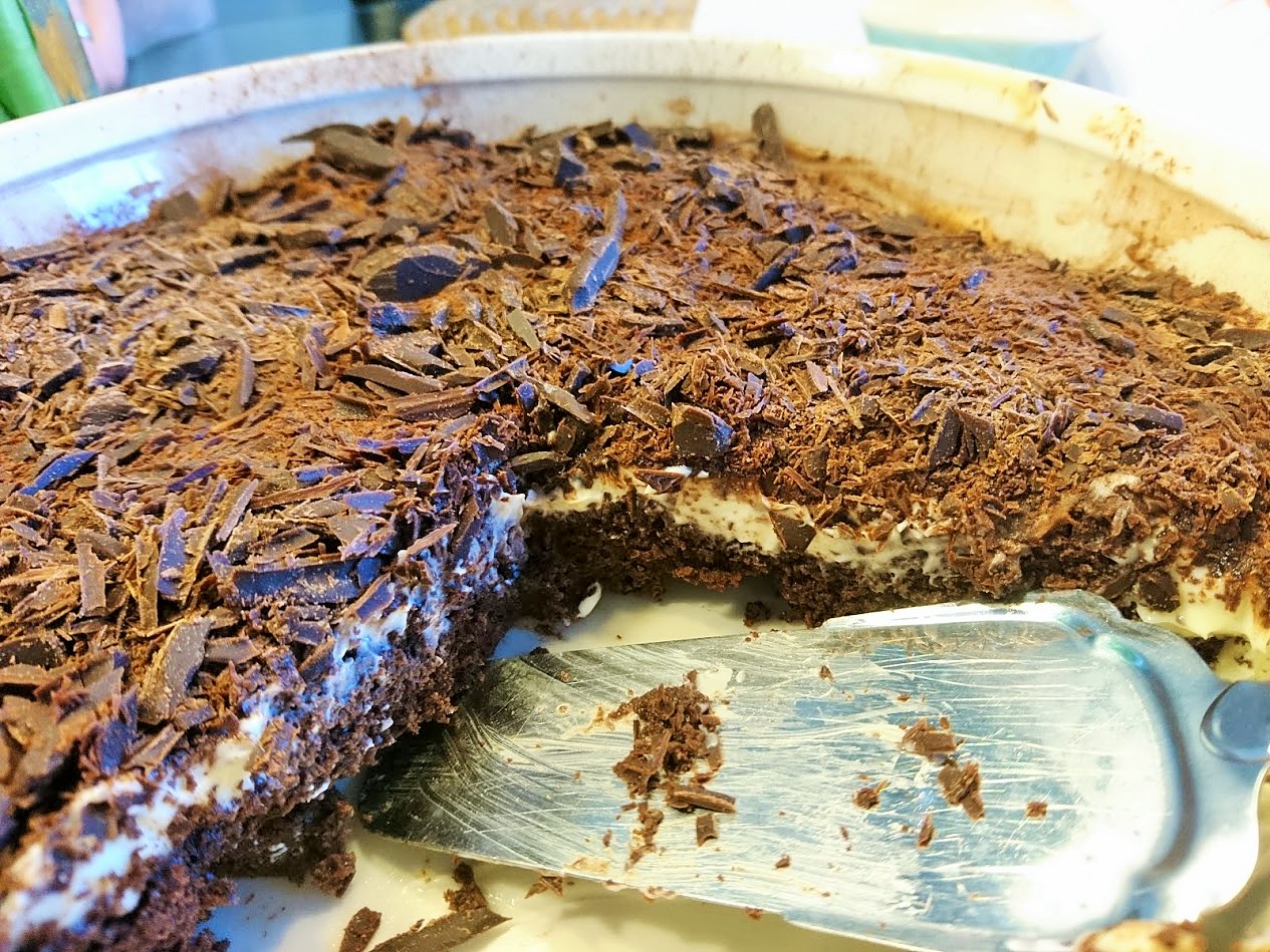 Sulata rasva ja jätä se jäähtymään. Sillä välin vaahdota kulhossa munat ja sokeri. Kaada rasva ohuena norona muna-sokerivaahtoon ja sekoita varovasti. Siivilöi ja nostele jauhot ja kaakaojauhe sekaan. Levitä taikina leivinpaperilla vuorattuun vuokaan 1cm paksuiseksi levyksi. Vuoan koko tulee olla noin 25cm x 40cm. Paista 180 asteessa uunissa noin 10min. Anna pohja jäähtyä. Sulata paloiteltu valkosuklaa ja maito vesihauteessa. Anna jäähtyä hieman. Sekoita mascarponen joukkoon sokeri, keltuainen ja 30 milliä appelsiinimehua. Sekoita joukkoon vielä valkosuklaa. Revi pohja isohkoiksi paloiksi ja levitä palat laakean tarjoiluvuoan (20cm x 30cm) pohjalle lomittain ja painele käsillä, jotta palat asettuvat vuokaan. Kostuta pohja appelsiinimehulla ja kahvilla. Anna nesteiden imeytyä pohjaan muutaman minuutin ajan. Levitä mascarponeseos pohjan päälle tasaiseksi kerrokseksi. Siivilöi pinnalle kaakaojauhetta ja koristele runsaalla määrällä suklaalastuja tai –rouhetta. Käytä koristeluun tummaa suklaata. Anna vetäytyä ja tekeytyä jääkaapissa rauhassa, mielellään yön yli. Nauti!
