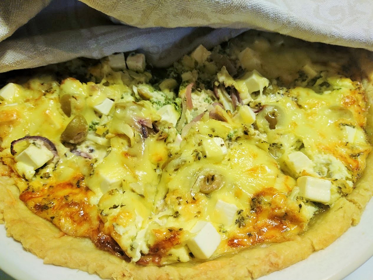 Kun pohja on esipaistettu, nosta se uunista ja täytä. Levitä pohjalle sulatettu pinaatti tai ryöpätyt, hienonnetut nokkoset. Lisää päälle viipaloidut sipulirenkaat ja valkosipulimurska. Ripottele päälle myös viipaloidut oliivit sekä fetapalat. Valmista munakerma sekoittamalla kulhossa kananmuna ja kerma. Lisää sekaan mausteet ja sekoita. Kaada munakerma tasaisesti täytteiden päälle. Ripottele pinnalle vielä juustoraaste. Paista 180 asteessa uunin keskitasossa 30-40 minuuttia, kunnes juusto on saanut kauniin paistovärin. Tarjoa salaatin kera.
