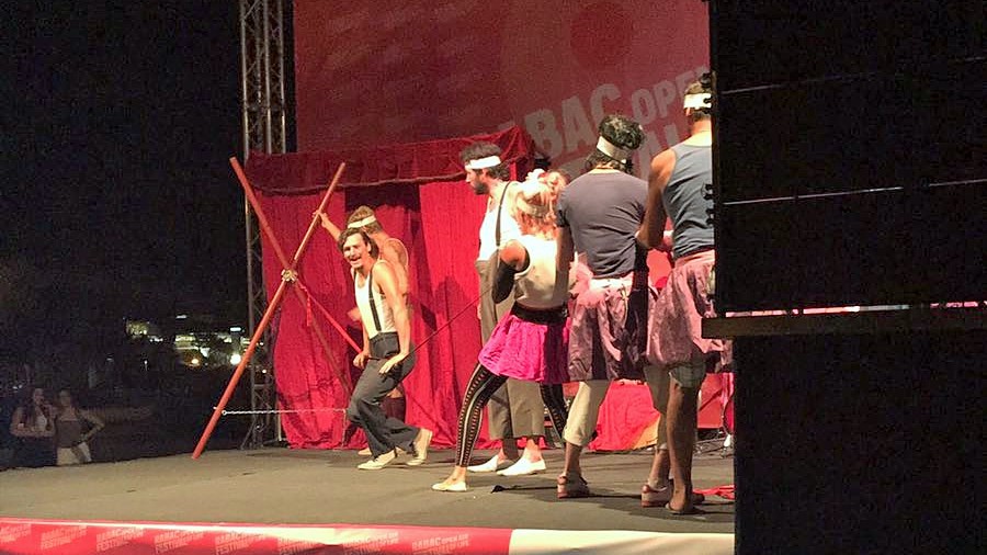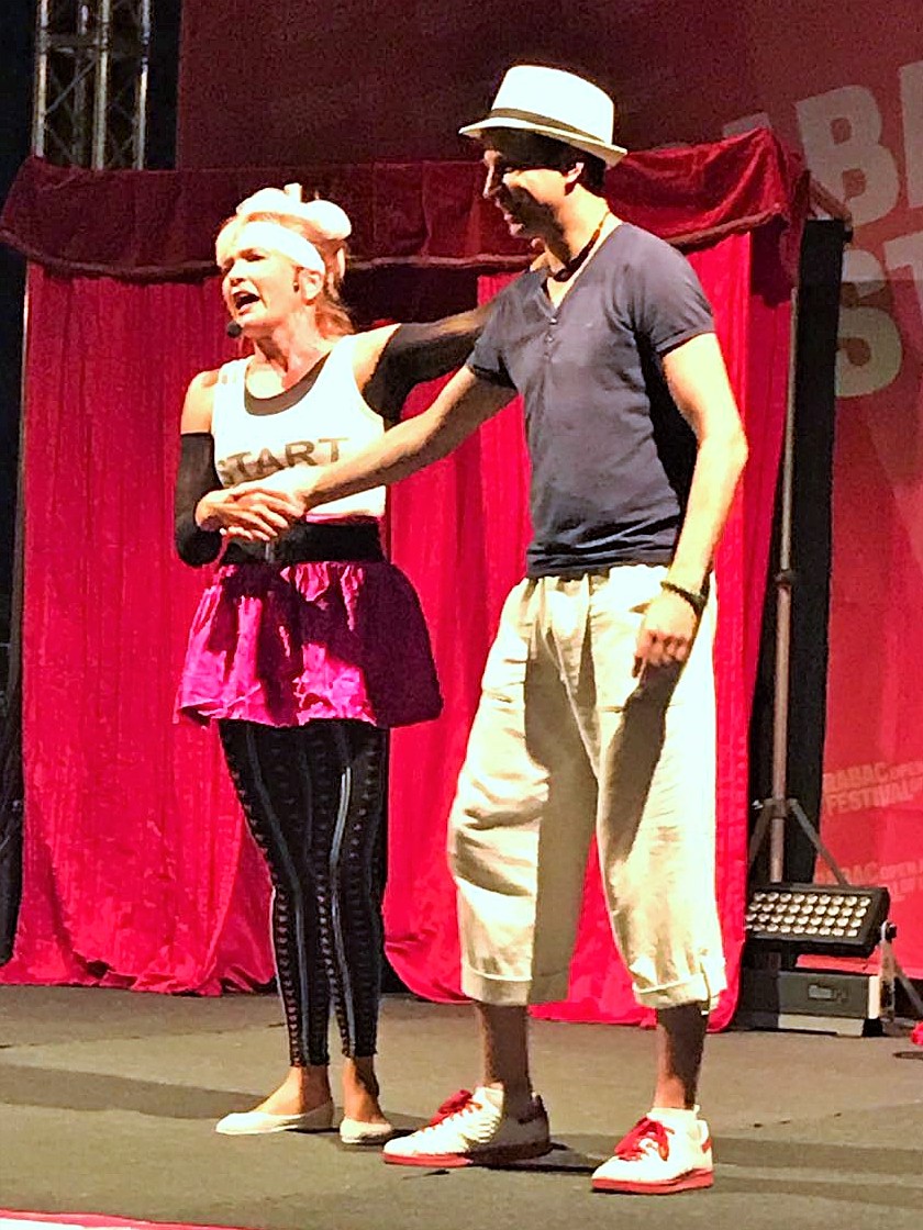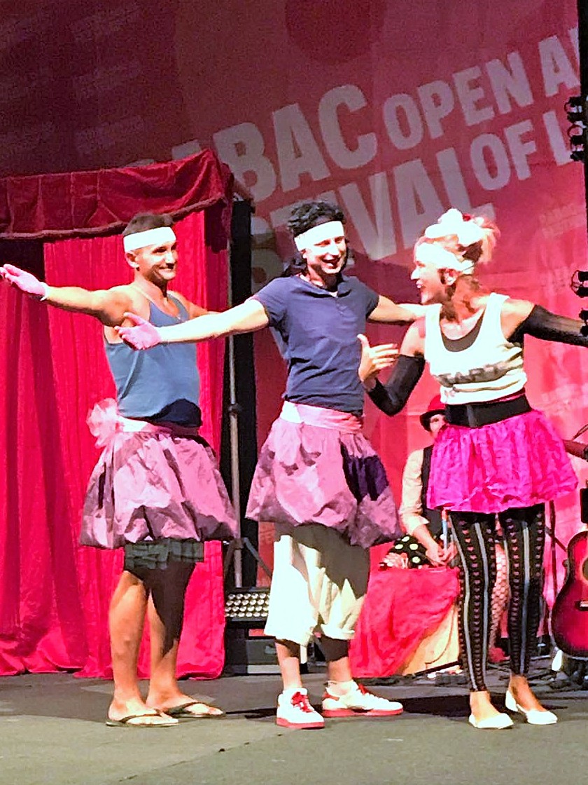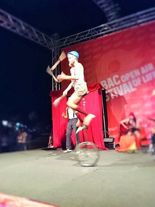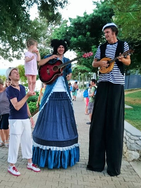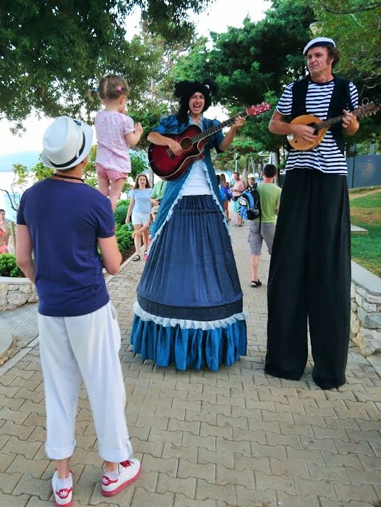 Festareiden nettisivuilla kerrottiin, että Cirkobalkanan sirkustaiteilijat esiintyvät ensin alkuillasta siellä täällä pitkin rantakatua ja kutsuvat ihmisiä illan huipennukseen, kabareenäytökseen, jossa esiintymislavalla yhdistyisivät laulu, tanssi, huumori ja teatteri sirkusesityksen muotoon paketoituna. Nettisivujen mukaan luvassa olisi tulielementtejä, jonglöörien taidonnäytteitä, akrobatiaa ja vaikka mitä. Ajattelimme, että tämä olisi taas aivan huippuhauska yhteinen juttu, josta varmasti Alisakin nauttisi ja emme kyllä olleet väärässä, sillä Alisa seurasi koko esityksen loppuun asti kuin naulittuna paikalleen. Kaiken lisäksi tämäkin festareiden ohjelmanumero on yleisölle ilmainen eikä mitään sisäänpääsylippuja vaadita.