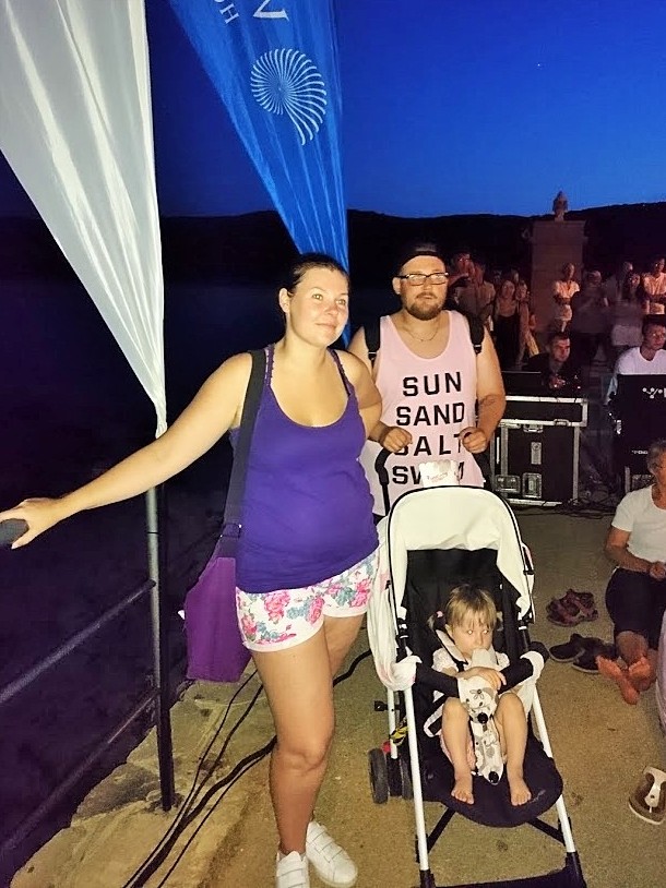 Kiertelimme rantakatua odotellessamme illan esitystä ja veljenikin sai hieman tutustua Rabaciin. Alisa söi eräässä rantakahvilassa iltapalan jo valmiiksi, sillä illan esitys alkoi vasta yhdeksältä, joten ajattelimme, että iltapalan syötyään Alisa voi sitten nukahtaa rattaisiinsa tai esityksen päätyttyä autoon yöunille eikä häntä tarvitse sitten herätellä ennen aamua. Katselimme kojujen ostostarjontaa, ihastelimme veneitä ja lukuisia pikkupoukamissa olevia kalliorantoja ja huvituimme vastaan kävelevien sirkuspellejen höpötyksistä.