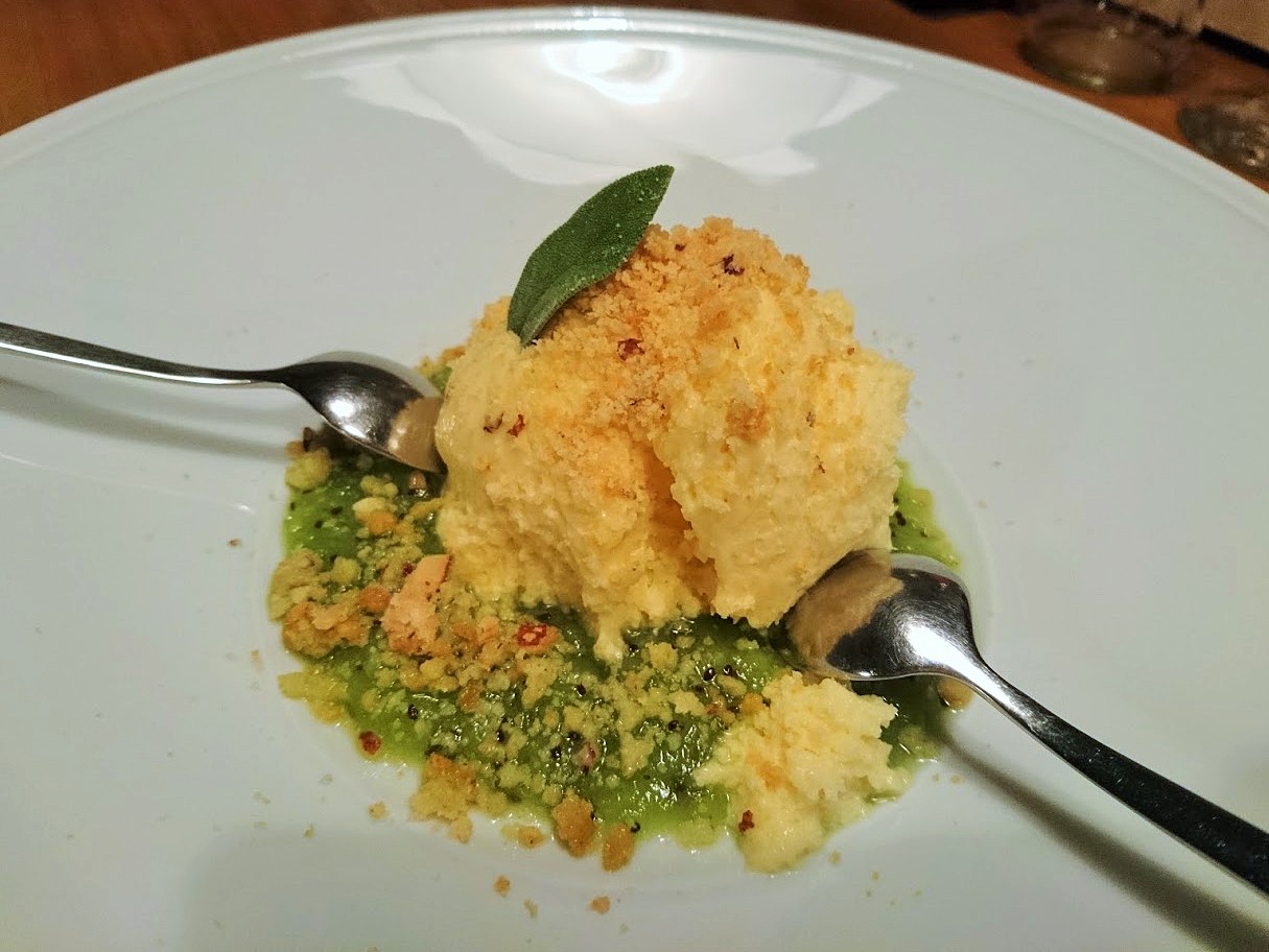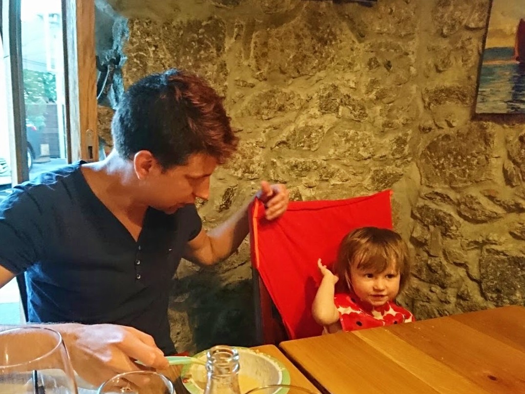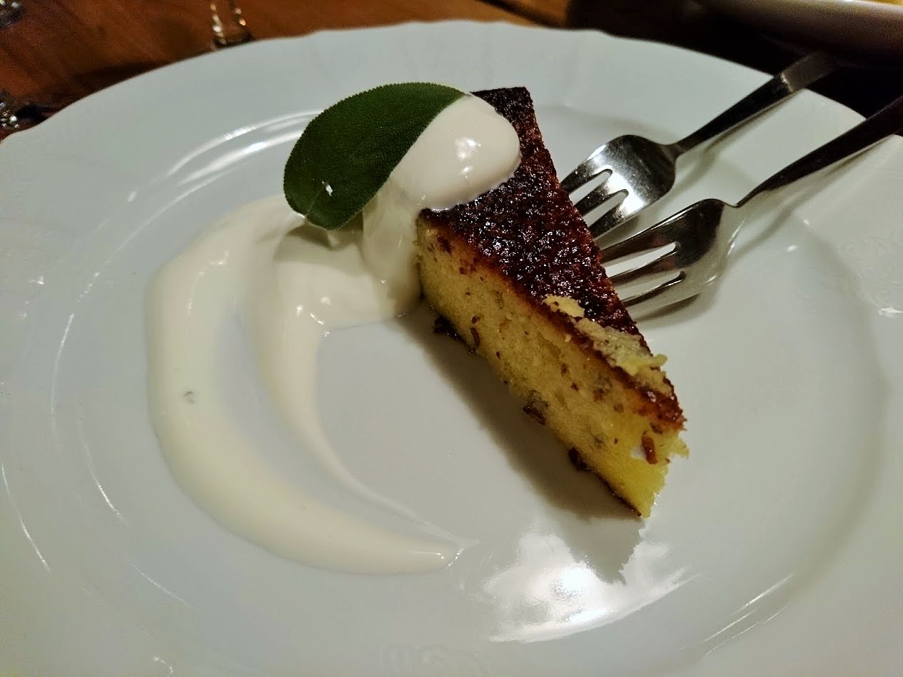 Jälkiruuaksi tilasimme vielä perinteistä paikallista kakkua sekä valkosuklaamoussea kiiviemulsiolla ja mantelikeksin muruilla. Etenkin tuo valkosuklaamousse oli myös Alisan mieleen, sillä täällä ollessamme suklaahirmumme lempihedelmäksi on noussut kiivi ja Alisahan olisi syönyt yksikseen meiltä tuon koko jälkkärin jos lupa olisi annettu. Jälkkäritkin upposivat vielä onnesta soikeina hymyilevistä suupielistämme sisään, vaikka olimme jo aivan täynnä alkuruokien sekä pääruokien jälkeen. Minä hykertelen vieläkin tämän ruokakokemuksen johdosta, vaikka illallisesta on jo pari päivää aikaa enkä voi lakata hokemasta, että tuo oli elämäni täydellisin illallinen.