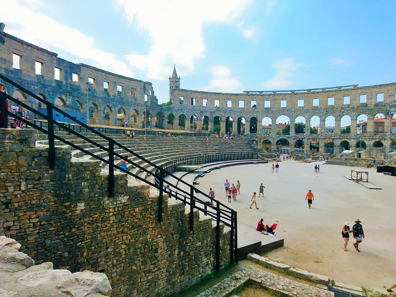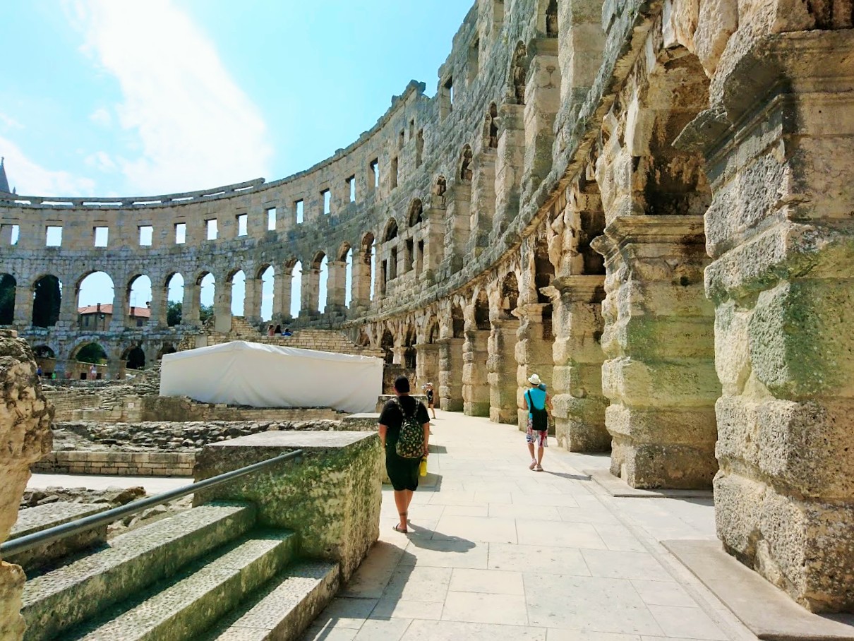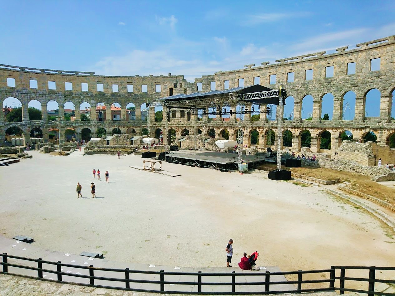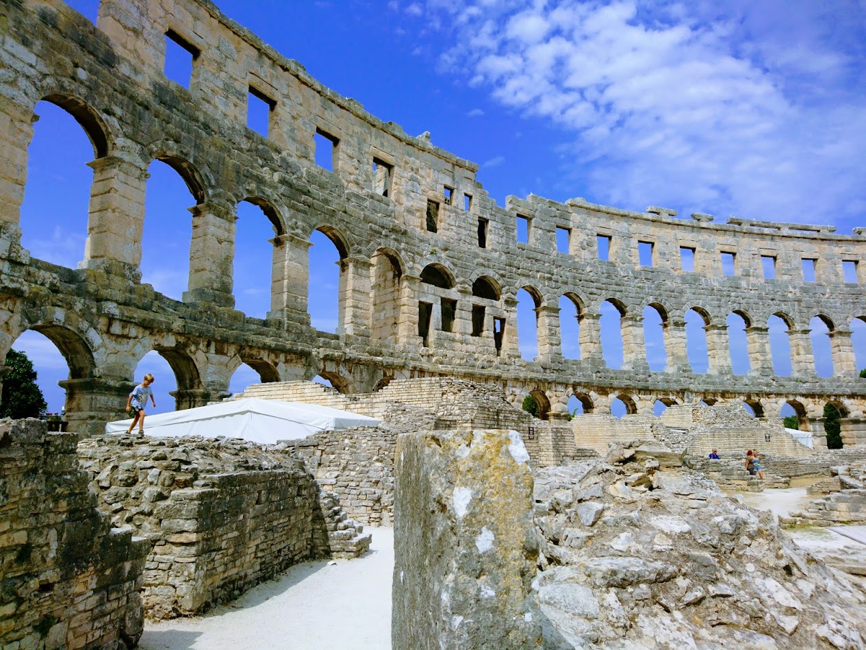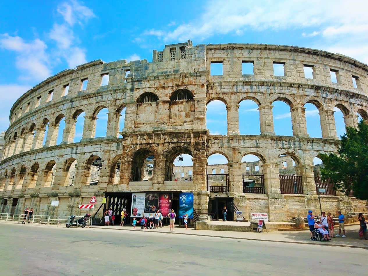 Toisena Pula-päivänämme viime lauantaina suuntana olikin sitten Pulan keskusta ja sen historialliset nähtävyydet. Suuntasimme ensin keskustan laitamilla sijaitsevalle Pula Arenalle eli Pulan kuuluisimmalle ja suurimmalle nähtävyydelle, roomalaisten rakentamalle amfiteatterille, joka kerää vuosittain 400 000 vierailijaa. Pulan amfiteatteri on yksi parhaiten säilyneistä roomalaisten amfiteattereista ja on kuudenneksi suurin amfiteatteri koko maailmassa. Pula Arenaa on alettu rakentamaan 27 vuotta ennen kristuksen syntymää ja se on valmistunut vuonna 68 ajanlaskun alun jälkeen ja sinne mahtuu jopa 20 000 katsojaa. Aikoinaan roomalaiset rakensivat amfiteattereita muun muassa jotta kansalle saatiin tarjota ”leipää ja sirkushuveja”. Näin tavallinen kansa pidettiin tyytyväisenä, kun he pääsivät maksutta seuraamaan karskia viihdettä, kuten raakoja eläin- ja gladiaattoritaisteluita.