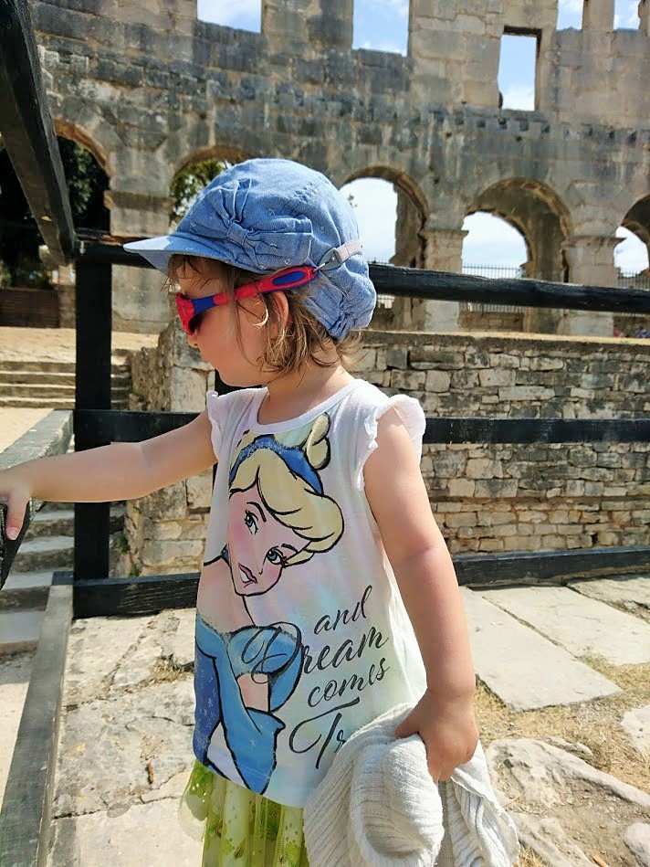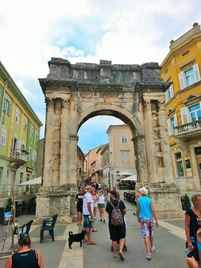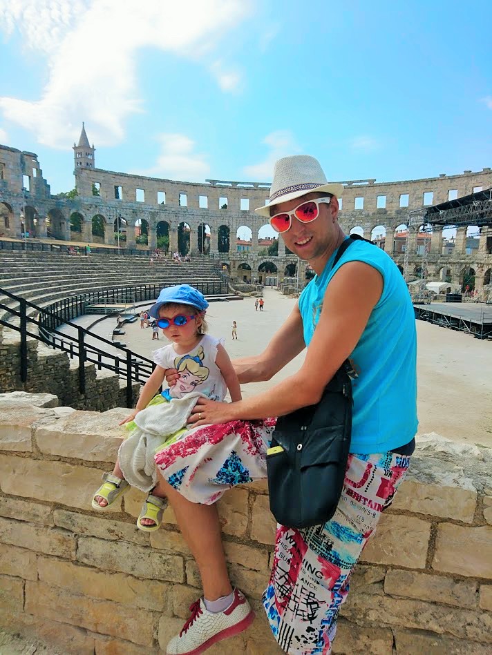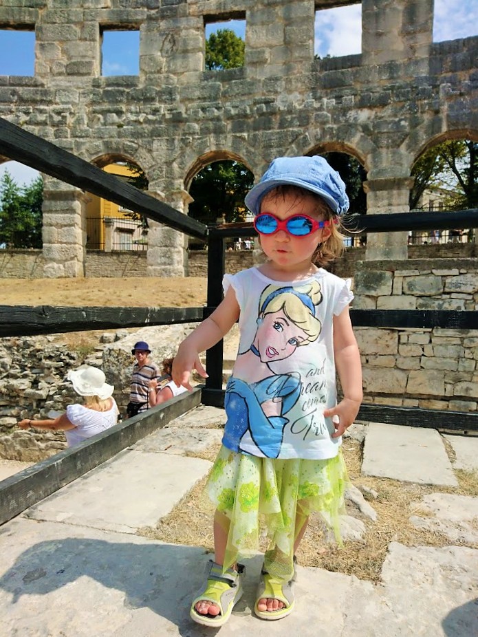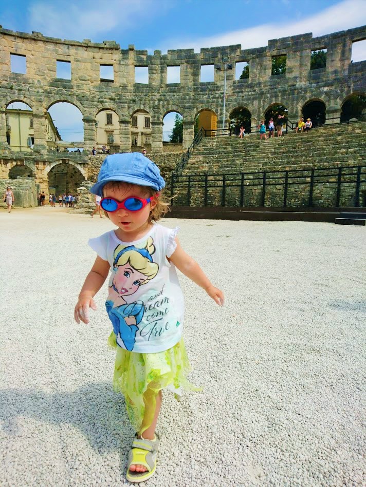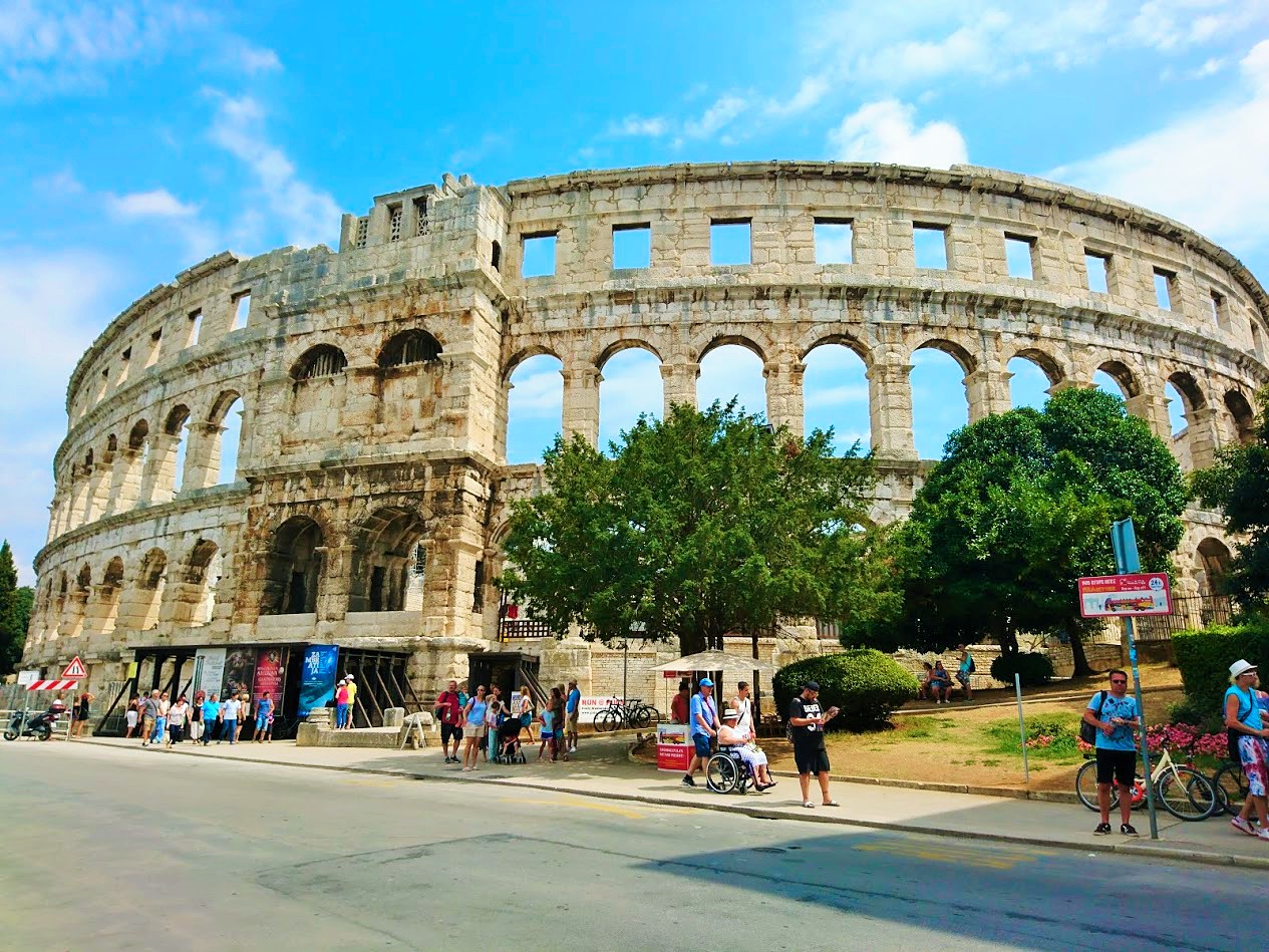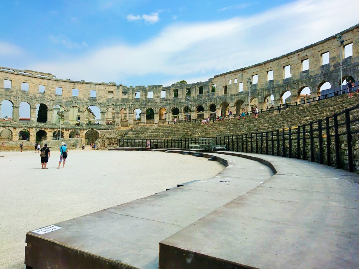 Toisena Pula-päivänämme viime lauantaina suuntana olikin sitten Pulan keskusta ja sen historialliset nähtävyydet. Suuntasimme ensin keskustan laitamilla sijaitsevalle Pula Arenalle eli Pulan kuuluisimmalle ja suurimmalle nähtävyydelle, roomalaisten rakentamalle amfiteatterille, joka kerää vuosittain 400 000 vierailijaa. Pulan amfiteatteri on yksi parhaiten säilyneistä roomalaisten amfiteattereista ja on kuudenneksi suurin amfiteatteri koko maailmassa. Pula Arenaa on alettu rakentamaan 27 vuotta ennen kristuksen syntymää ja se on valmistunut vuonna 68 ajanlaskun alun jälkeen ja sinne mahtuu jopa 20 000 katsojaa. Aikoinaan roomalaiset rakensivat amfiteattereita muun muassa jotta kansalle saatiin tarjota ”leipää ja sirkushuveja”. Näin tavallinen kansa pidettiin tyytyväisenä, kun he pääsivät maksutta seuraamaan karskia viihdettä, kuten raakoja eläin- ja gladiaattoritaisteluita.