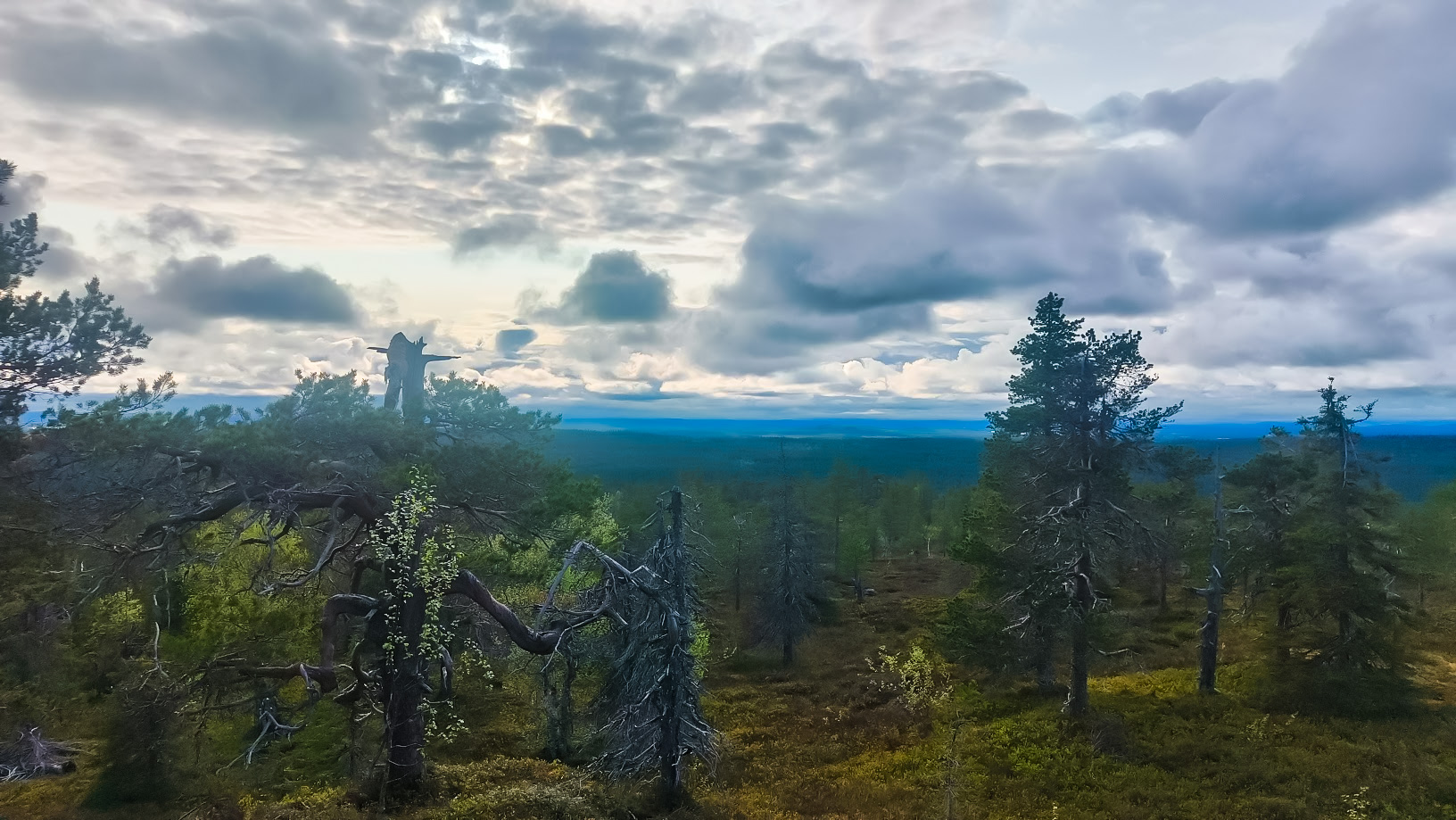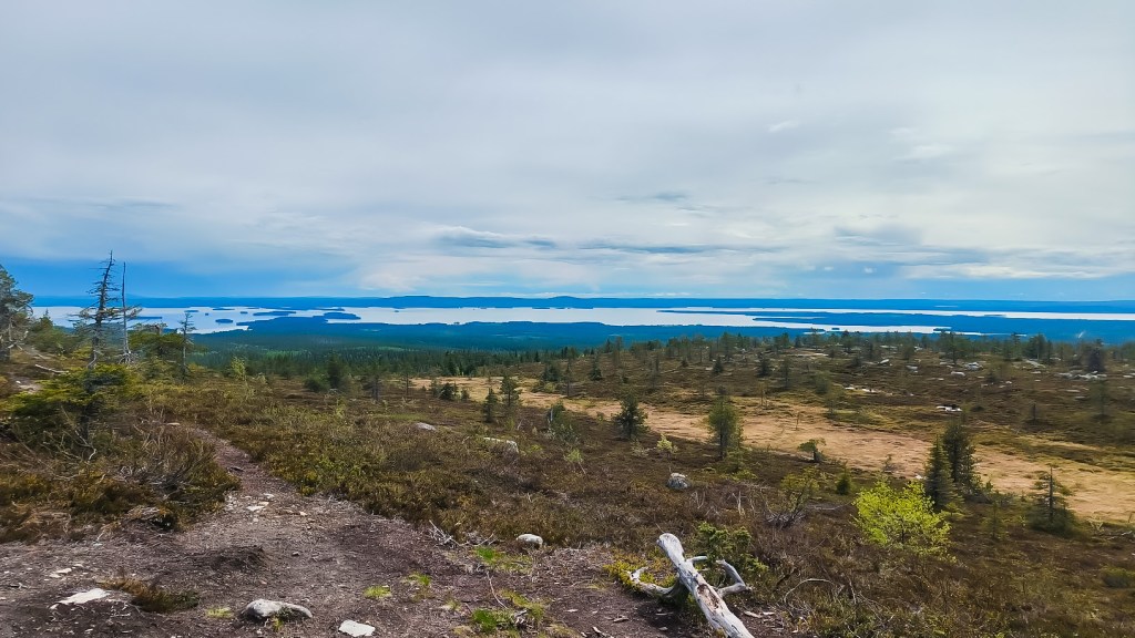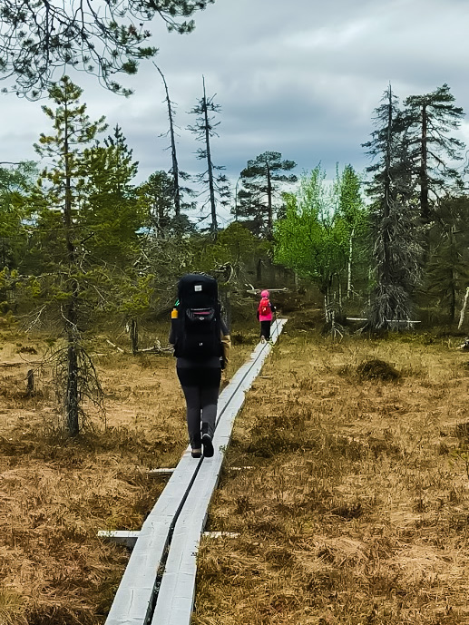 Karitunturilta matka jatkui kohti Koljatin laavua, jonne oli noin kuuden kilometrin matka. Laavulla oli tarkoituksemme syödä lounasta. Vaikka kilometrejä ei ollut paljon, olivat ne raskaita. Karitunturilta Liittolammille asti kilometrit olivat hitaita, maastossa on paljon nousua ja laskua, poluilla kiviä ja juurakoita, mutta raskainta on kuitenkin kosteikot ja suoalueet. Metsäpohja on märkää upottavaa sammalta ja polut ovat märkiä. Monin paikoin polut upottavat ja kuraa sekä rapaa riittää. Paikoin kosteikkojen yli kulkee pitkospuita, mutta ei suinkaan joka paikassa. Kosteikkoja joutuu ylittämään ihan rehellisesti myös jalan. Niinpä yhdellä kosteikkoalueella meidän perheemme saikin aivan hervottoman hersyvät naurut, kun minä painelin rinkka selässä puolijuoksua harppoen kosteikon yli. Tämä juoksuesitykseni sai nimen Jack Sparrow suojuoksu. Jokainen voi siitä mielessään kuvitella, millainen performanssi suolla siispä nähtiin. Kengät eivät säilyneet kuivana, mutta sentään naurua riitti tuossa hetkessä. Joka tapauksessa Koljatin laavun upeisiin maisemiin päästiin ja trangialla lounas valmistui.
