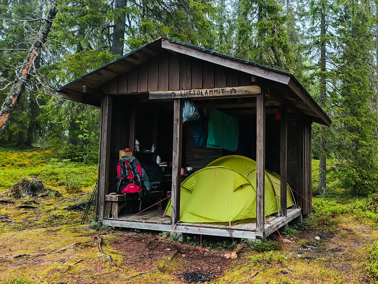Kun mälsät kaatosateessa vaelletut kilometrit ja viluisa olo oli karkoitettu, oli seuraavaksi aika tutkia teltan tilanne, missä sisällä olivat myös meidän kaikki teltalle jätetyt kamat. Oliko telttamme pitänyt kaatosateessa tuntien ajan vesisateen ulkona vai olisiko meillä vastassa märkä teltta ja märät kamat. Kurkkasimme teltan absidin ovesta sisään ja totesimme saman tien että sisäteltta oli säilynyt aivan kuivana ja tavarat siellä sisällä olivat kuivia, mutta ongelman meille loi silti sisään pyrkivä vesi. Absidin puolella vesi oli valunut teltan maavaatteen päälle ja vain 10 senttimetrin päässä sisäteltan oven suuaukosta oli iso lammikko. Sadetta ajatellen Liittolammin maasto on haastava, koska se on kalliota tai sammalmaista metsämaastoa. Kallio ei ime sadevettä itseensä, vaan vesi lähtee valumaan tai kerääntyy kallion koloihin lammikoiksi ja muutoin kallion päällä oleva mätäs taas imee itsensä täyteen vettä ollen kuin litisevä pesusieni. Meille tuli kuitenkin tässä tilanteessa kiire siirtää telttamme johonkin muualle, sillä siihen vesilammikkoon emme olisi voineet jäädä ja tarvitsimme nopeita ratkaisuja, jotta sisätelttamme säilyisi kuivana. Niinpä irrotimme telttakiilat ja myrskynarut maasta ja kannoimme telttamme kokonaisena Liittolammin katokseen, johon olimme silmämääräisesti katsoneet, että teltta voisi ehkä juuri ja juuri mahtua. Siirtoperaatio onnistui kuin onnistuikin ja saimme kivillä ja kepeillä sekä katoksen puurakenteita hyödyntäen sidottua telttamme paikalleen. Niinpä telttamme oli irti maasta katoksen alla eikä meidän tarvinnut sen koommin huolehtia siitä saisimmeko kuivat yöunet. Nauroimme kyllä tälle villille idealleni katketaksemme, että nyt oli kyllä sitä kuuluisaa boksin ulkopuolelta ajattelua, vai sanoisimmeko pikemminkin tässä tapauksessa, että boksin sisäpuolella ajattelua.