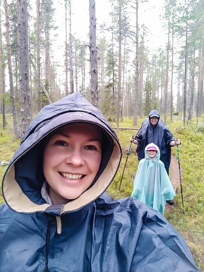 Sään puolesta en hirveän tarkkaan kyttäile säätiedotuksia etukäteen. Saatan vilkaista lähtöpäivänä tulevien vaelluspäivien säätiedotteen summittaisesti, mutta liiaksi en säätiedotusta tutkaile, että koska sataa ja koska paistaa. Yölämpötilat ovat ne, jotka ehkä eniten kiinnostavat, jotta osaa pakata yöpymistä varten sopivat vermeet, jotta saa lämpöiset unet. En pysty oikein kunnolla nukkumaan, jos minulla on yöllä kylmä. Mutta muuten säätiedotuksia en vahdi sen vuoksi, että esimerkiksi viiden päivän vaelluksella Suomen kesässä on hyvin todennäköistä, että kokee kaikenlaista säätä. On odotettavissa aurinkoa, pilvistä, sadetta, tuulta ja välillä on lämpimämpää ja välillä viileämpää. Sellainen nyt vain on Suomen kesä. Meillä ei ole staattisia säätiloja, vaan sää vaihtelee ja esimerkiksi kolmenkin päivän päähän tehty sääennuste kerkeää vielä muuttumaan moneen otteeseen. Jos siis katsoisin etukäteen säätiedotteita ja se näyttäisi vaikka koko ajalle aurinkoa, niin vaelluksella voisi tulla sitten pettymyksen fiiliksiä, jos sää olisikin muuttunut ja saadaan reippaasti vesisadetta niskaan. Niinpä on vain helpompi reaaliajassa katsoa taivaalle vaelluksella, pukea sen hetkisen sään mukaiset varusteet päälle ja ottaa vastaan se mitä taivaalta tulee. Silloin pettymyksen sijaan saakin tuntea sen energialatauksen, mikä kehoon virtaa, kun koko päivän pilvisyyden ja harmauden jälkeen yhtäkkiä pilvipeite repeääkin ja kirkas auringonpaiste osuu kasvoille ja sen lämmittävät säteet tuntuvat lempeältä kosketukselta iholla. Se on myös vaelluksella yksi ihanimpia hetkiä. Nuo auringonsäteet luovat sellaisen energiaboostin, että yhtäkkiä jalkoihin valuu lisää virtaa niin, että hetki sitten tuntunut tuskaisen pitkä jäljellä oleva kilometri sujuukin yhtäkkiä melkein hypähdellen ja vihellellen (jos vain osaisin viheltää).