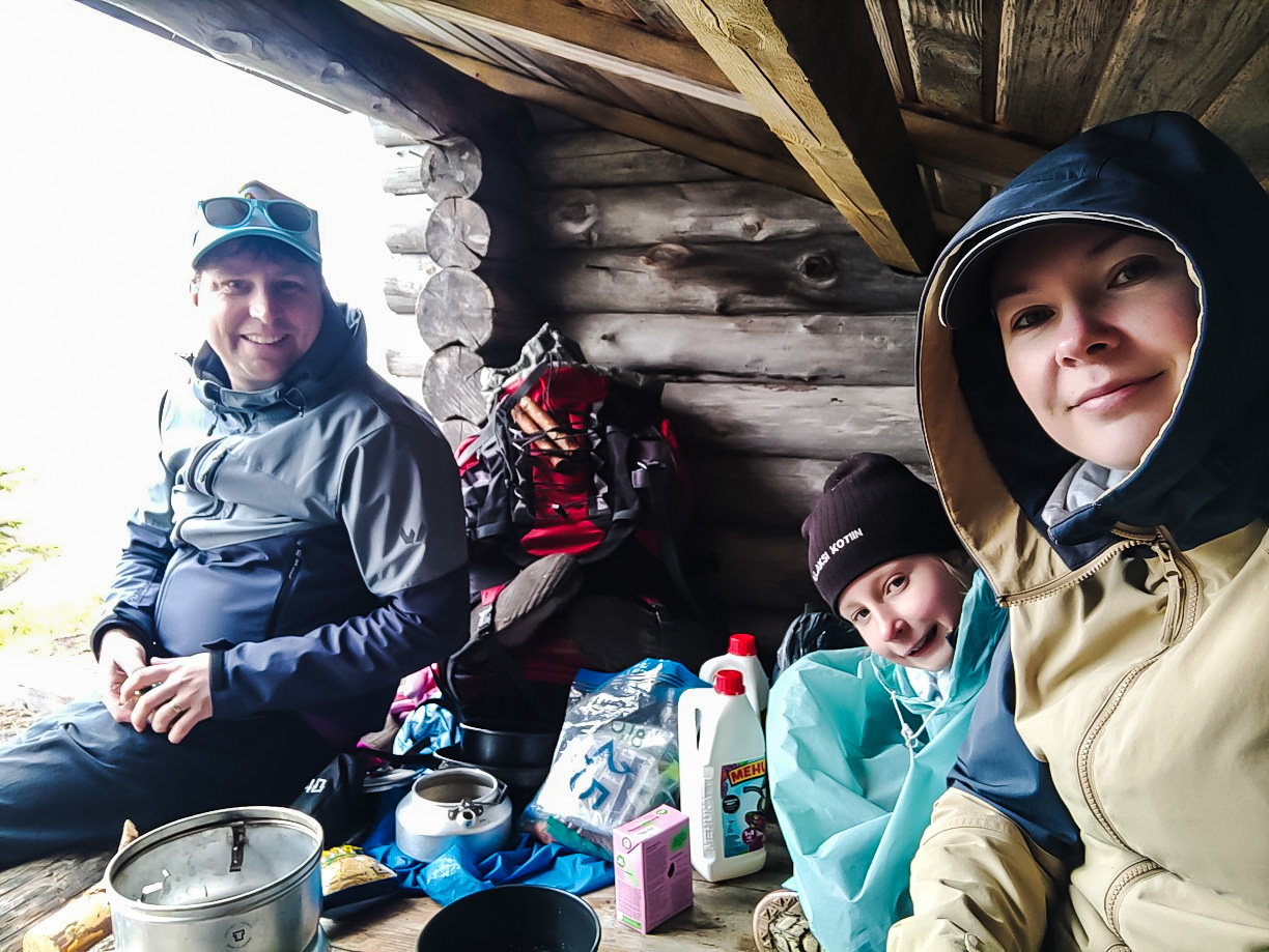 Kolmas aamu valkeni viileän yön jälkeen harmaana ja pilvisenä. Sateen uhkaa oli reilusti ilmassa ja ilma oli niin kostea, että sitä olisi melkein voinut veitsellä leikata. Laittelimme laavulla aamupuurot ja kahvit ja Alisa teki nuotiolla savutikkuja, millä hätisteli hyttysiä. Joskin tähän vuoden aikaan hyttysiä oli vielä hyvin maltillisesti jopa minun makuuni. Koko vaelluksemme aikana ei nimittäin tarvinnut kertaakaan kaivaa esille hyttyshattua eikä suihkauttaa ainoataan suihkausta hyttysmyrkkyä.