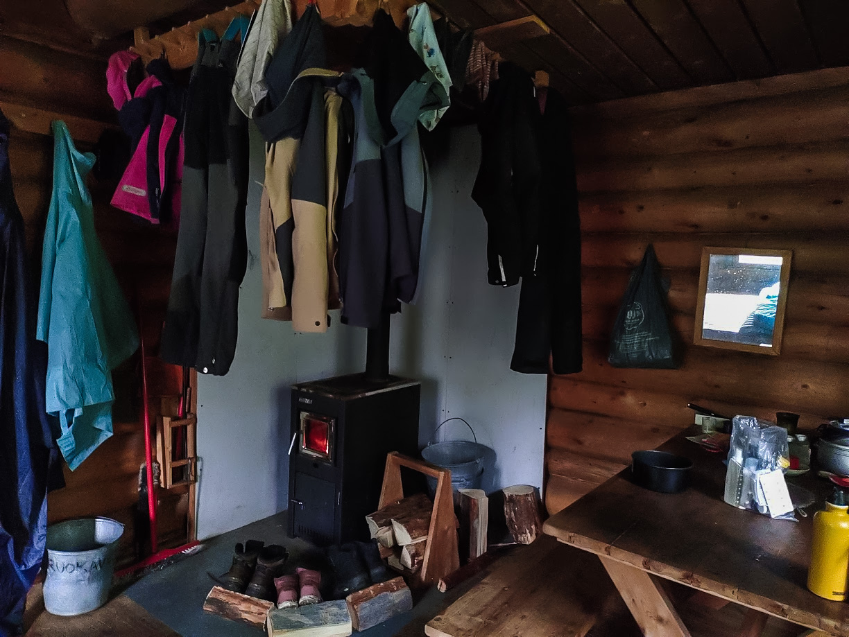 Ahmatuvalla ei näkynyt ristinsielua. Kengät olivat niin märät, että jokaisella askeleella kengässä tunsi litisevän suoveden ja kengät painoivat jaloissa varmasti kilon enempi kuin normaalisti. Laskimme kamppeemme Ahmatuvan kuistille, riisuimme kengät ja sukat jaloista ja sukista pystyi oikein puristamaan valuvaa suovettä, niin märät ne olivat. Laitoimme tulet molemmille puolille tupaa ja viritimme mukanamme olevaa narua pitkin katon rajaa pyykkinaruksi. Naruille ja seinien naulakoihin ja nauloihin nostelimme kuivumaan niin teltat, sadeviitat, vaatteet kuin kengätkin. Jopa sateessa kostunut kartta leviteltiin kuivumaan. Tuvassa oli lämmintä kuin saunassa, mutta kamppeet kuivuivat vauhdilla. Yöllä nukuimme kahden viileän telttayön jälkeen puolestaan sitten oikein lämpöiset yöunet tuvan lavereilla.
