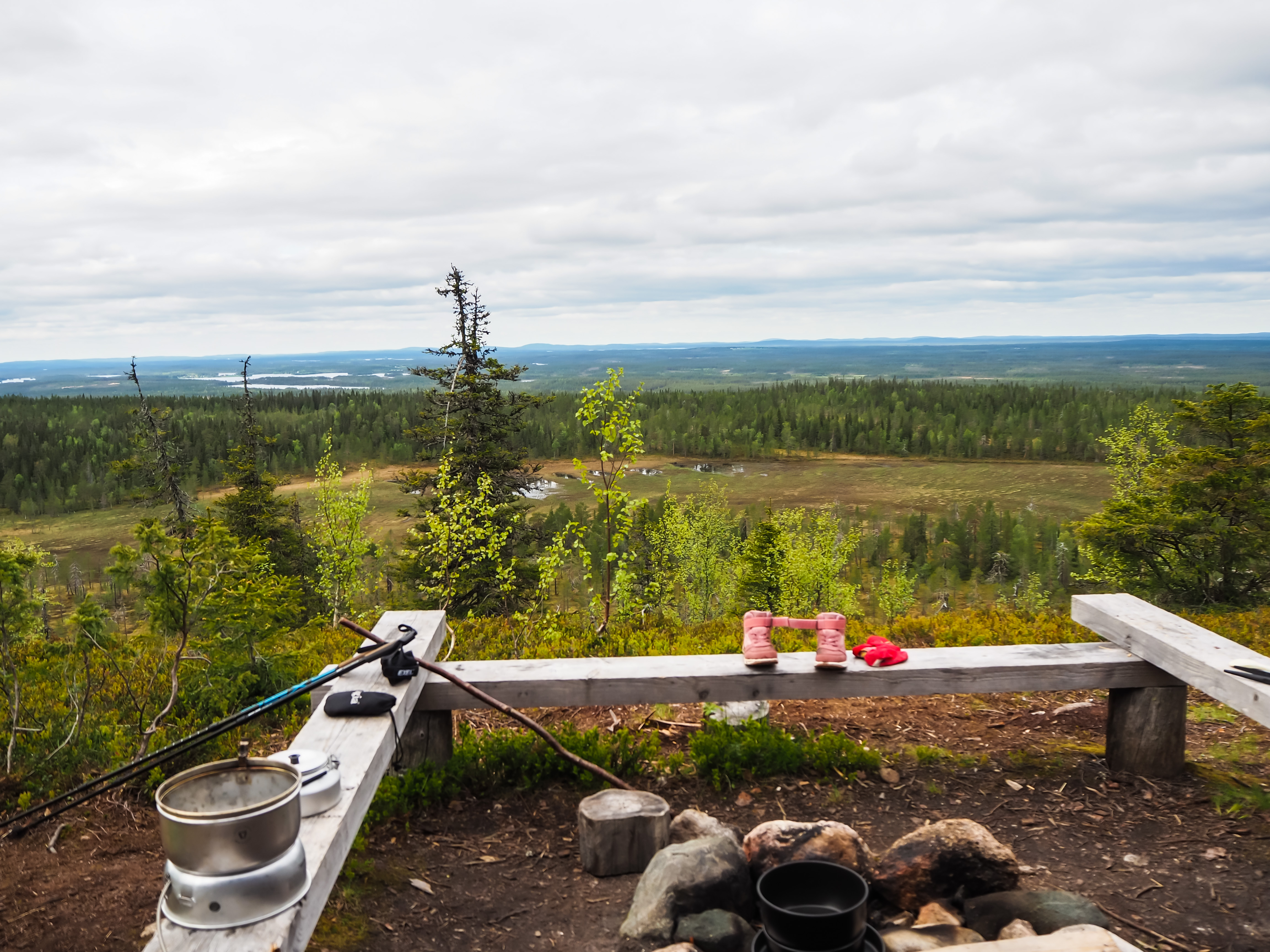 Raskaiden, soisten polkujen jälkeen terottui kyllä selvästi taas, miksi sanotaan, että parasta vaelluksissa on syödä eväitä upeissa maisemissa. Koljatin laavu on nimittäin niin oikeaan paikkaan maisemia ajatellen sijoitettu kuin vain kuvitella saattaa. Korkealta tunturilla sijaitsevalta laavulta aukeaa häkellyttävän upeat maisemat, joita mieli rauhoittuu haltioituneena katsomaan. Kyllä niissä maisemissa nuudelitkin maistuvat huomattavasti paremmilta.