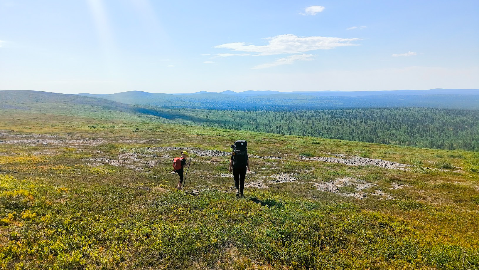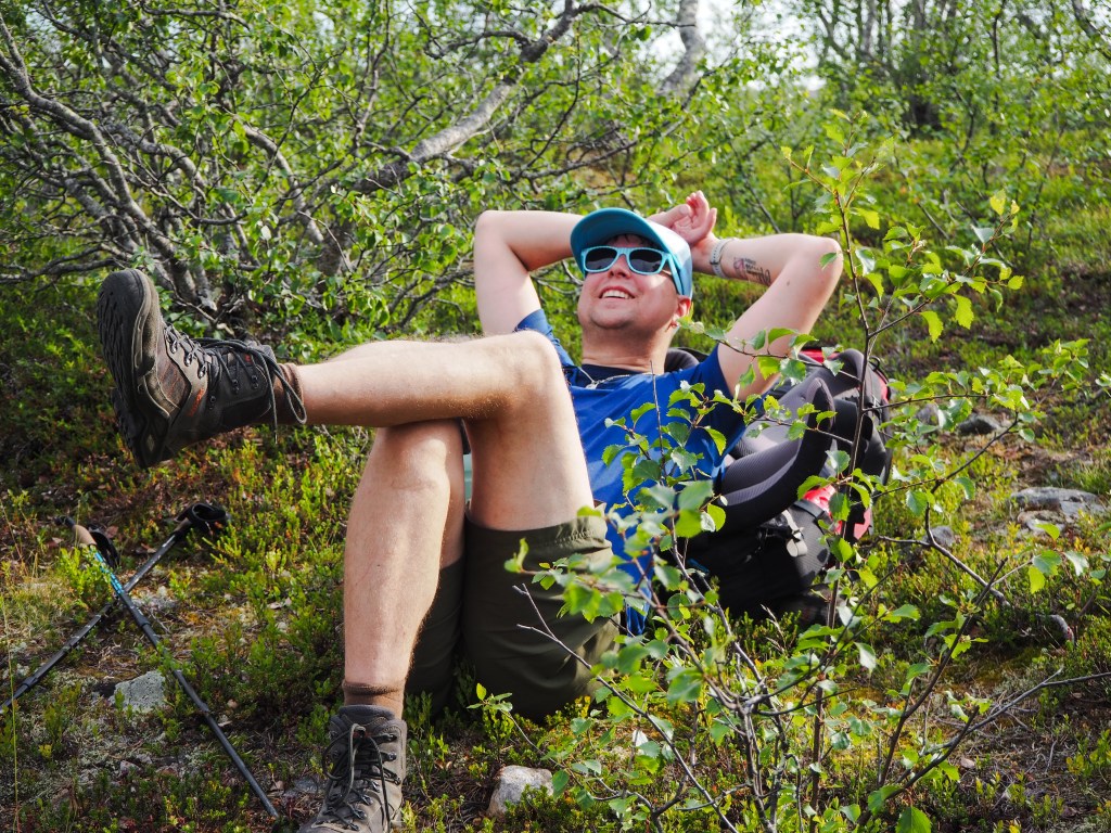 Päivän matkasta oli 13 kilometriä jo taitettu ja 8 kilometriä suurin piirtein vielä jäljellä, joten syötyämme ja levättyämme oli aika jatkaa matkaa. Ei muuta kuin eteen päin MARS, tai itse asiassa jos tarkkoja ollaan niin ylös päin MARS. Nimittäin edessä oli ehdottomasti päivän kovin koitos. Tuiskukurun tupa on nimensä mukaisesti kurun pohjalla. Sinne oltiin laskeuduttu pitkä lasku ja sieltä lähtiessä edessä on puolestaan pitkä nousu. Lähdimme etenemään Tuiskupäiden eteläpuolelta kohti Ampupäitä. Edessä oli kolmen kilometrin nousu, joten kaikki lounaalla tankatut kalorit tulivat nyt tarpeeseen. Nousu on välillä jyrkempää, välillä loivempaa ja mahtuu sinne välille muutama tasaisempikin hetki, mutta pääsääntöisesti suunta on ylöspäin, kun noustaan Ampupäiden kupeeseen. Korkeimmalta kohdalta ennen kuin laskeutuminen kohti Luirojärveä alkaa, saa jo maistiaisia jylhästä Sokostin tunturimassiivista, jolle alkaa avautua näkymiä tunturikoivikon lomitse. Näkymät eivät vielä ole esteettömiä, mutta kutkuttavasti Sokostia voi jo fiilistellä ja kurkistella koivikon lomitse. Näissä maisemissa olikin ihanaa viettää juomataukoa tiukan nousun jälkeen ja hetki hengittää ja levähtää.