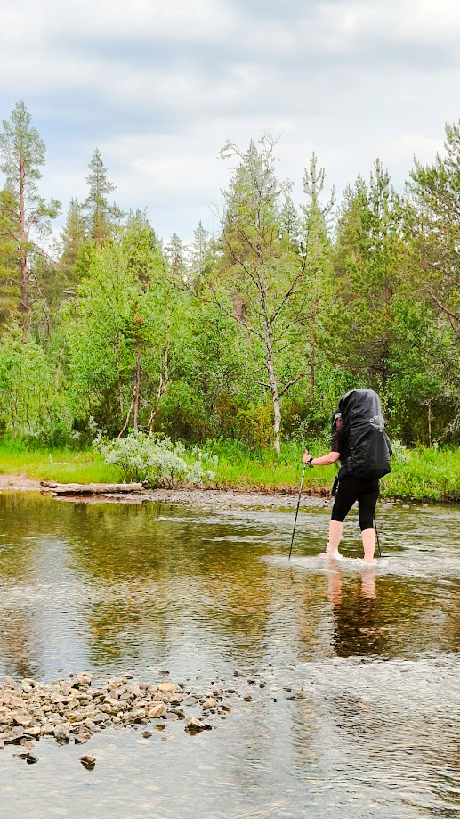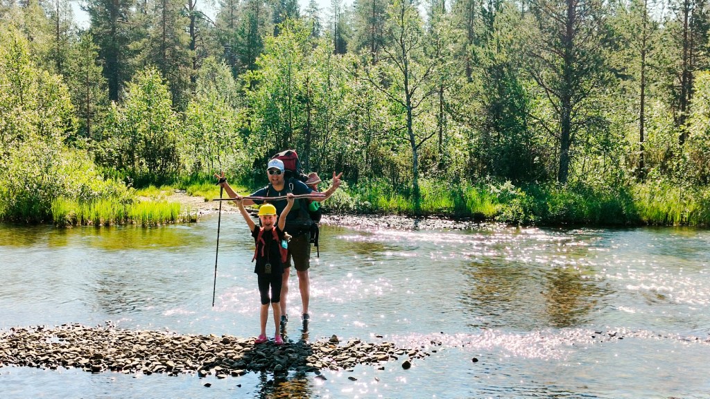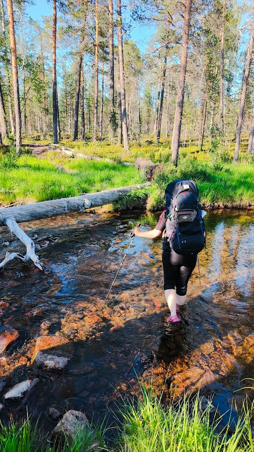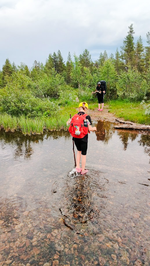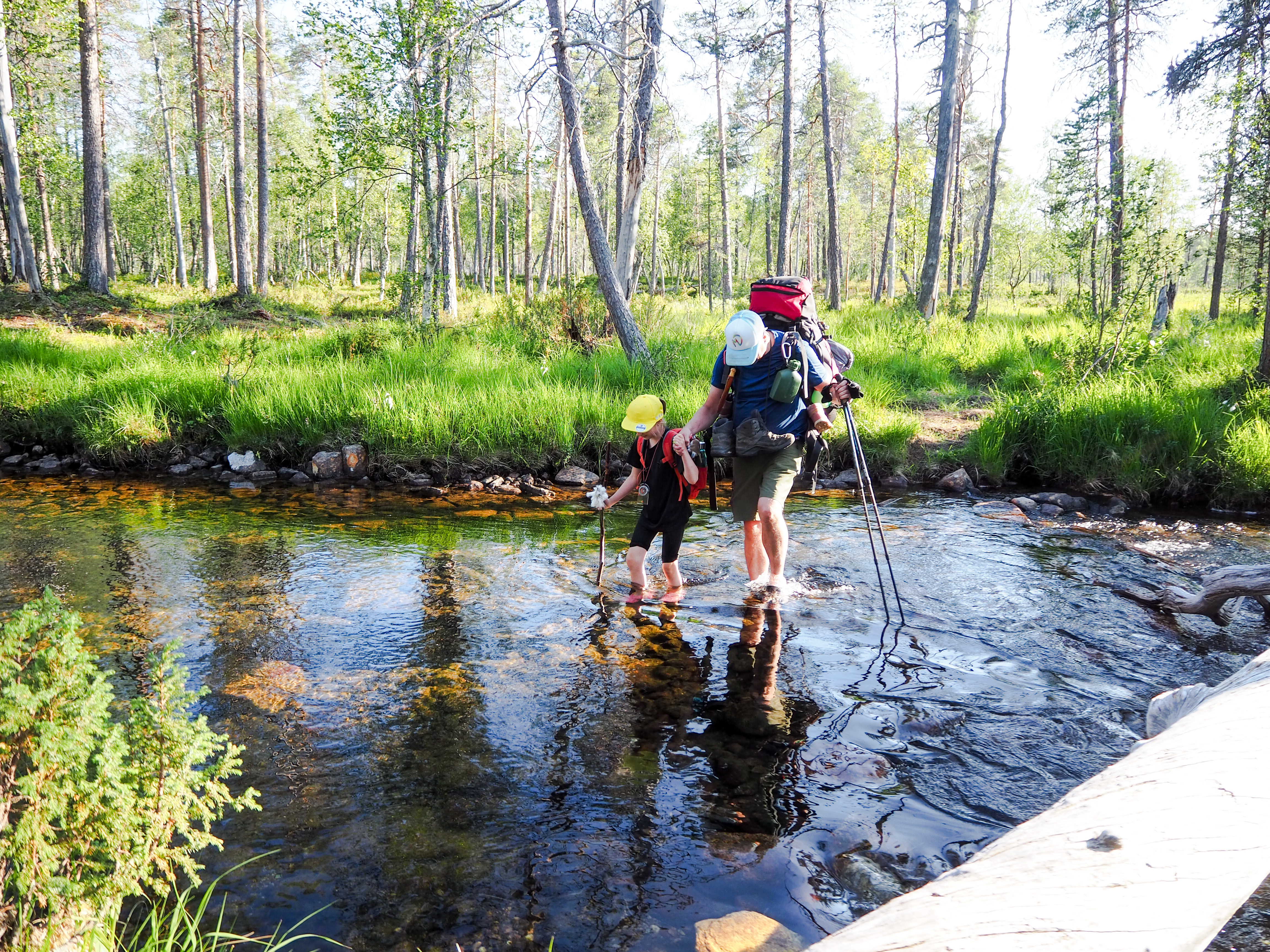 Ennen tupaa saavutaan kuitenkin vielä Luirojoelle, jossa oli vaelluksemme ensimmäinen kahluu tiedossa. Saavuttuamme joen rantaan, oli joesta todella helppoa löytää sopiva, tarpeeksi matala kahluupaikka, missä olisi maltillinen virtaus. Meillä kahluupaikat määritellään aina lapsen pituuden ja voimien mukaan. Läheskään kaikki kahluupaikat, joista aikuinen ihminen selviäisi, eivät ole sopivia alakouluikäiselle lapselle, joten sen vuoksi aina hieman jännittää, onko karttaan merkityt kahluupaikat aikuisen lisäksi sopivia myös lapselle. Mutta tämä joki oli vallan hyvin ylitettävissä myös 9-vuotiaan lapsen toimesta. Ei muuta kuin vaelluskengät jalasta pois, crocsit jalkaan, vaellussauvat tueksi ja jokea ylittämään. Helpon ylityksen jälkeen olimme jo niin lähellä Luirojärven tupaa, ettemme vaihtaneet enää vaelluskenkiä takaisin jalkaan, vaan lompsimme suoraan tuvan kuistille crocsit jalassa. 21 kilometriä taitettu tältä päivältä.