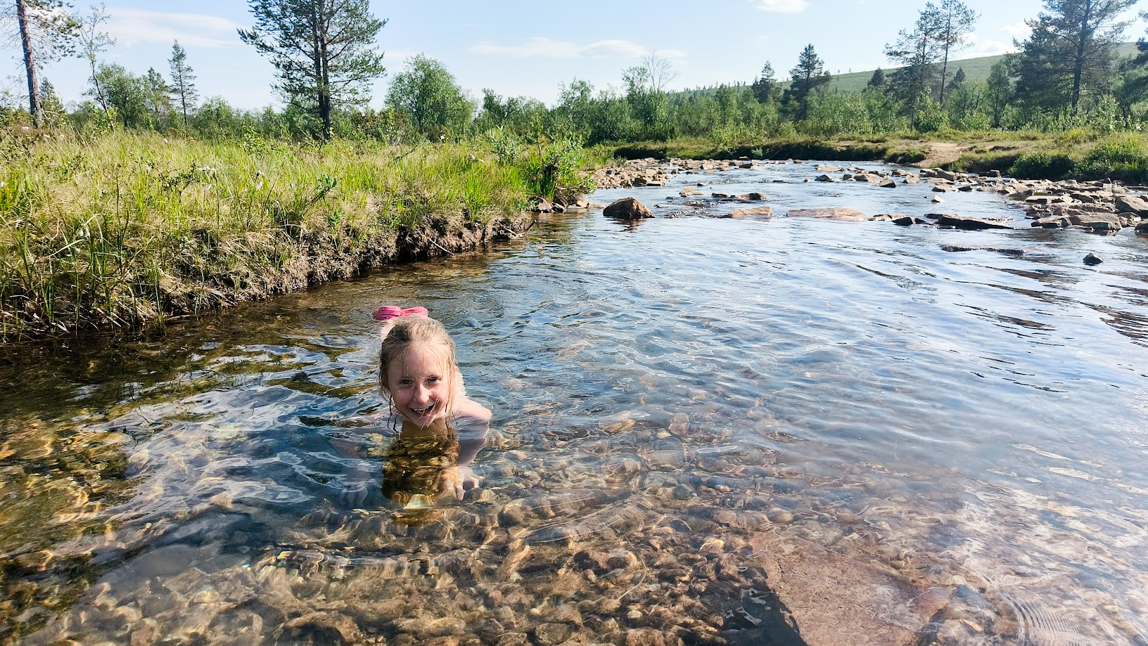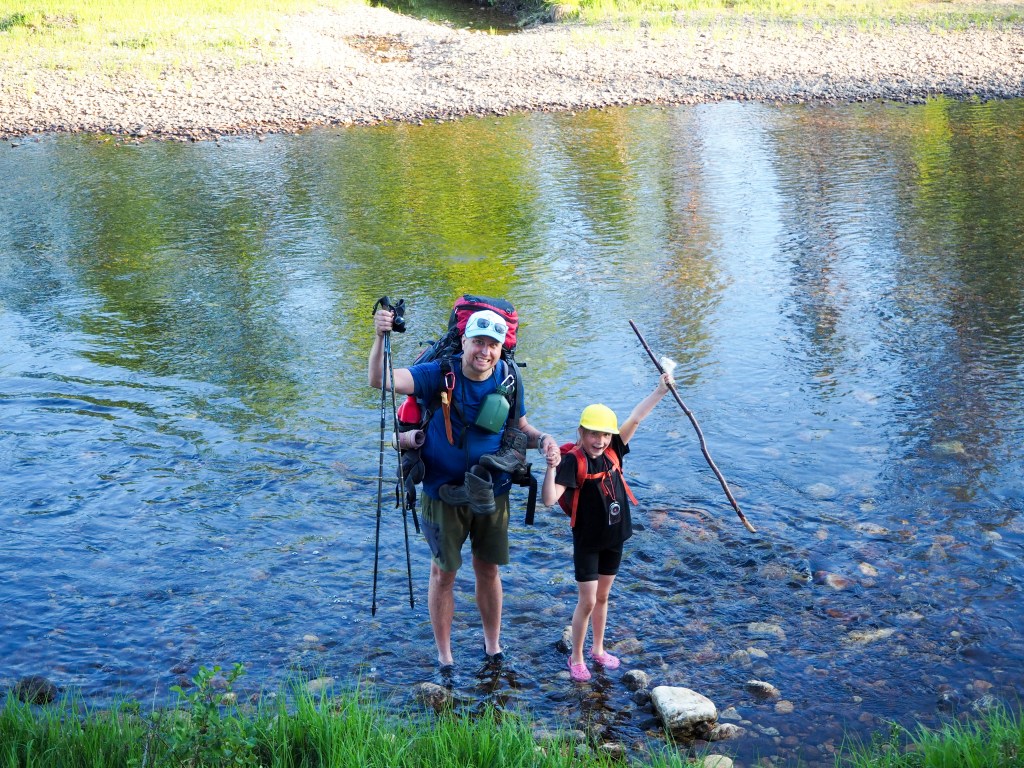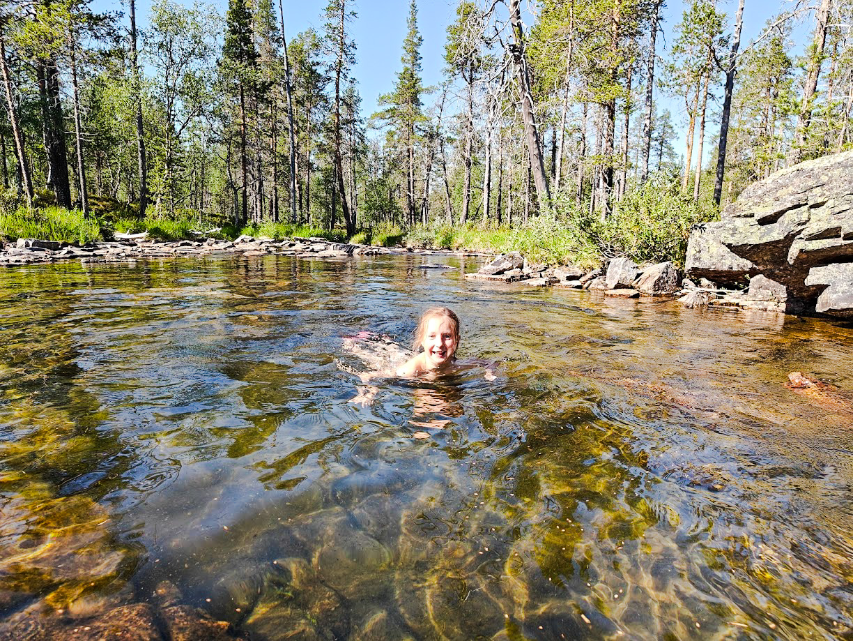 Ennen tupaa saavutaan kuitenkin vielä Luirojoelle, jossa oli vaelluksemme ensimmäinen kahluu tiedossa. Saavuttuamme joen rantaan, oli joesta todella helppoa löytää sopiva, tarpeeksi matala kahluupaikka, missä olisi maltillinen virtaus. Meillä kahluupaikat määritellään aina lapsen pituuden ja voimien mukaan. Läheskään kaikki kahluupaikat, joista aikuinen ihminen selviäisi, eivät ole sopivia alakouluikäiselle lapselle, joten sen vuoksi aina hieman jännittää, onko karttaan merkityt kahluupaikat aikuisen lisäksi sopivia myös lapselle. Mutta tämä joki oli vallan hyvin ylitettävissä myös 9-vuotiaan lapsen toimesta. Ei muuta kuin vaelluskengät jalasta pois, crocsit jalkaan, vaellussauvat tueksi ja jokea ylittämään. Helpon ylityksen jälkeen olimme jo niin lähellä Luirojärven tupaa, ettemme vaihtaneet enää vaelluskenkiä takaisin jalkaan, vaan lompsimme suoraan tuvan kuistille crocsit jalassa. 21 kilometriä taitettu tältä päivältä.