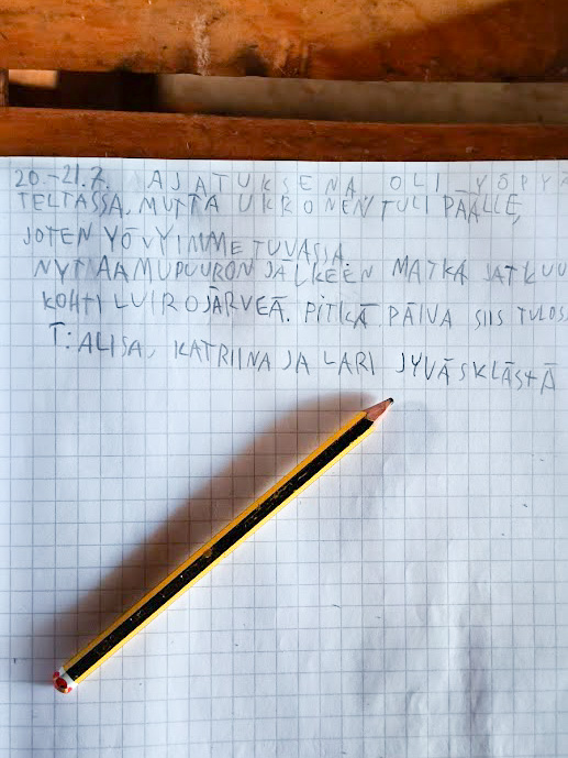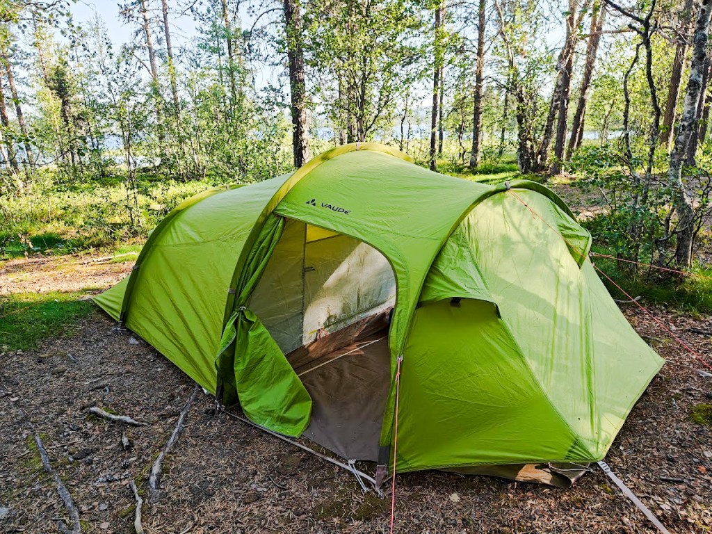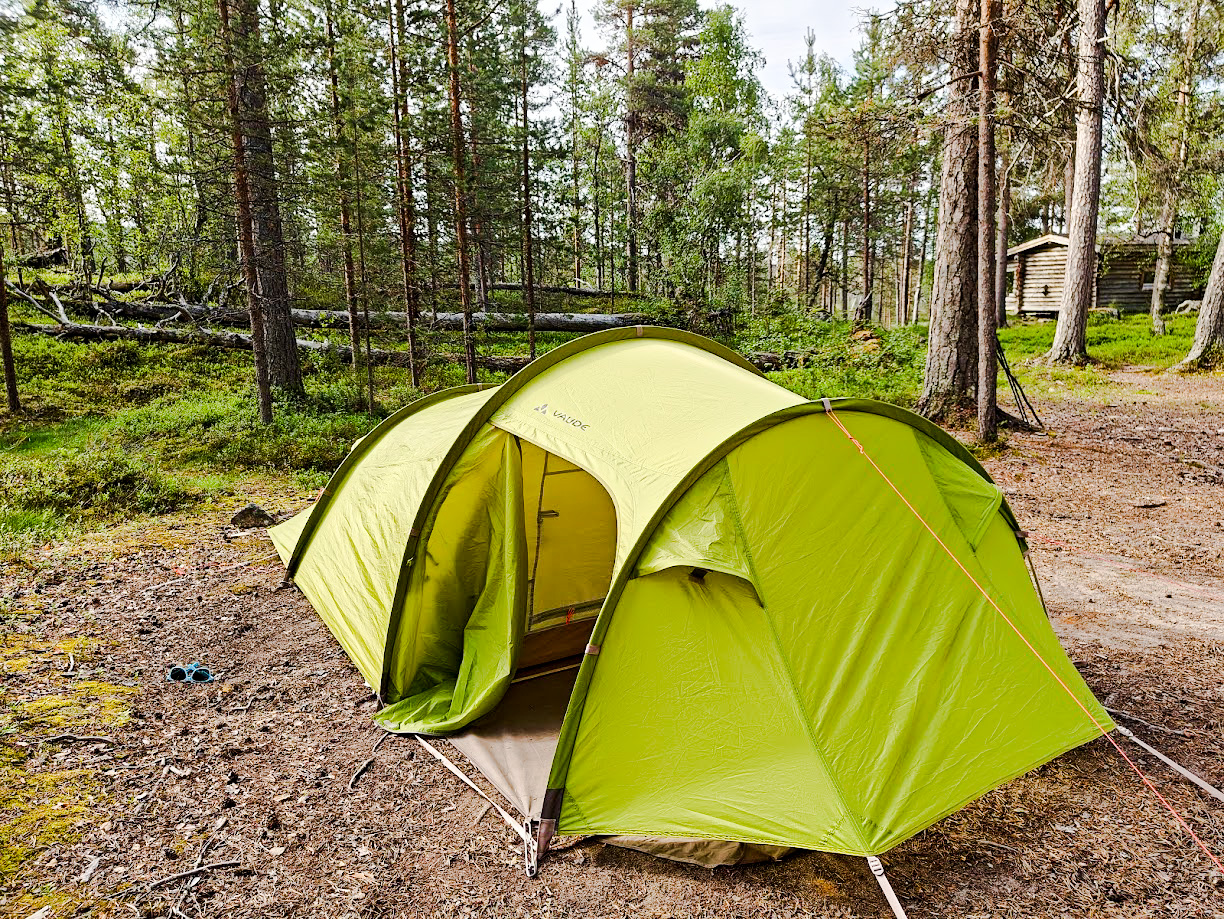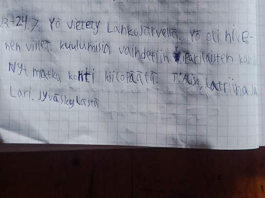Lankojärvellä oli jälleen elämää, tällä kertaa toinen ripariporukka oli levittäytynyt pitkin maita ja mantuja telttailemaan alueelle. Me löysimme tuvan takaa kuitenkin rauhallisen paikan teltallemme, pystytimme teltan, laitoimme tuvassa iltapalan ja iltapesujen jälkeen painuimme nukkumaan teltan rauhaan. Tupa olisi ollut tyhjä, siellä oli vain kamina päällä ja ripariporukan märkiä kenkiä kuivumassa, mutta me halusimme silti rauhalliset, häiriöttömät yöunet teltassa. Yö oli selvästi aiempia öitä viileämpi ja makuupussiin saikin jo laittaa hieman lämpimämpää villavaatetta päälle.