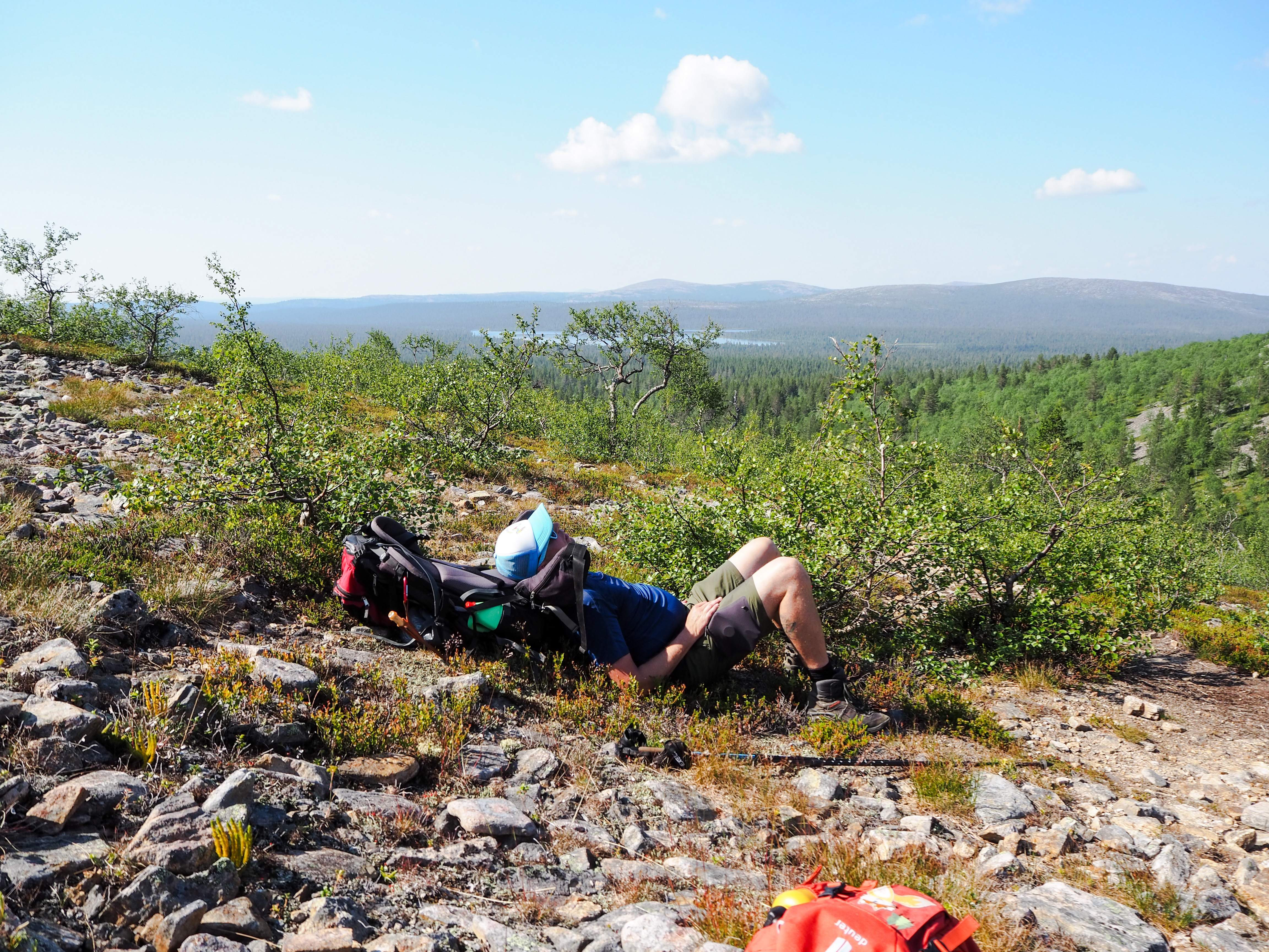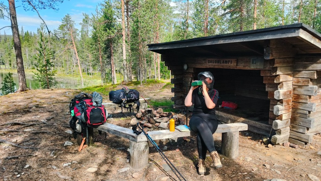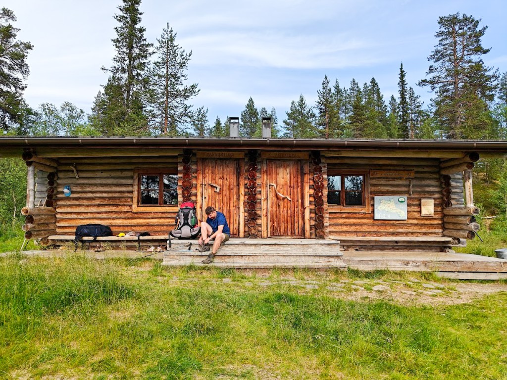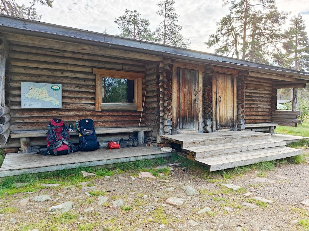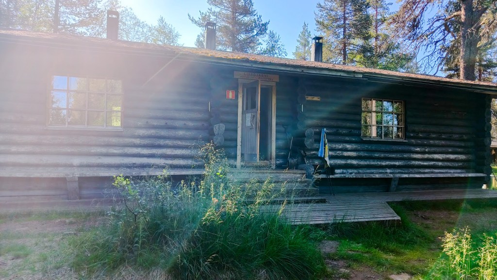 Lämpöä oli +30 astetta, helle oli paahtavan kuumaa, aurinko porotti armottomasti ja juomavettä kului jatkuvasti paljon. Aurinkorasvaa sai käyttää heti aamusta alkaen ja lisätä pitkin päivää useasti ja vettä sai juoda niin paljon kuin muisti, jotta matkanteko pysyi mukavana ja jotta terveysriskeiltä, kuten auringonpolttamilta ja nestehukalta vältyttiin. Tuiskukurun tuvalla paarmat olivat taas tehneet paluun ja niitä pörräsi laumoittain tuvan pihapiirissä. Me suuntasimme kuitenkin tuvan sisälle, viileään ja varjoon hetkeksi karkuun paahtavaa kuumuutta. Päivän kilometrit tuntuivat jaloissa, joten oli hyvä hetki ottaa hieman lepoa selällään tuvan laverilla. Söimme lounasta ja vaihdoimme kuulumisia tuvalle samaan aikaan kanssamme osuneiden retkeilijöiden kanssa, jotka näimme lähtöpäivänä Kiilopäällä, mutta joiden kanssa sen jälkeen reittimme olivat kulkeneet eri reittejä.