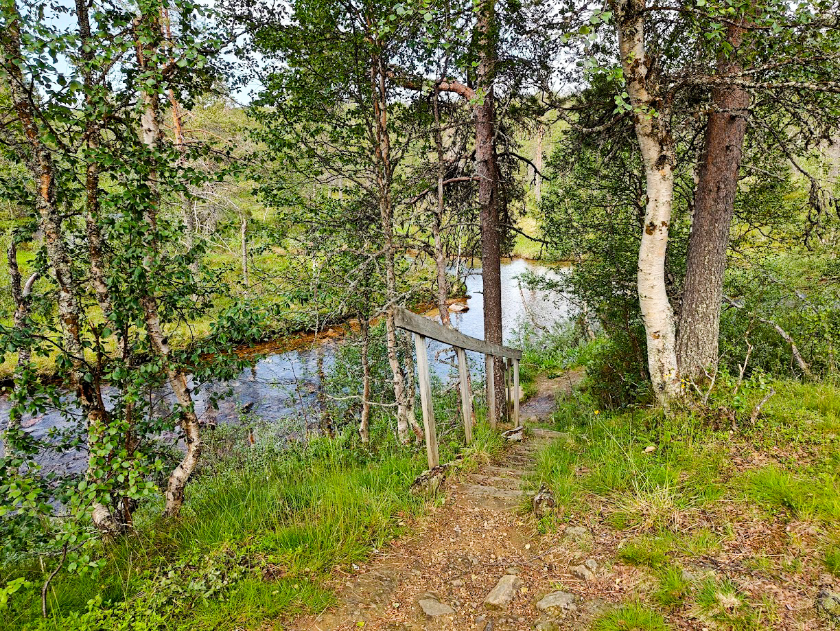 Lounaan jälkeen matka jatkui Palovanganjoen vartta seuraillen ohi Paasjoen tulipaikan sekä myöhemmin Padagovan tulipaikan. Polku oli selkeästi painautunut maastoon ja matkaa taitettiin tasaisessa maastossa metsäisessä maisemassa. Padagovan tulipaikan jälkeen tuli Palovanganjoen ylityskohta, jossa joki ylitettiin kahlaten. Vettä oli alle polven ja virtaus ylityspaikalla maltillinen, joten Alisakin ylitti joen omin jaloin. Nämä ylitykset kylmässä virtaavassa jokivedessä tarjoavat ihanan virkistyshetken kilometreistä rasittuneille jaloille.