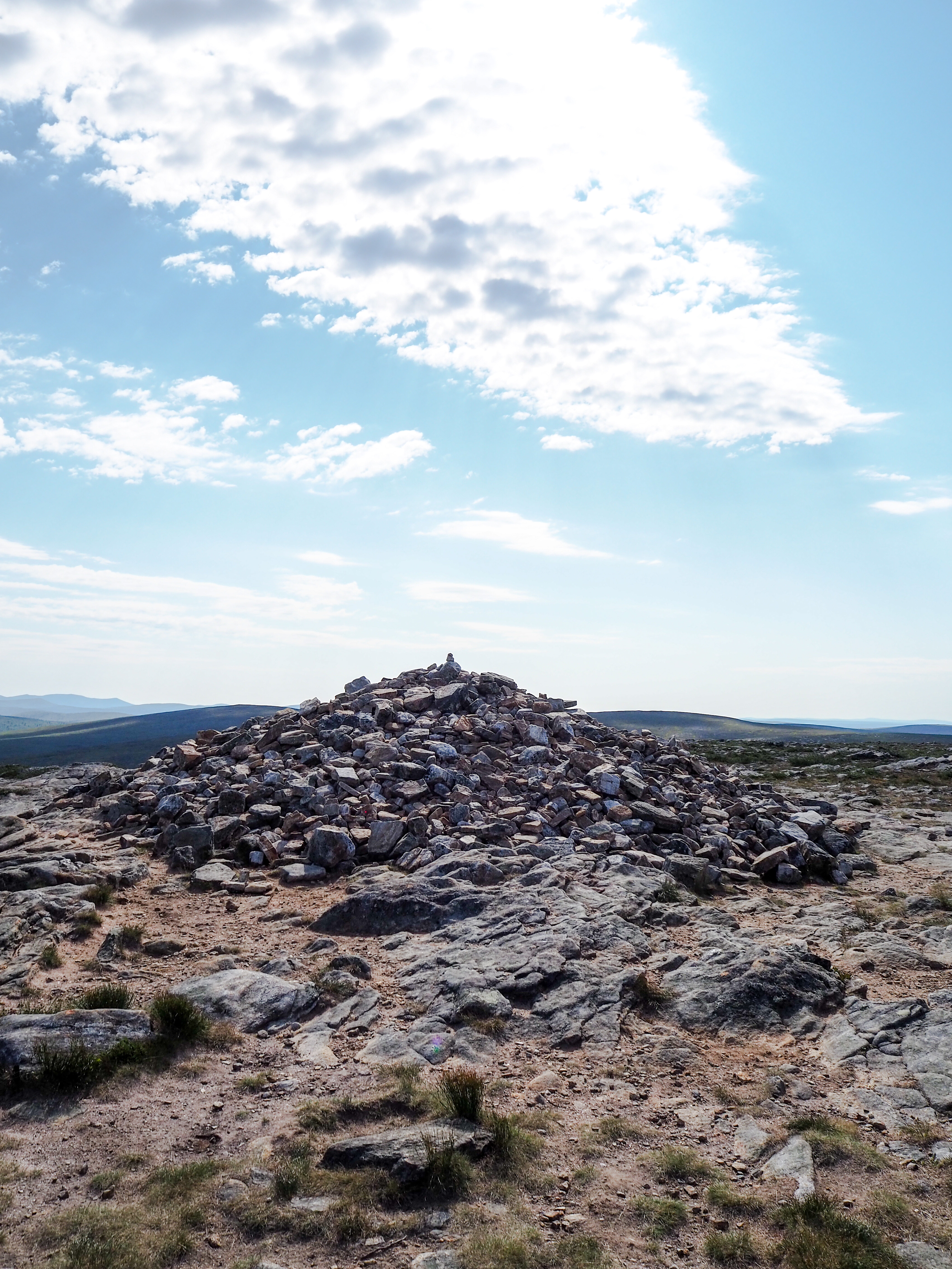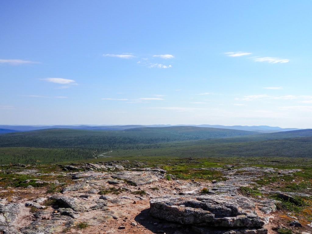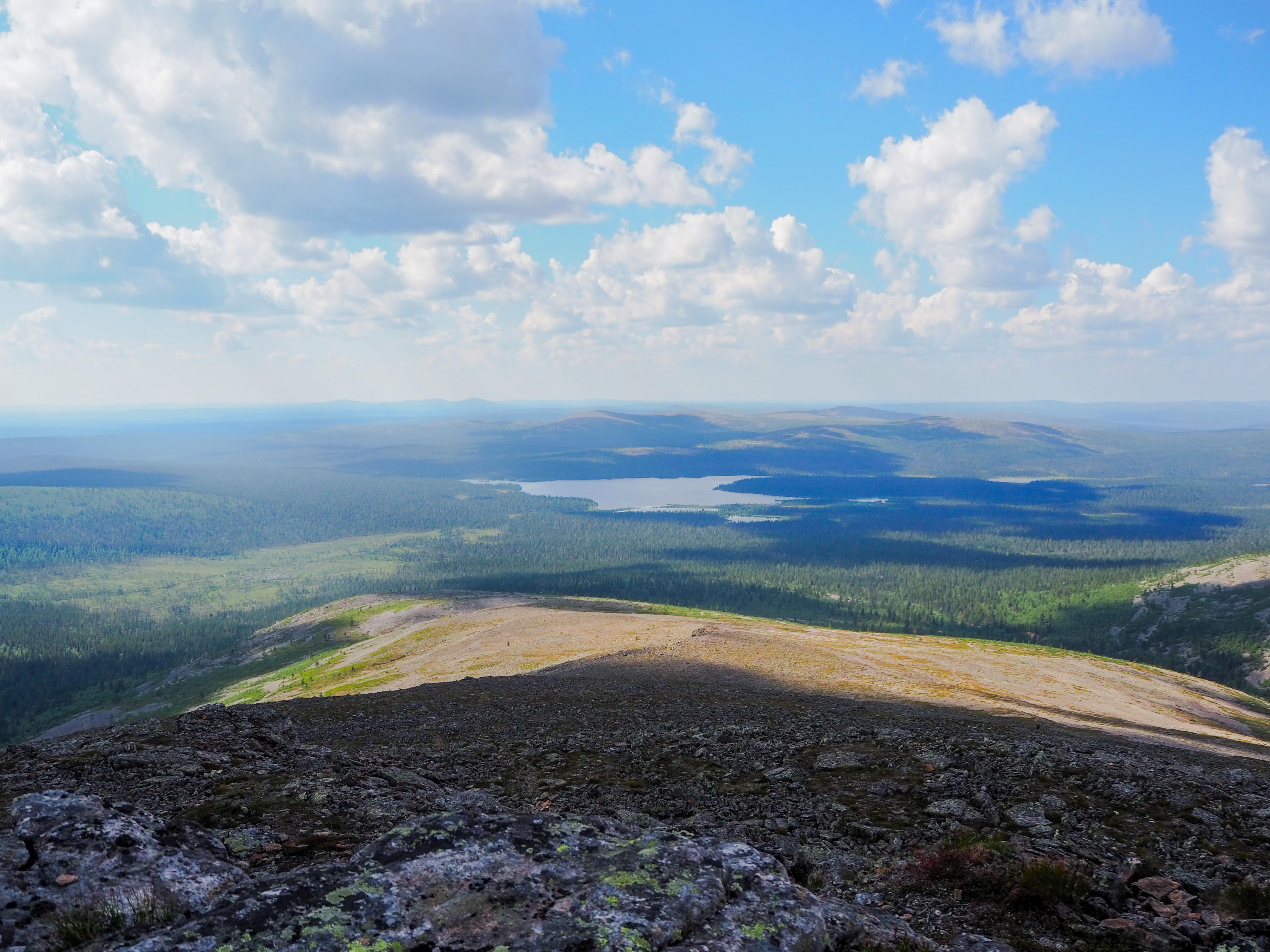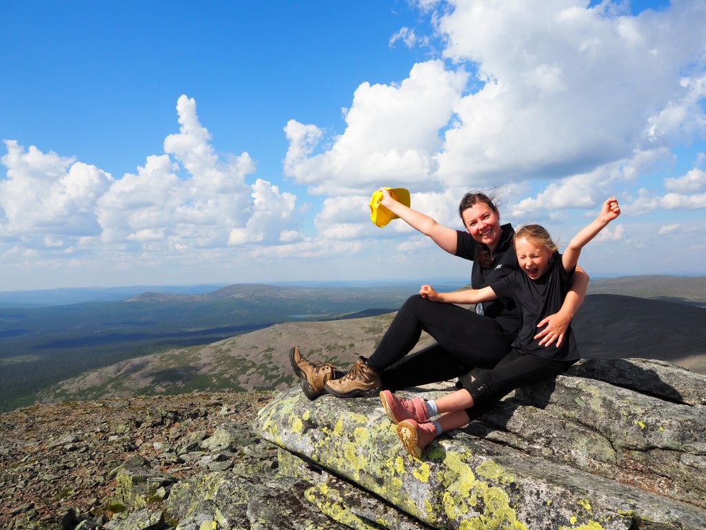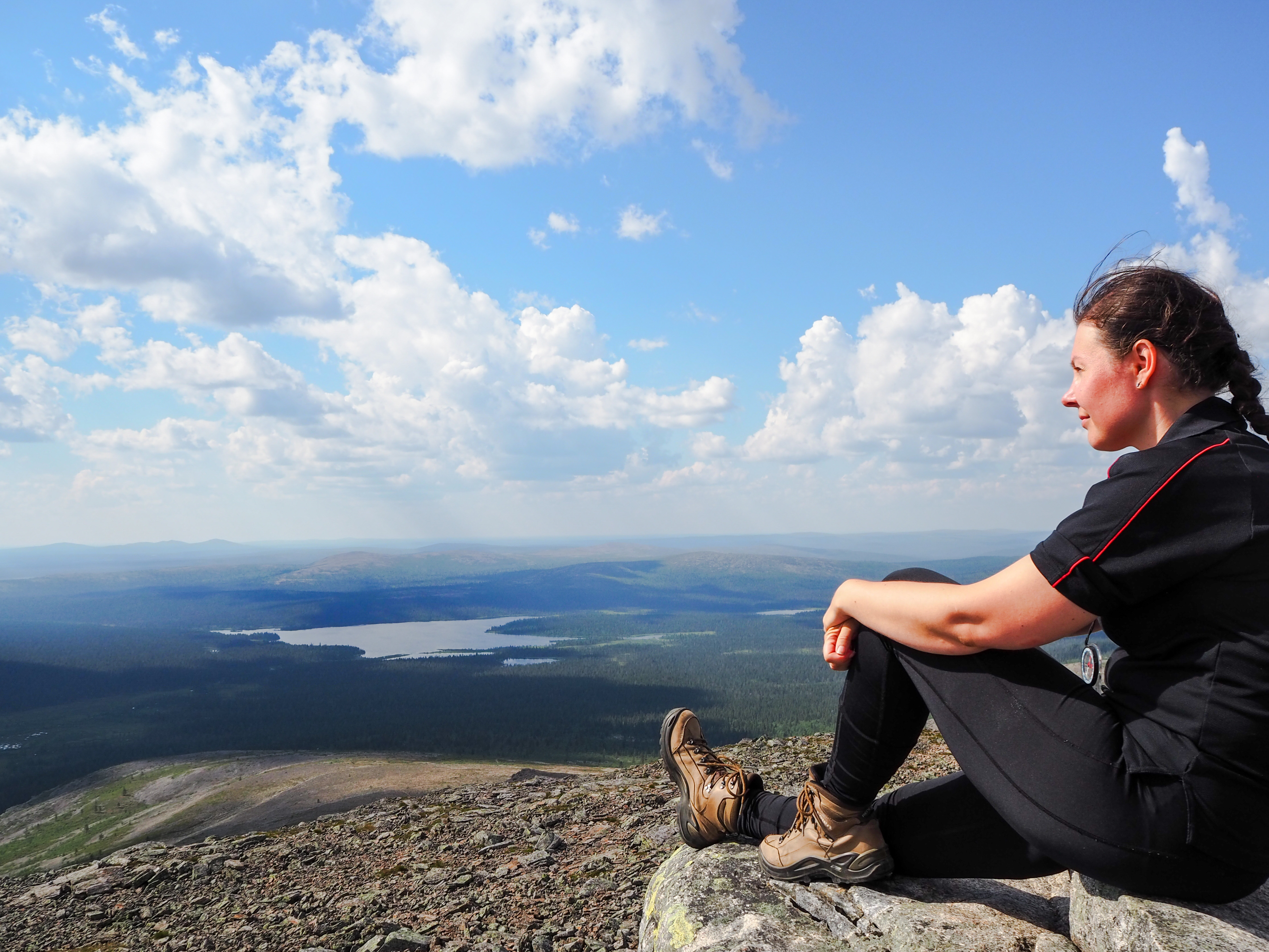 Lopulta olimme huipulla. Sokosti on itäisen Lapin ja Urho Kekkosen kansallispuiston korkein tunturimassiivi, jolla on useita sivuhuippuja ja korkein huippu kohoaa 718 metrin korkeuteen. Kroppa oli kuuman nousun jälkeen aivan piipussa ja ensimmäinen viisiminuuttinen oli vain pakko maata selällään, antaa kropan ja jalkojen levätä ja hengityksen tasaantua. Saman tien kun rinteeltä nousi huipulle, tunsi myös tuulen, jota ei nousun aikana tuntenut. Napakka, viileä tuuli pyyhki huippua ja se tuntui niin hyvältä. Tuuli viilensi helteessä ja nousussa kuumenneen kehon ja kuivatti hiestä märän t-paidan muutamissa minuuteissa. Olo lähti tasaantumaan nopeasti. Tasaisella kalliolla oli mukava makoilla ja Alisa tuli kainaloon kaveriksi lepäilemään. Hetken vielä odottelimme Laria huipulle ja siinä kaikessa rauhassa katselimme selällään sinisellä taivaalla lipuvia pilviä. Lepohetken jälkeen olikin taas hyvä nousta virkeänä huipulle ihastelemaan joka suuntaan hämmästyttävän upeita maisemia ja napsimaan valokuvan toisensa perään.