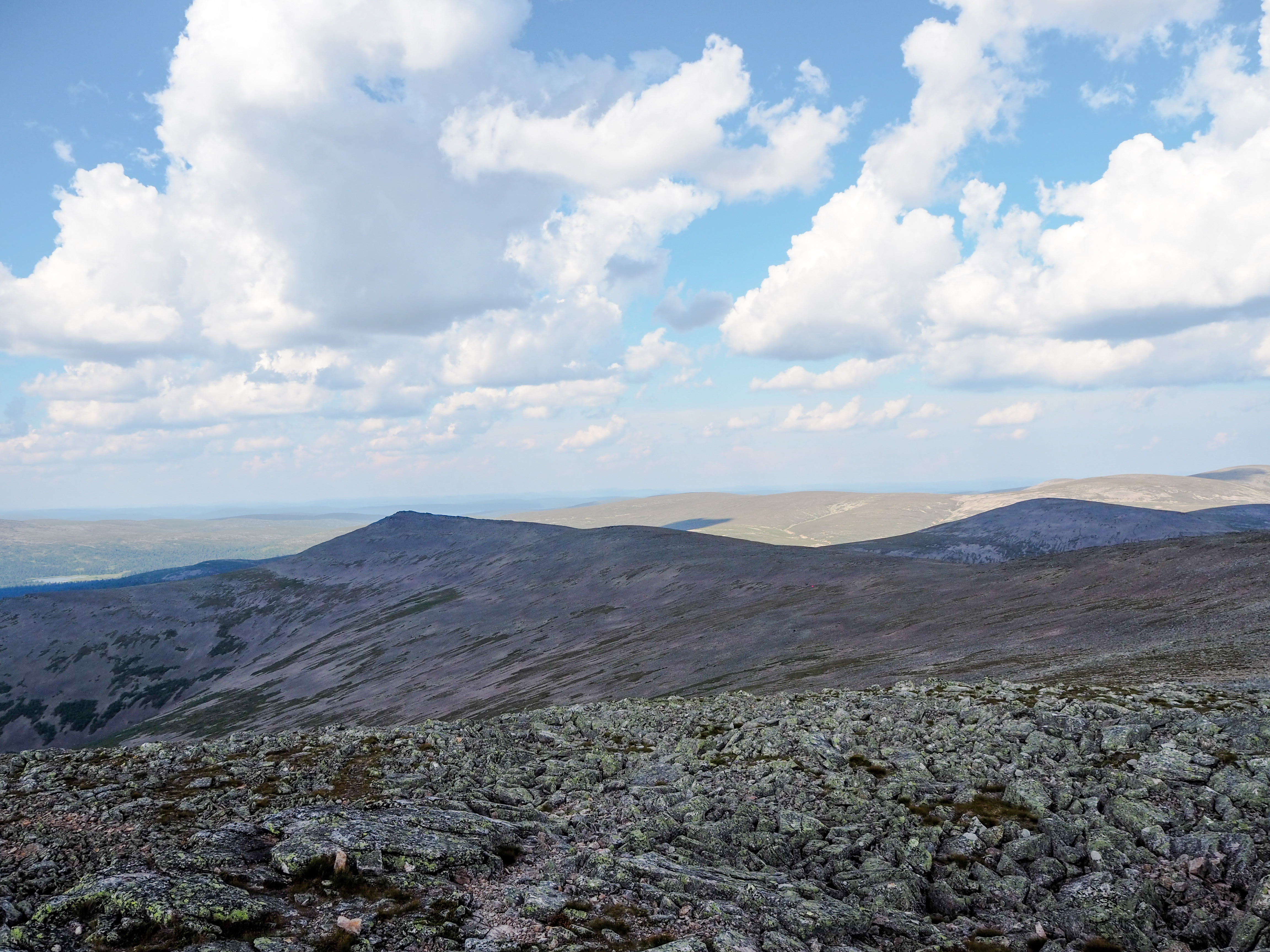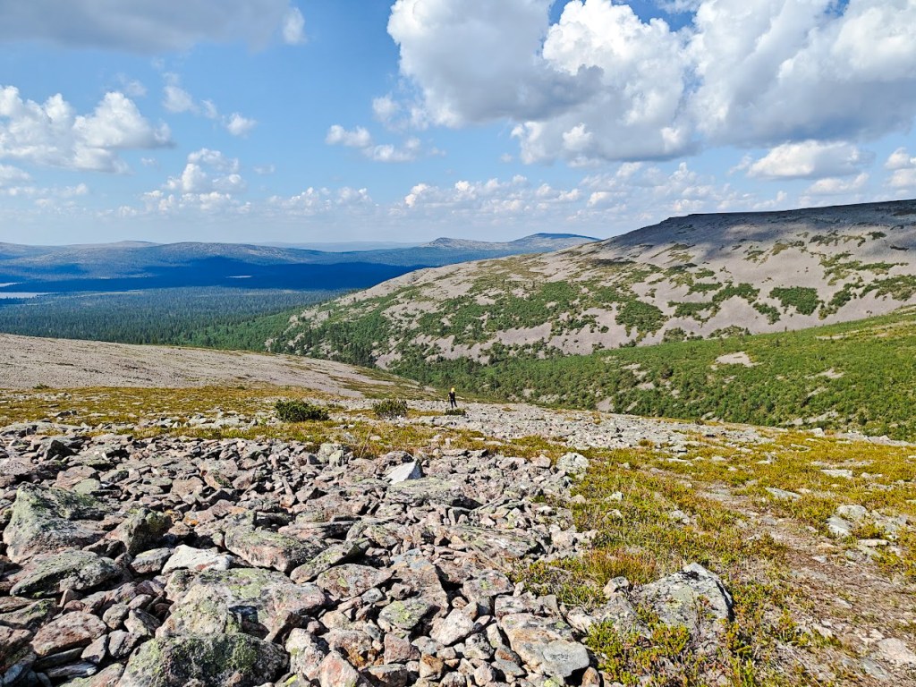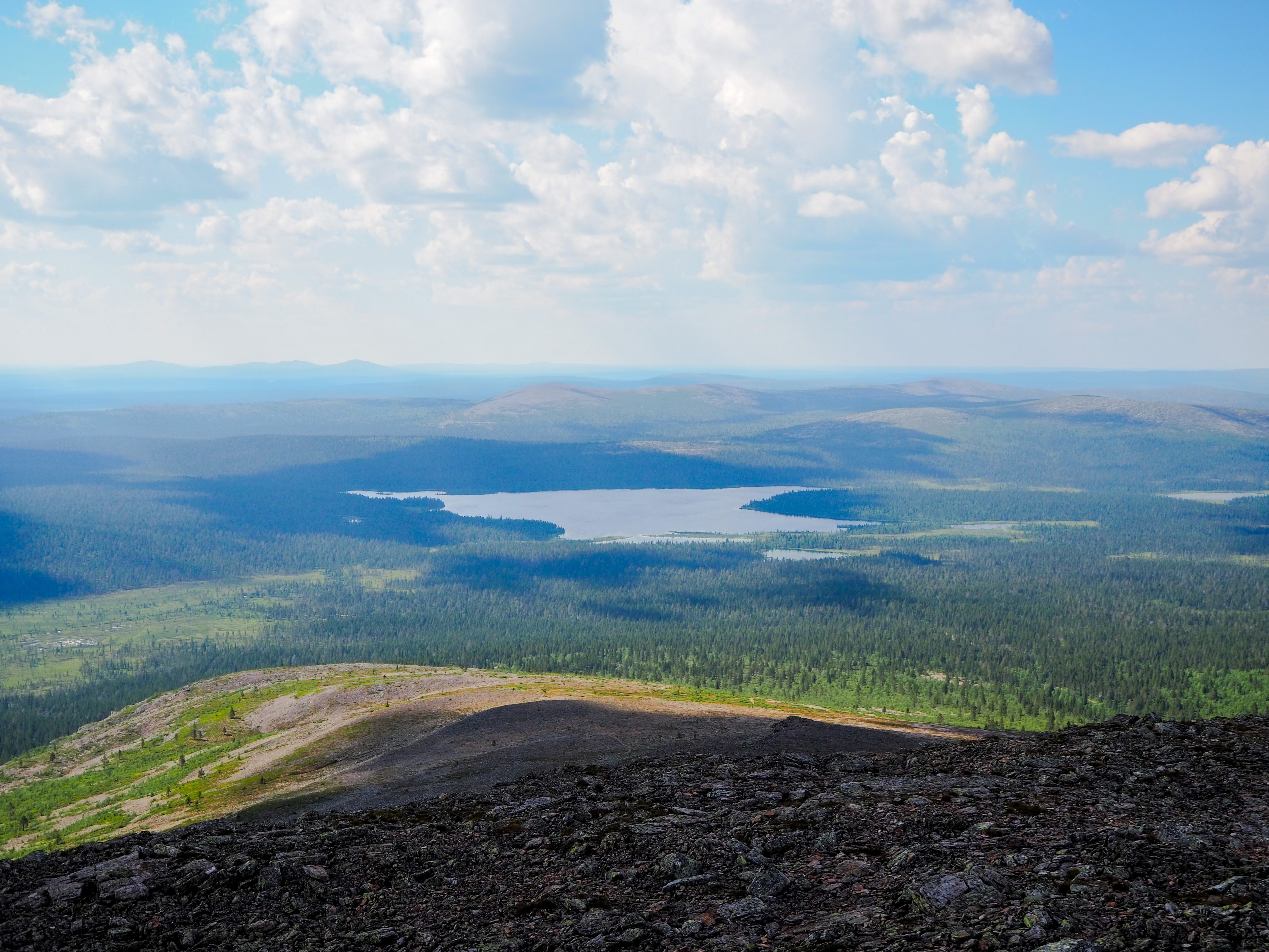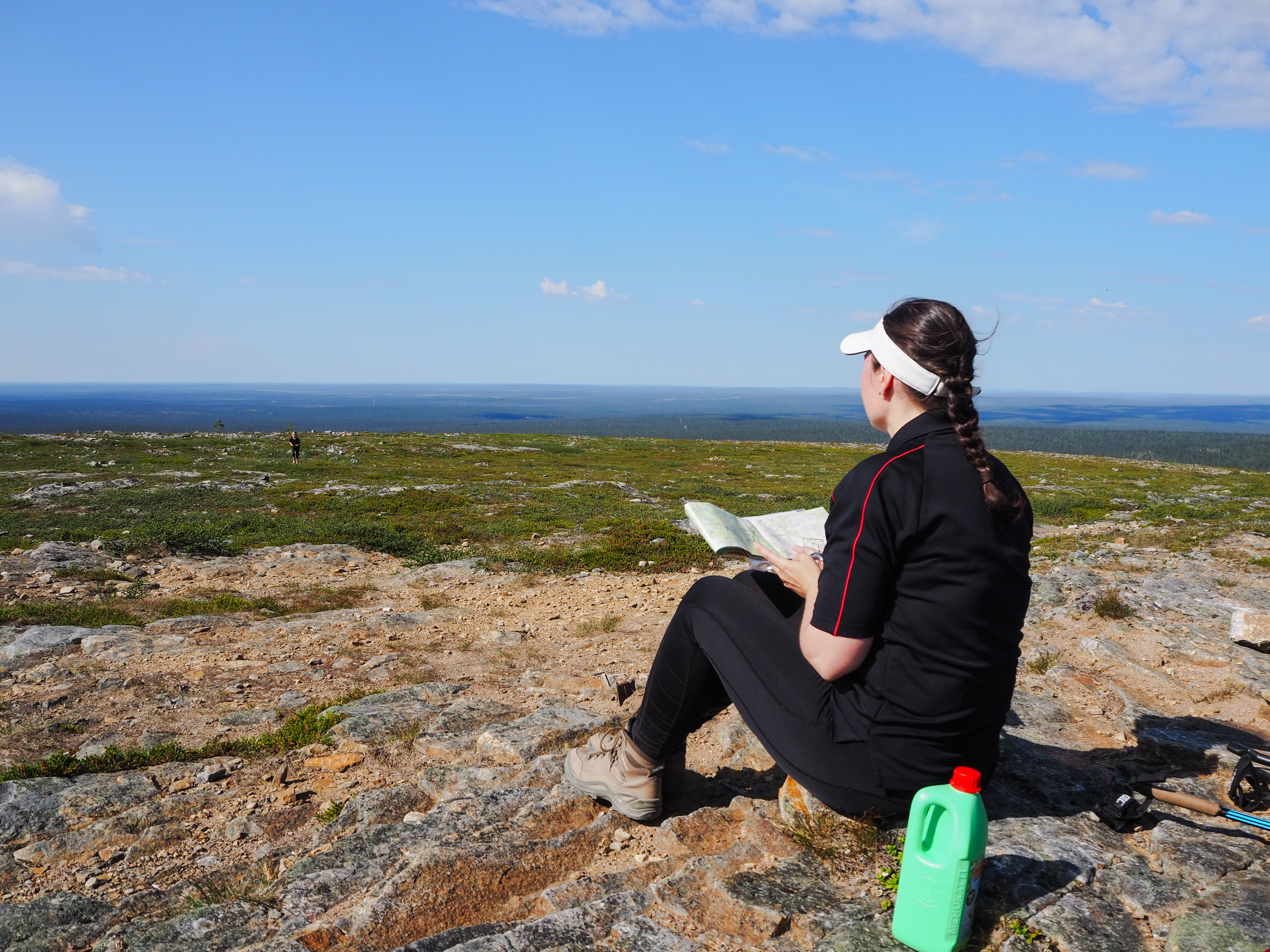 Lopulta olimme huipulla. Sokosti on itäisen Lapin ja Urho Kekkosen kansallispuiston korkein tunturimassiivi, jolla on useita sivuhuippuja ja korkein huippu kohoaa 718 metrin korkeuteen. Kroppa oli kuuman nousun jälkeen aivan piipussa ja ensimmäinen viisiminuuttinen oli vain pakko maata selällään, antaa kropan ja jalkojen levätä ja hengityksen tasaantua. Saman tien kun rinteeltä nousi huipulle, tunsi myös tuulen, jota ei nousun aikana tuntenut. Napakka, viileä tuuli pyyhki huippua ja se tuntui niin hyvältä. Tuuli viilensi helteessä ja nousussa kuumenneen kehon ja kuivatti hiestä märän t-paidan muutamissa minuuteissa. Olo lähti tasaantumaan nopeasti. Tasaisella kalliolla oli mukava makoilla ja Alisa tuli kainaloon kaveriksi lepäilemään. Hetken vielä odottelimme Laria huipulle ja siinä kaikessa rauhassa katselimme selällään sinisellä taivaalla lipuvia pilviä. Lepohetken jälkeen olikin taas hyvä nousta virkeänä huipulle ihastelemaan joka suuntaan hämmästyttävän upeita maisemia ja napsimaan valokuvan toisensa perään.