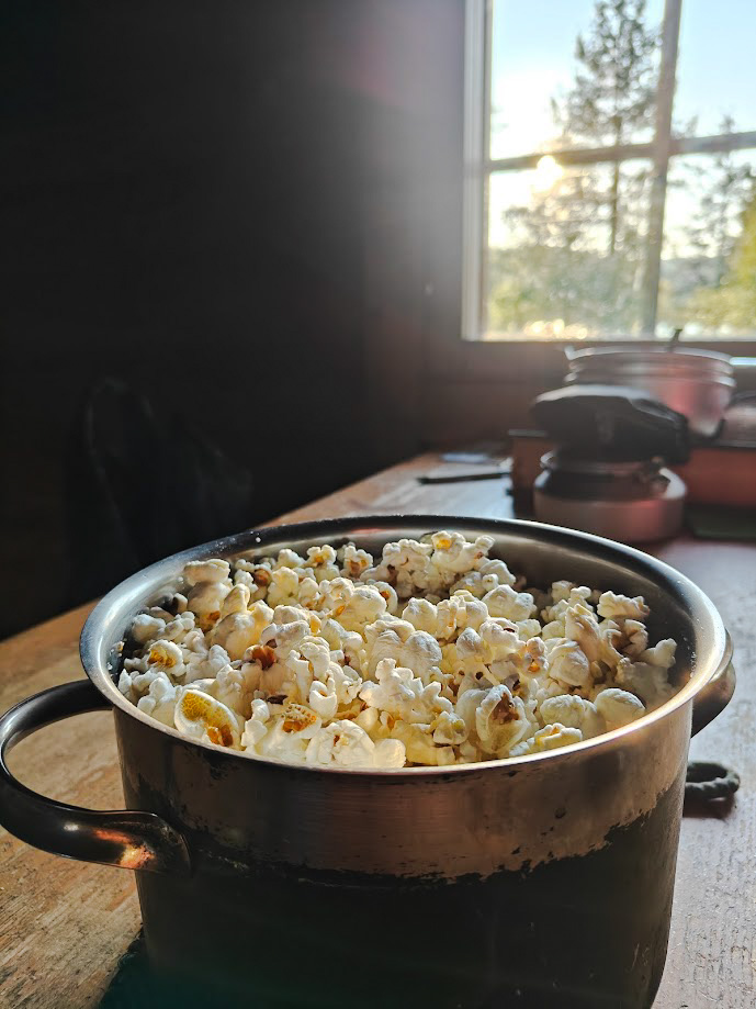 Saunan ja järven raikkaina ja puhtaina suuntasimme tupaan valmistamaan vielä iltapalaa, jonka jälkeen valmistimme kattilassa maissinjyvistä popcornia. Kolmen vaelluspäivän fyysisen rasituksen ja saunan lempeiden löylyjen jälkeen oli aika luksusta myös herkutella kattilallisella popcornia. Koska meillä oli käytössämme tuvan fasiliteetit, pieni kaasuliesi ja tuvasta löytyvä kattila, valmistimme popcornit niiden avulla, mutta retkiolosuhteissa popcornit onnistuvat täydellisesti myös trangian kaasulla ja trangian kattilassa, testattu on! Eli tästäpä vinkki jokaiselle takataskuun seuraavia vaellusherkkuja pohtiessa.