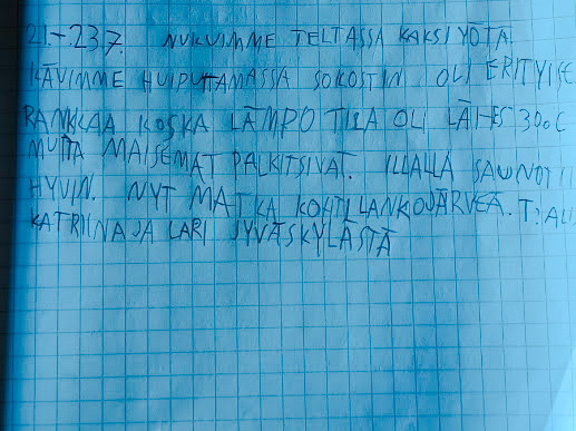 Illan sateista ei aamulla taas ollut tietoakaan, vaan heräsimme hyvin nukkuneina aurinkoiseen päivään. Taivas oli sininen ja päivästä oli tulossa jälleen kuuma. Hyvin nukutun yön jälkeen aamumme oli hidas ja kiireetön. Kömmimme teltasta jalkeille ja keittelimme puurot ja kahvit tuvassa ilman kiirettä mihinkään. Aamutoimien jälkeen matkaan pääsimme vasta klo 11 aikaan.