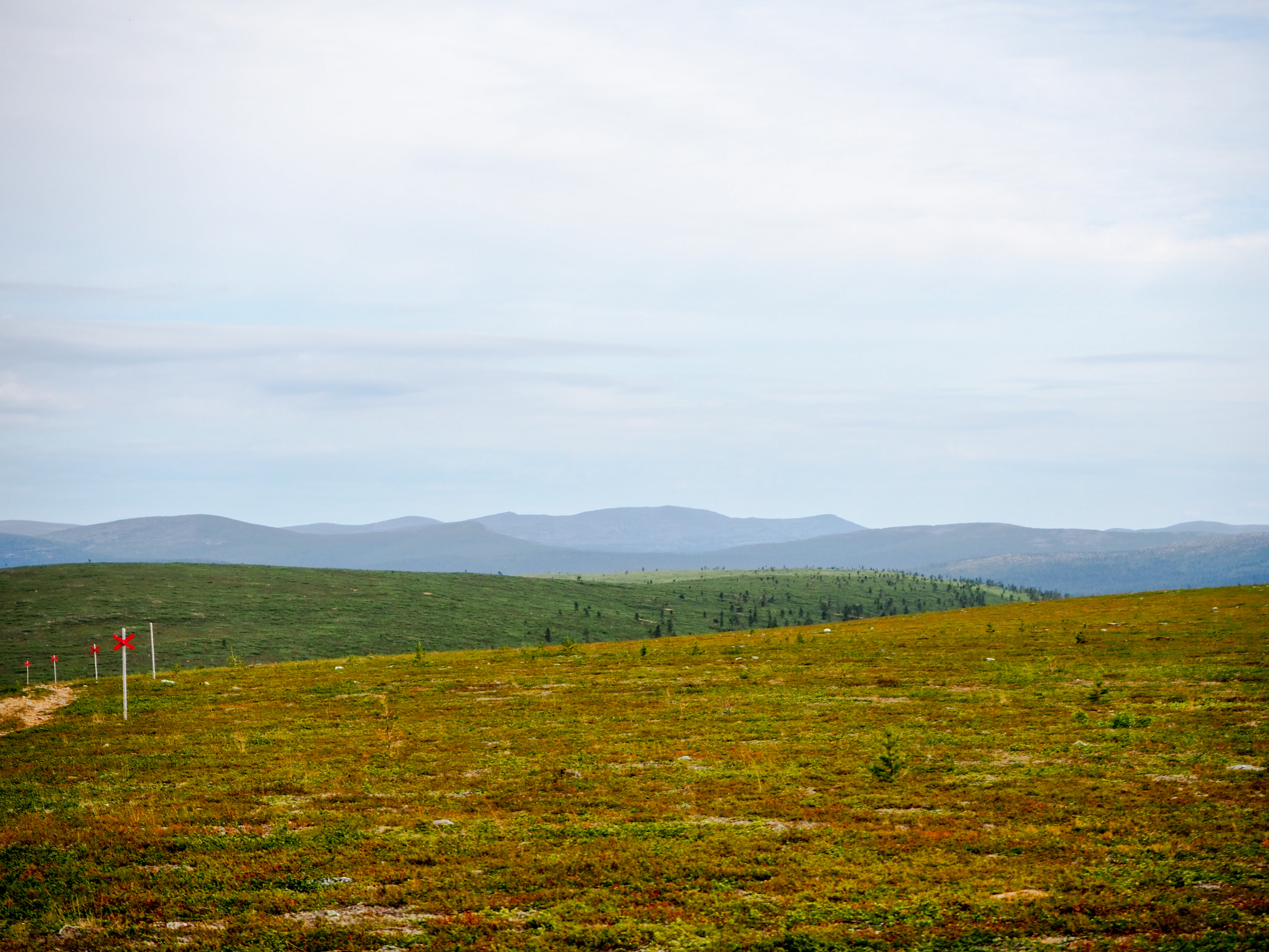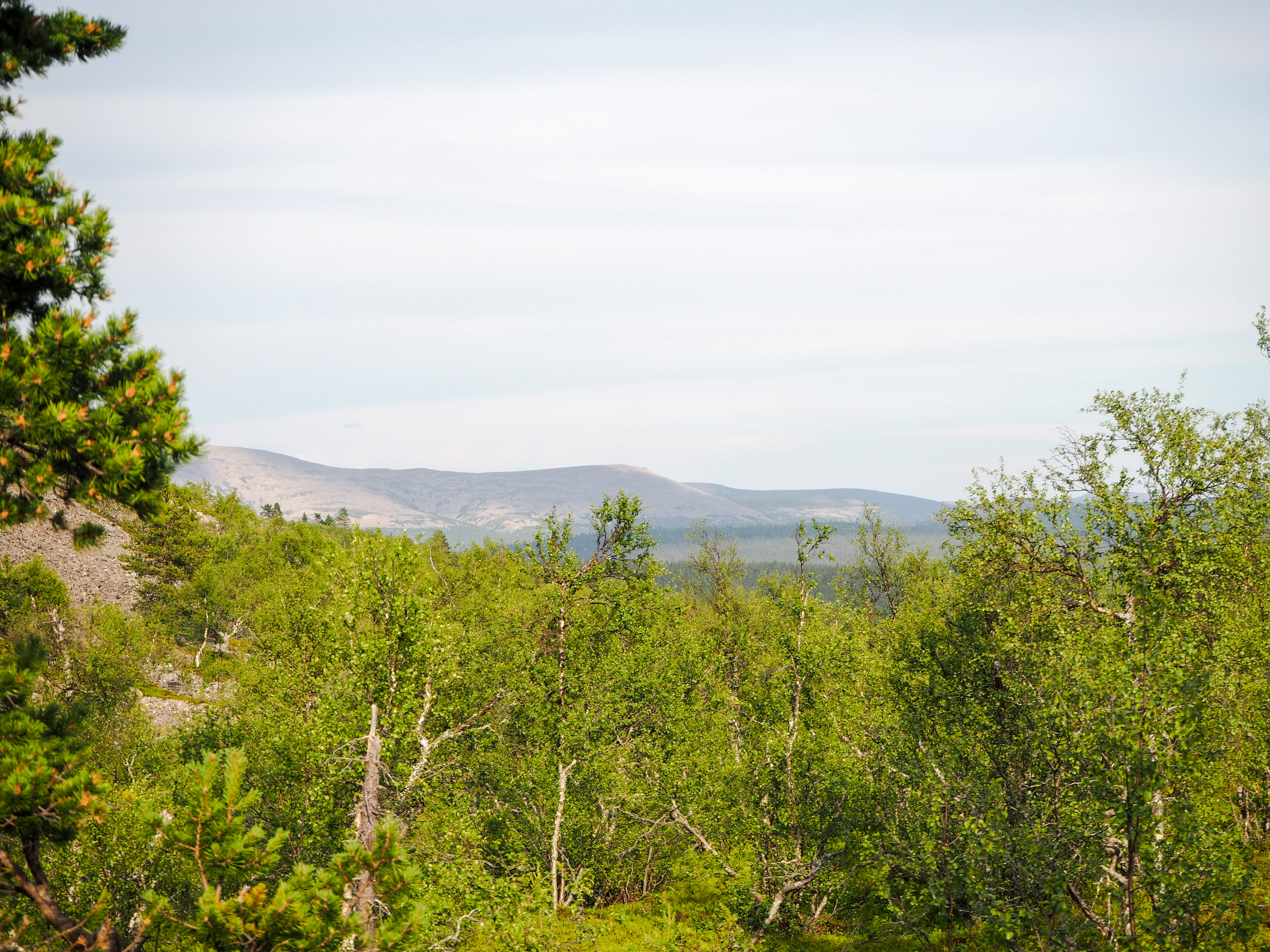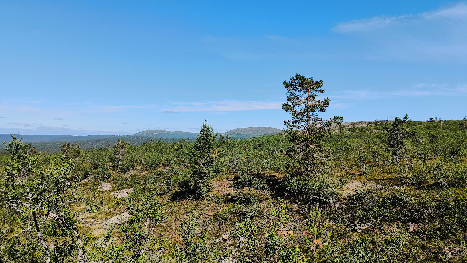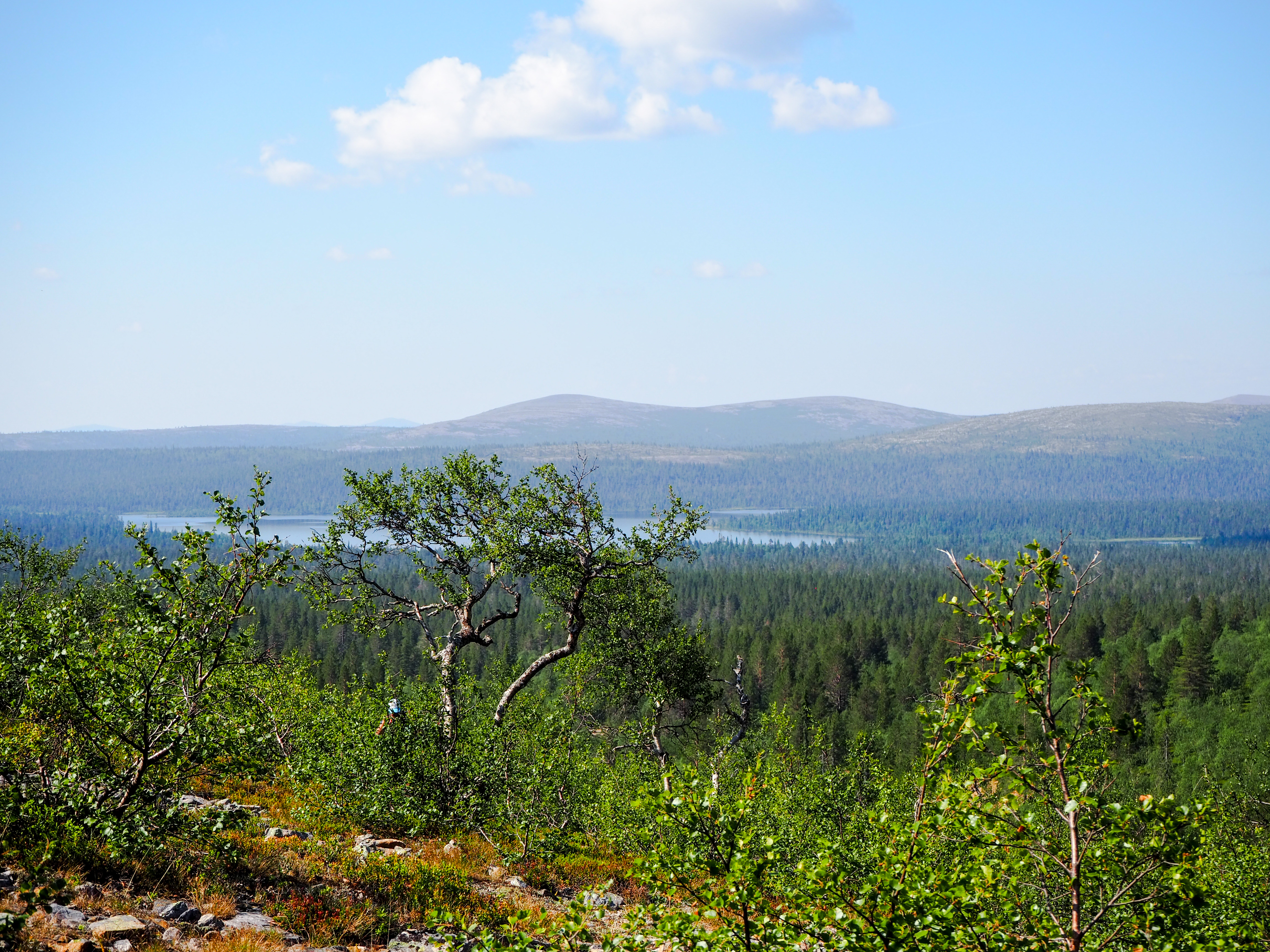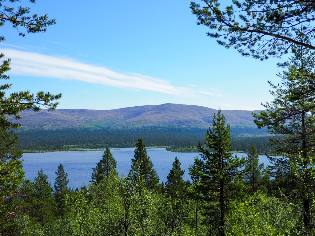 Suuntana oli Lankojärvi, jonne kilometrejä kertyisi taas reippaasti. Nyt kuitenkin ensimmäisenä vuorossa oli se syrjähyppy pois reitiltä, jonka olimme ukkosrintaman vuoksi skipanneet Luirojärvelle saapuessamme. Nyt sää oli kaunis ja näkymät Sokostille selkeät, joten otimme kompassiin suunnaksi Luusuanvaaran pohjoisenpuoleisen pienen tunturin laen, jonne ei mene polun polkua. Tunturin rinteet ovat havumetsäistä maastoa, mutta aivan tunturin laki on vähäpuustoisempaa, lähes avonaista lakea ja sieltä aukeaa upea näkymä Sokostille, jonka edessä sinisenä kimmeltää kaunis Luirojärvi. Huipulla pidimme lyhyen juomatauon, jonka jälkeen matka jatkui kohti Lankojärveä. Koukkauksestamme meille tuli ehkä kilometrin verran lisämatkaa.