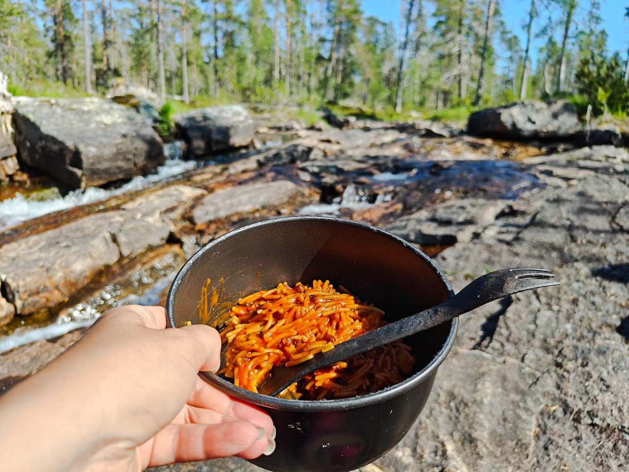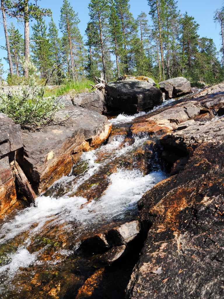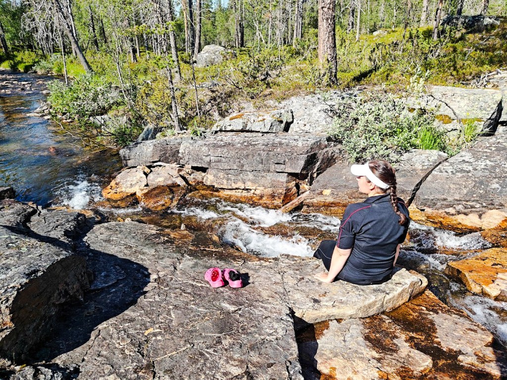 Kaavitsalampien jälkeen pysähdyimme lounaalle paikkaan, jossa polun oikealla puolella puro solisi pitkin kallion uomia ja puron vierelle levittäytyvät kalliot tarjosivat ihanan istuskelupaikan taukoiluun aurinkoisessa säässä ja lounaan valmistukseen. Vesi solisi kalliolta joen uomaan, joka oli muodostanut siihen kohdalle ikään kuin pienen lammen. Alisa ja Lari tietysti ensimmäisenä, ennen kuin annettiin ajatustakaan lounaalle, heittivät vaatteet taas kalliolle ja pulahtivat uimaan. Minä istuin kallion reunalle ja uitin jalkoja solisevassa kylmässä purossa. Taukopaikka oli täydellinen. Valmistimme ja söimme lounaat, täytimme vesivarat ja nautimme tauosta ilman minkäänlaista kiirettä. Jalat saivat kunnon ilmakylvyn ja kuumuus ja kosteus sai haihtua vaelluskengistä kaikessa rauhassa.