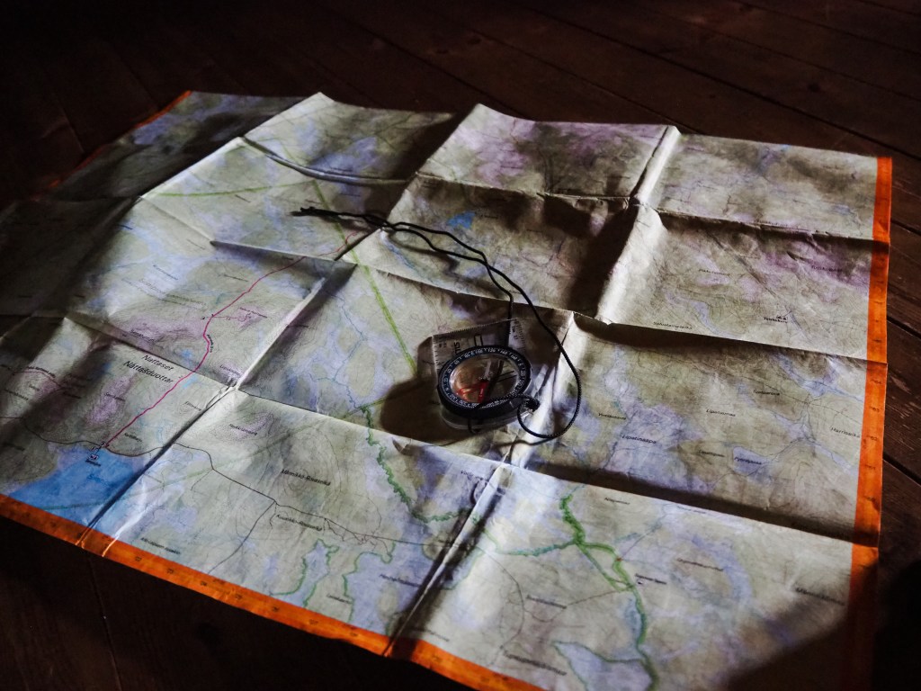 Kiilopäällä kevyessä tuulessa tuulettelimme hetken hien jo kastelemia paidan selkämyksiä, tankkasimme vettä ja jatkoimme matkaa. Oli aika poiketa polulta ja kaivaa kartta ja kompassi esille. Emme palailleet takaisin alkuperäiselle polulle Kiilopäälle johtavaa polkua pitkin, mitä olimme ylös kavunneet, vaan otimme kompassilla suoran suunnan kohti Niilanpään päivätupaa, mihin meidän oli tarkoitus seuraavaksi suunnata lounaalle. Kiilopään etelänpuoleista rinnettä oli helppo tallustella alaspäin, koska se ei ollut turhan jyrkkä ja päästyämme rinteen alas, suunnistimme vielä läpi tunturikoivikkoisen metsikön ja lopulta tulimme ristiviitoitetulle sorapolulle, joka vie Suomen Latu Kiilopäältä Niilanpään päivätuvan ohi kohti Rautulammen tupaa. Tätä sorapolkua me seurailimme loput muutaman sata metriä Niilanpään päivätuvalle.