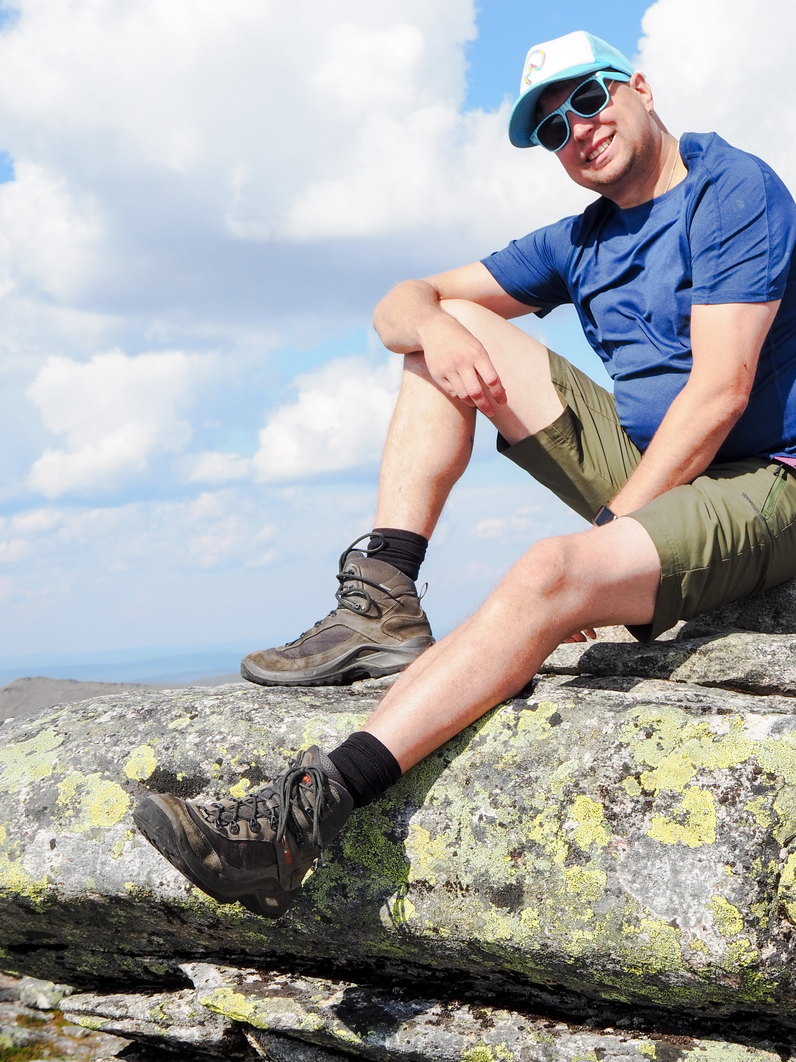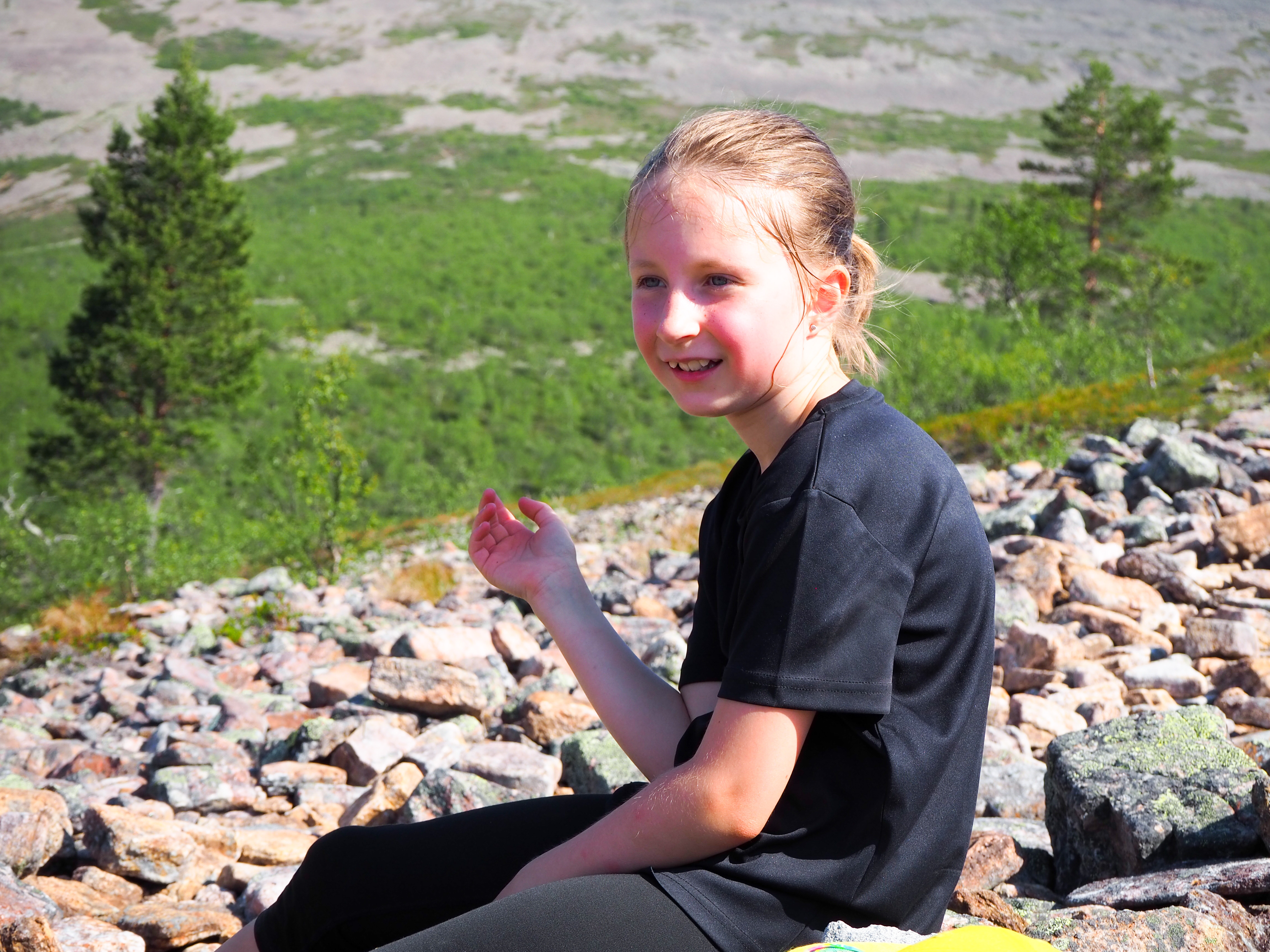 Vaelluksen ensimmäisenä päivänä sää oli aurinkoinen ja kuuma. Aurinko paistoi siniseltä taivaalta ja lämpömittari näytti +29 astetta, vaikka ei oltu vielä edes keskipäivässä. Vaelluksemme osui kesän kuumimpaan helleaaltoon. Hiki valui selkää pitkin ihan pelkästään paikallaan seisoessa. Tällä kertaa ei siis tarvinnut vetää vaellushousua ja takkia päälle, vaan matkaan sai lähteä hyvinkin kevyessä varustuksessa. Olen kuljettanut legginsejä mukanani vaelluksesta toiseen rinkassani siinä toivossa, että joskus meille kohdalle osuvat ne helteiset kelit, jolloin vaellushousut ovat liikaa, mutta siellä ne rinkassa ovat visusti pysyneet kaikki vaelluksemme tähän asti. Rinkassani kulkevista legginseistä on jo kerennyt perheemme kesken tulemaan pienimuotoinen vitsikin, että siinä se on vähiten työllistetty vaellustarvikkeemme, oikea vapaamatkustaja, koska tähän asti meille on kyllä osaksemme osunut ennemminkin hyytävät säät, erämaatuulet, saderintamat, ukkoset ja ennemminkin rinkasta on saanut kaivaa vain lämmintä ja sadevaatetta päälle. Mutta nytpä minä vetäisinkin legginsit aamutuimaan jalkaani ja lämpimämmät vaatteet saivat etsiä itselleen mukavan tilan rinkasta.