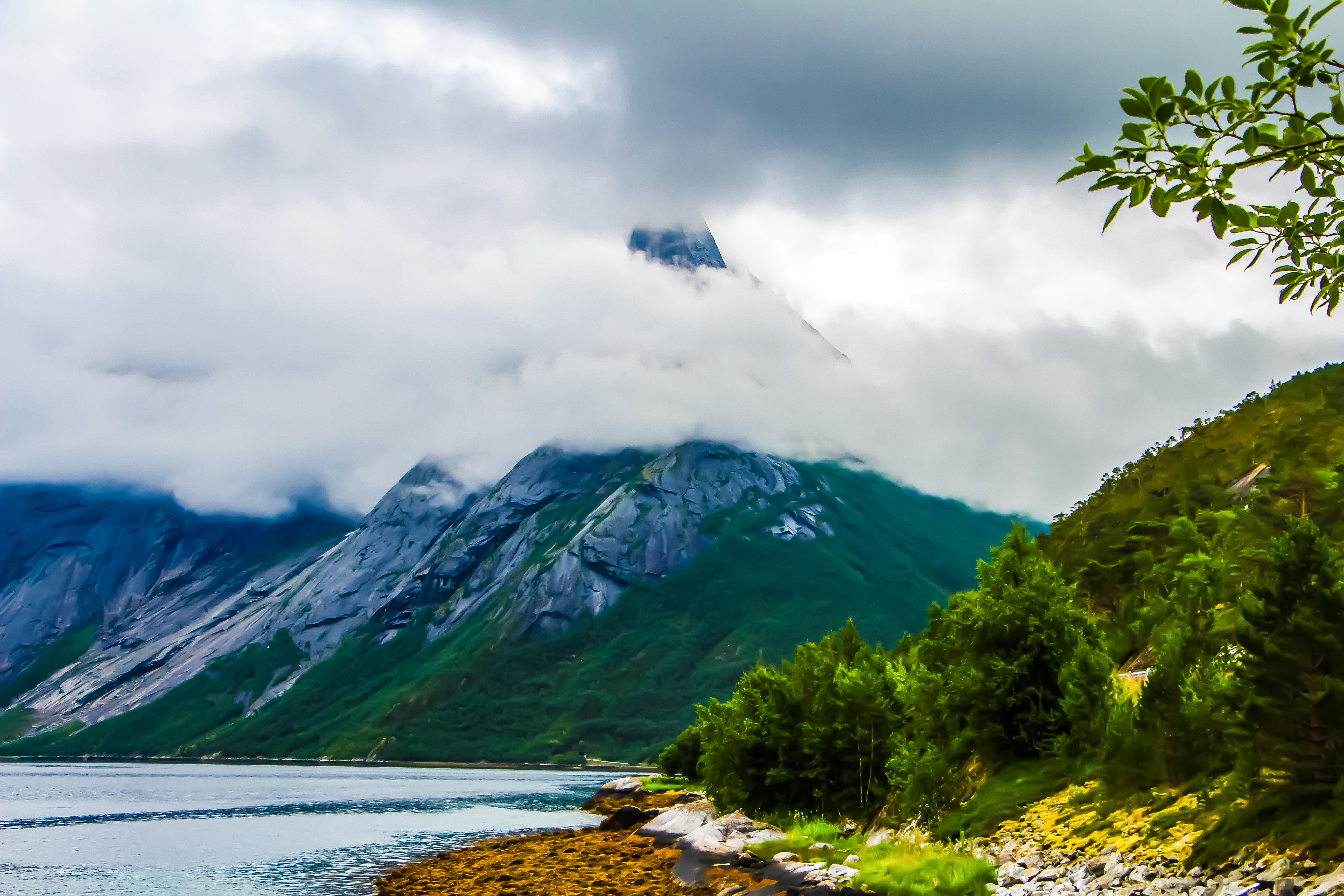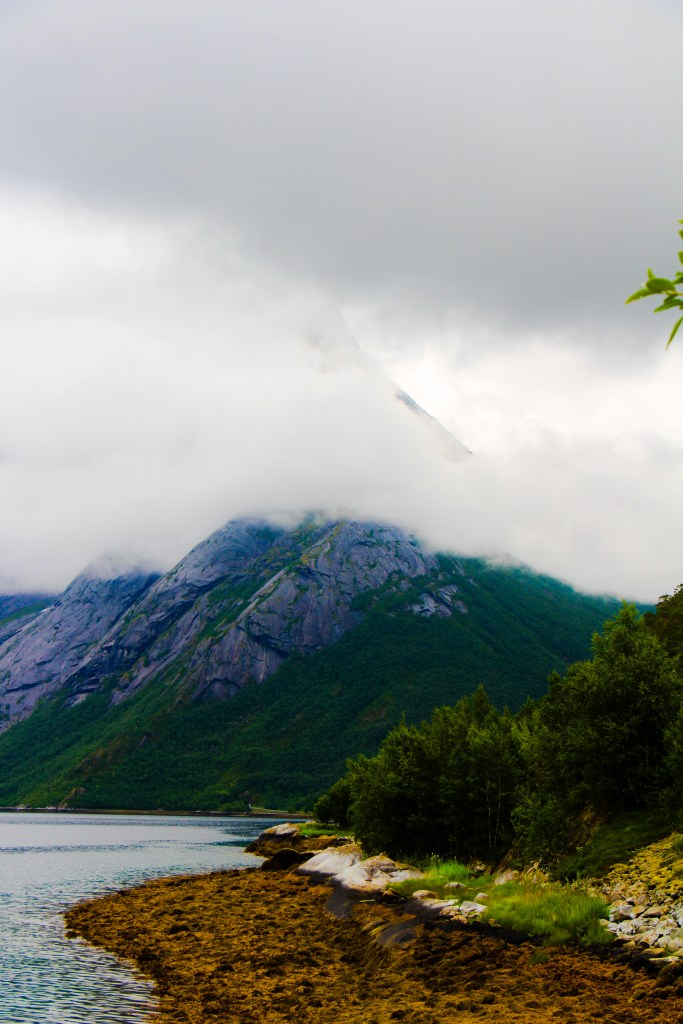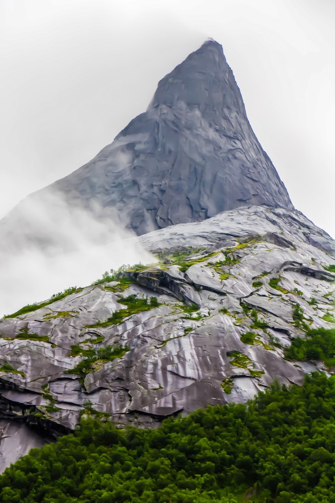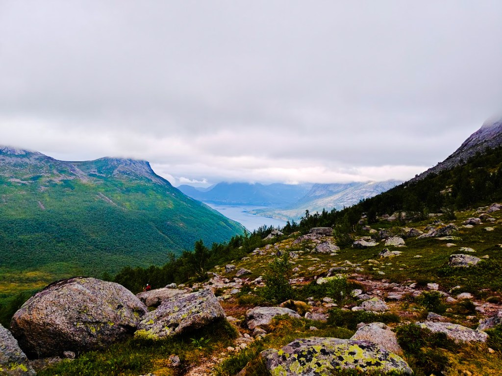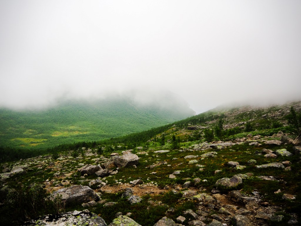 Norjalainen puistoalueiden hoitaja oli osannut kertoa meille, että viikkoa aiemmin oli ollut upean aurinkoiset säät ja maisemat olivat auenneet kauaksi, mutta nyt matalapaine oli jumittanut paksut, raskaat pilvimassat Stetindenin rinteisiin kiinni usean päivän ajaksi. Aurinkoisina päivinä parkkialuekin on kuulemma tuutattu aivan täyteen autoja, niin ettei sekaan meinaa mahtua, mutta nyt tämä valkoisen usvainen päivä takasi ainakin sen, ettei ruuhkaa ollut. Vain pari muuta autoa oli parkkipaikalla meidän lisäksemme, kun olimme lähteneet matkaan, eikä poluilla vastaan tullut kovinkaan montaa kulkijaa. Hieman ennen Svartvatnetin tavoittamista, huipulta alas päin laskeutuivat pari retkeilijää, jotka olivat käyneet jalan Halls fortoppilla ja he kertoivat, että siellä näkymät pilvien yläpuolelle olivat olleet maagisen hienot. Ympäröivien vuorten huiput kohosivat pilvien yläpuolelle ja aurinko paistoi.