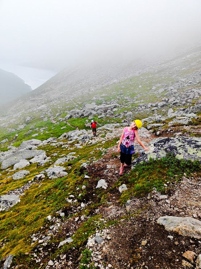 Evästauon jälkeen lähdimme takaisin alas, mutta laskeutuminen ei myöskään ollut helppoa ja polvet olivat kovilla jyrkkiä rinteitä alas tullessa. Muutoinkin olen ehdottomasti enempi nousuihminen. Nousuun meillä meni aikaa 2 tuntia ja 15 minuuttia. Svartvatnetilla pidimme noin puolen tunnin tauon ja alastuloon aikaa kului puolestaan tunti ja 45 minuuttia. Se kertoo jotain siitä, että ei sieltä ihan juosten alaskaan tultu, vaan jyrkillä, paikoin märillä poluilla piti katsoa tarkkaan, mihin astuu, ettei lähde askel alta.
